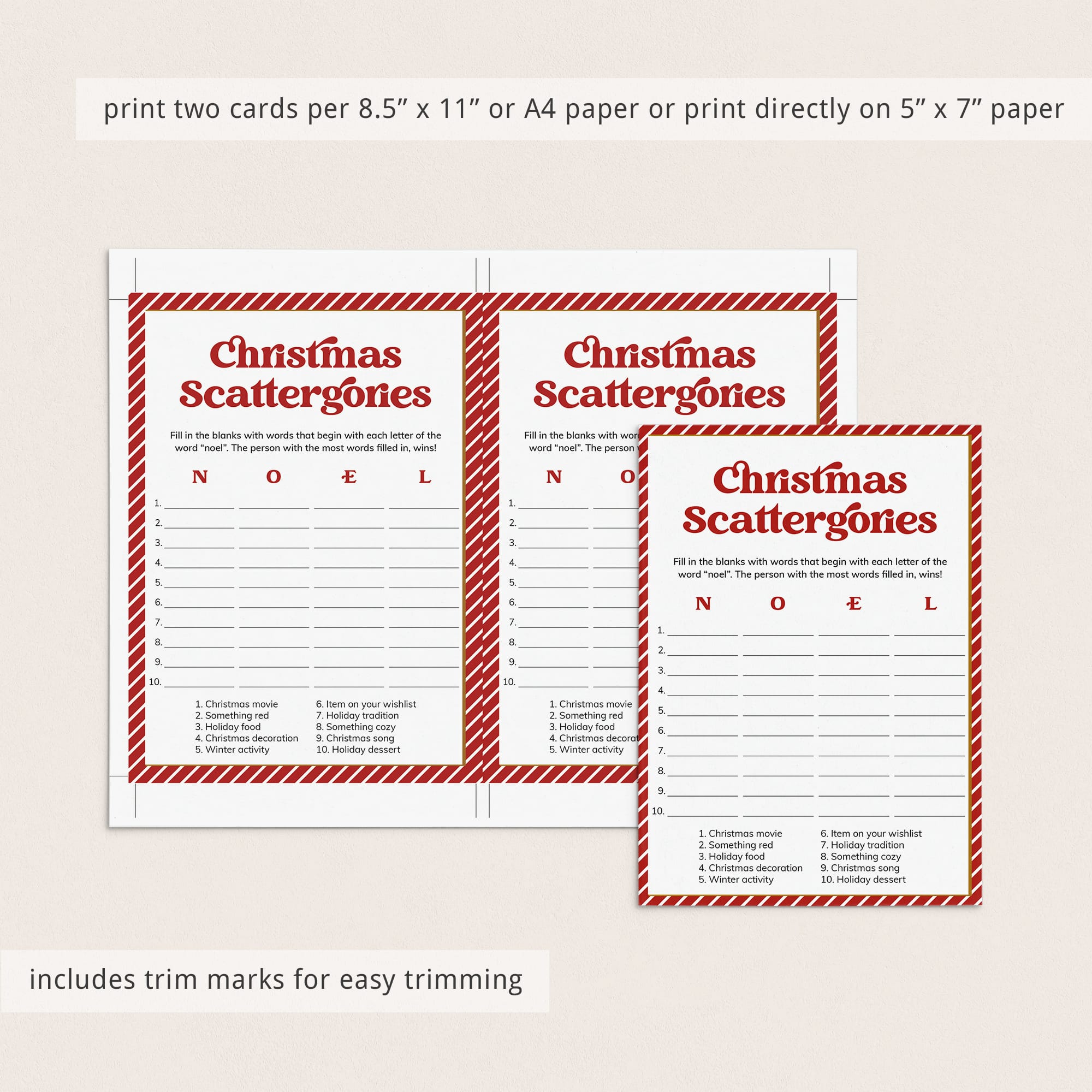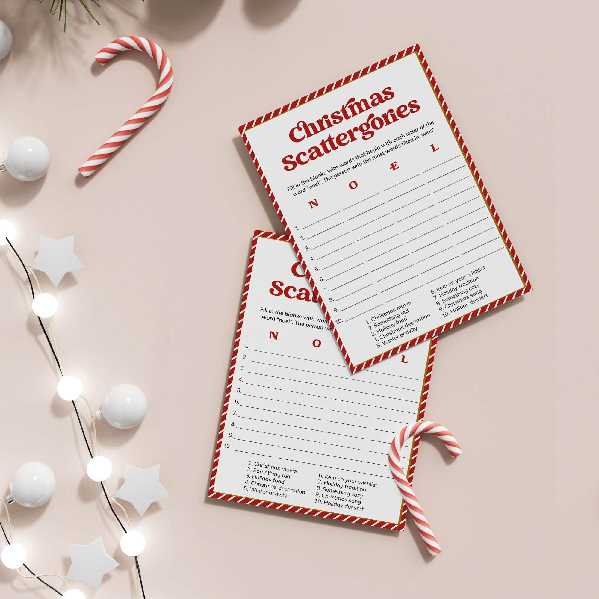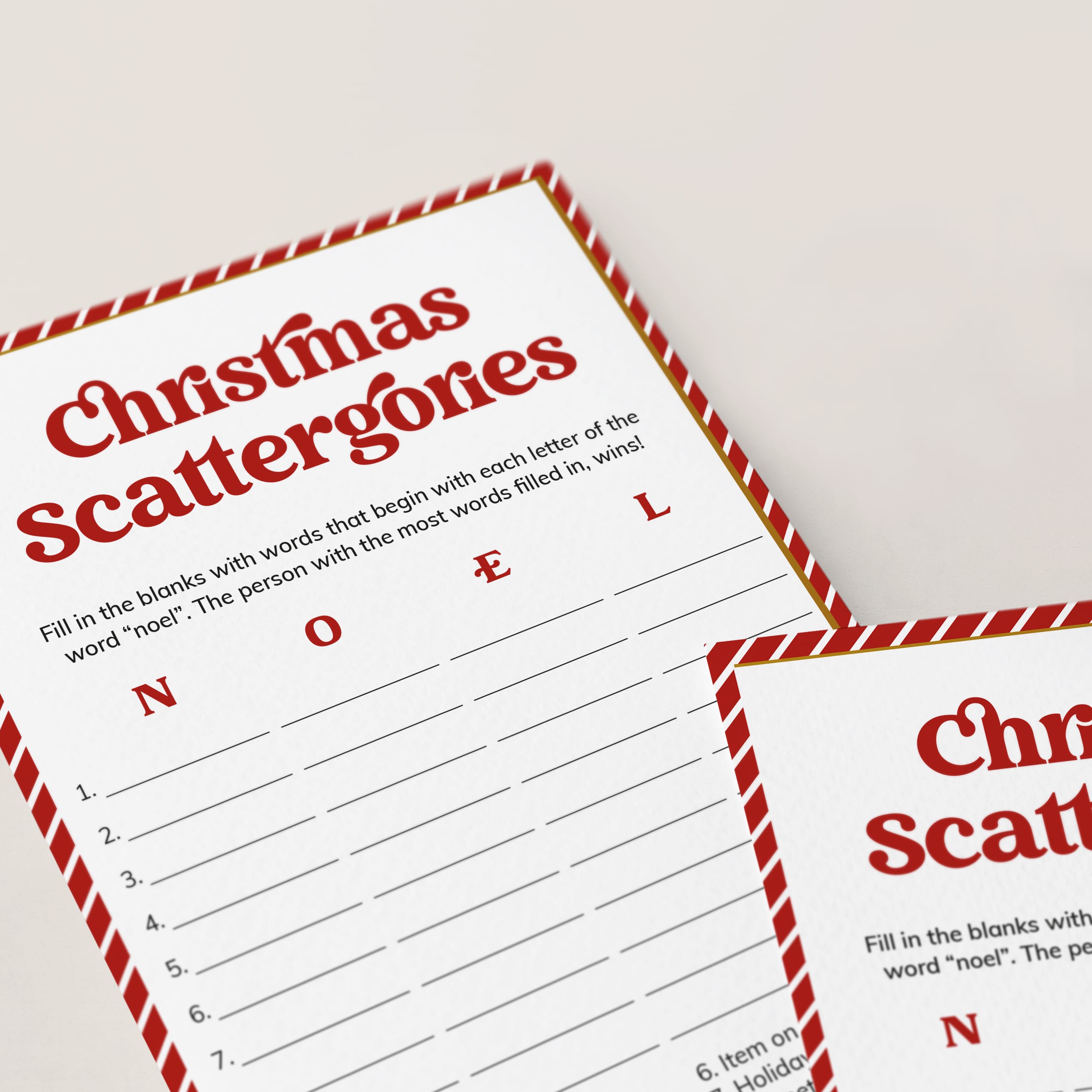 How many words can you fill in with the letters "N", "O", "E" and "L"? Play Christmas Scattergories with family and friends with this classic game card designed with a nostalgic red & white striped border and a bold vintage font.