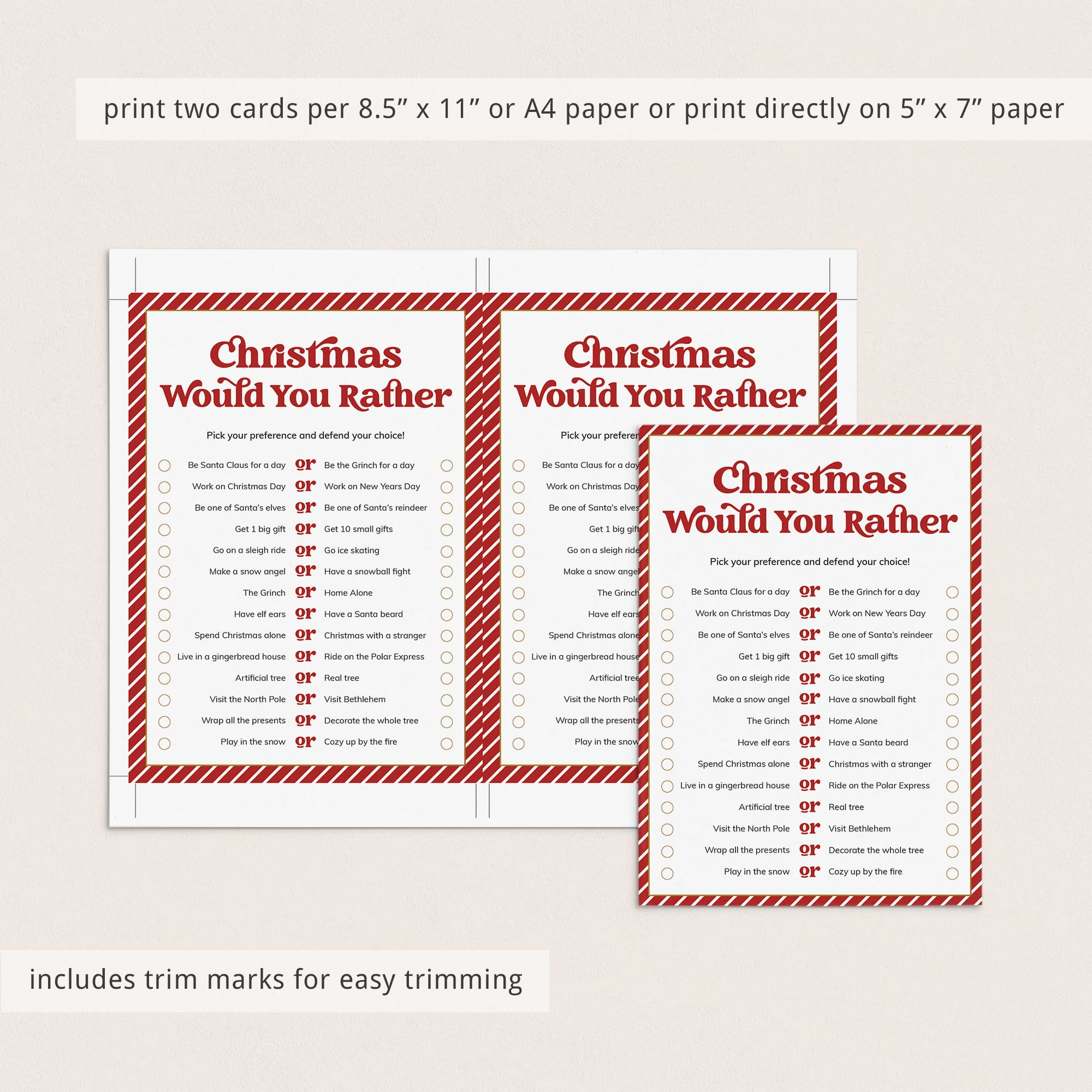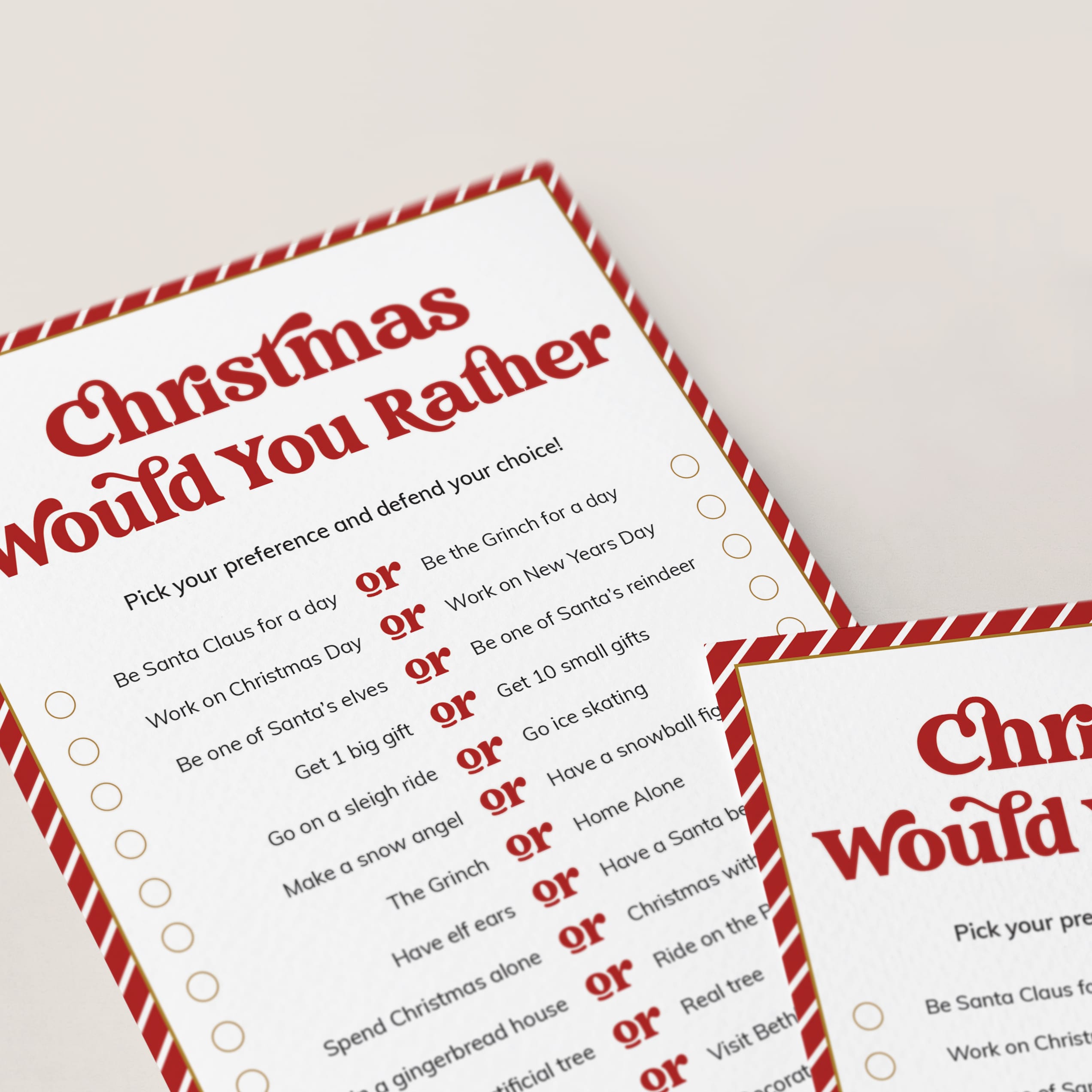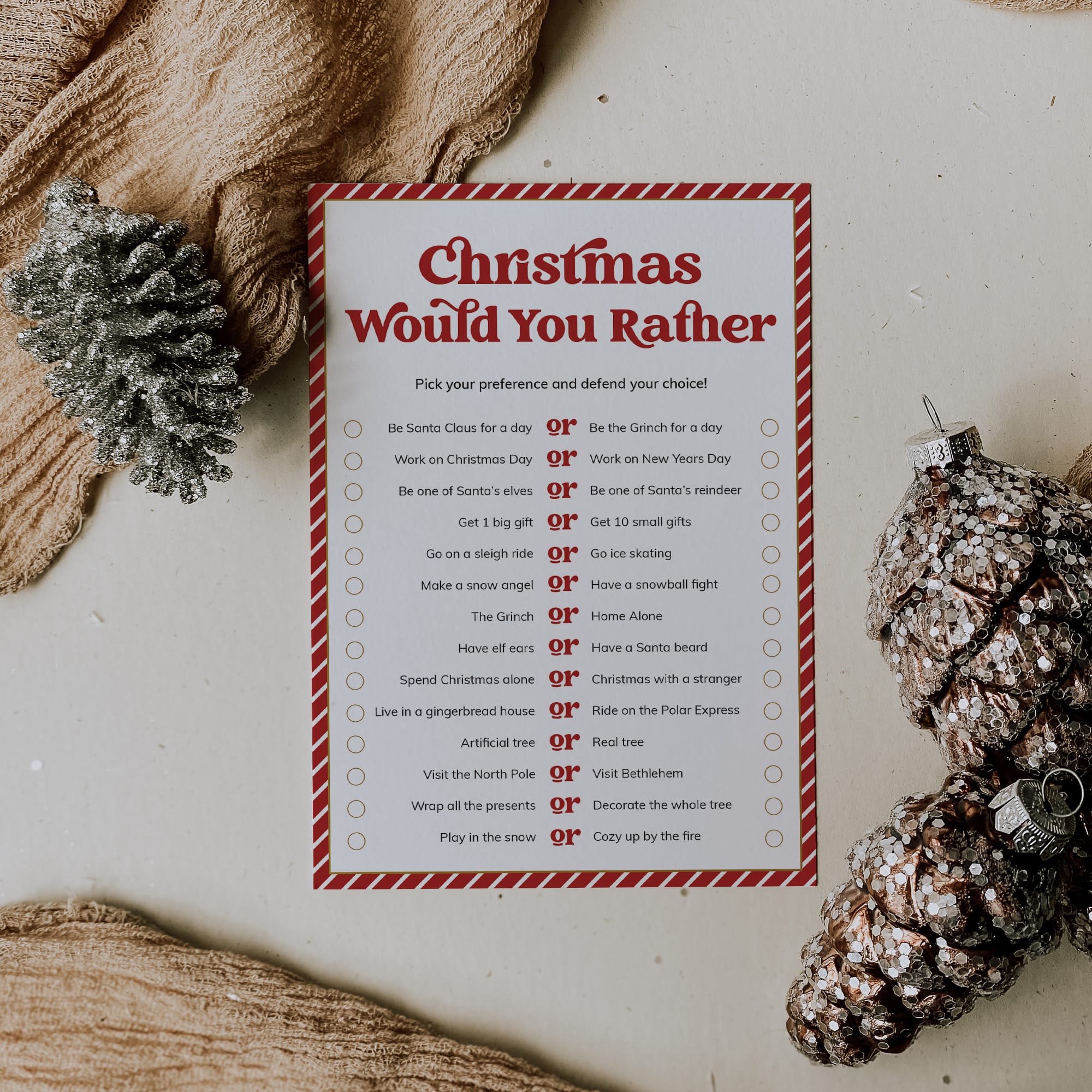 designed with a nostalgic red & white striped border and a bold vintage font, has 14 Would You Rather questions. Have your guests pick their preferences and defend their choice. Would you rather play in the snow or cozy up by the fire?