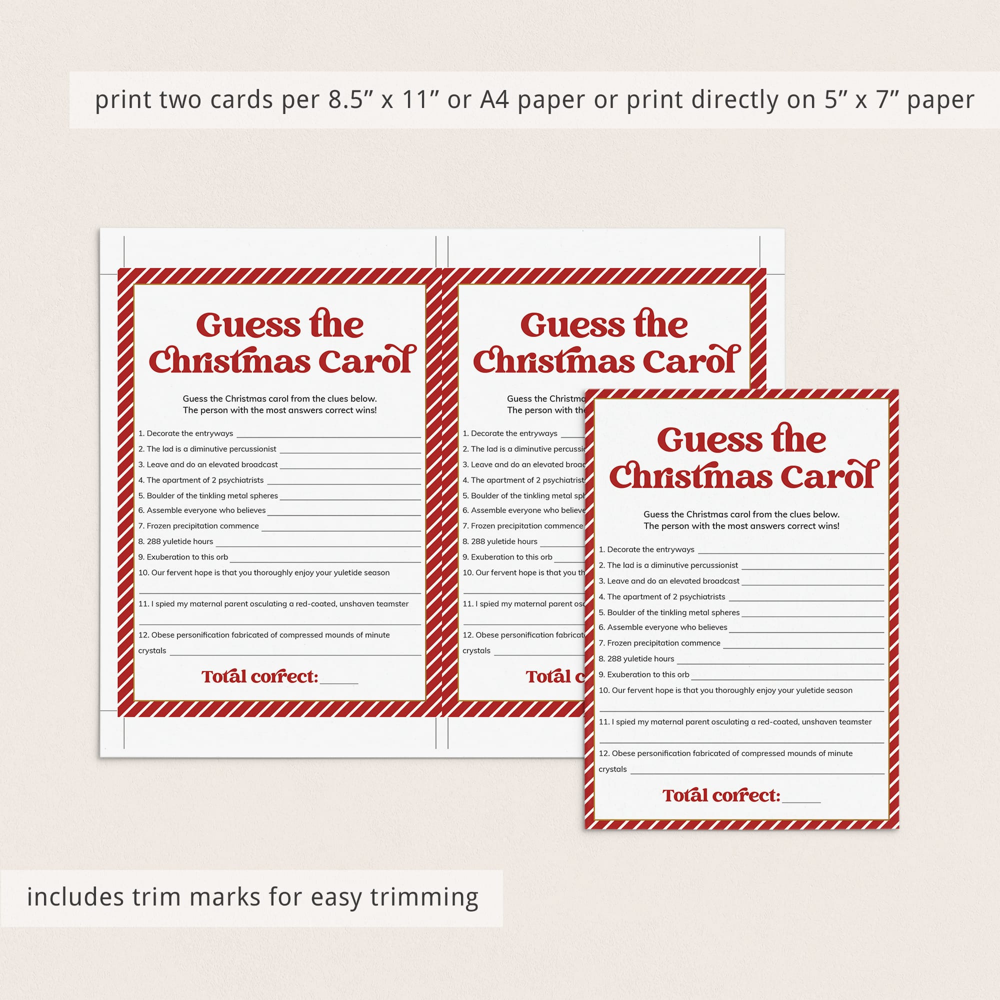 This fun Guess The Christmas Carol Game, designed with a nostalgic red & white striped border and a bold vintage font, will definitely be perfect for all the Christmas parties and get togethers coming up.