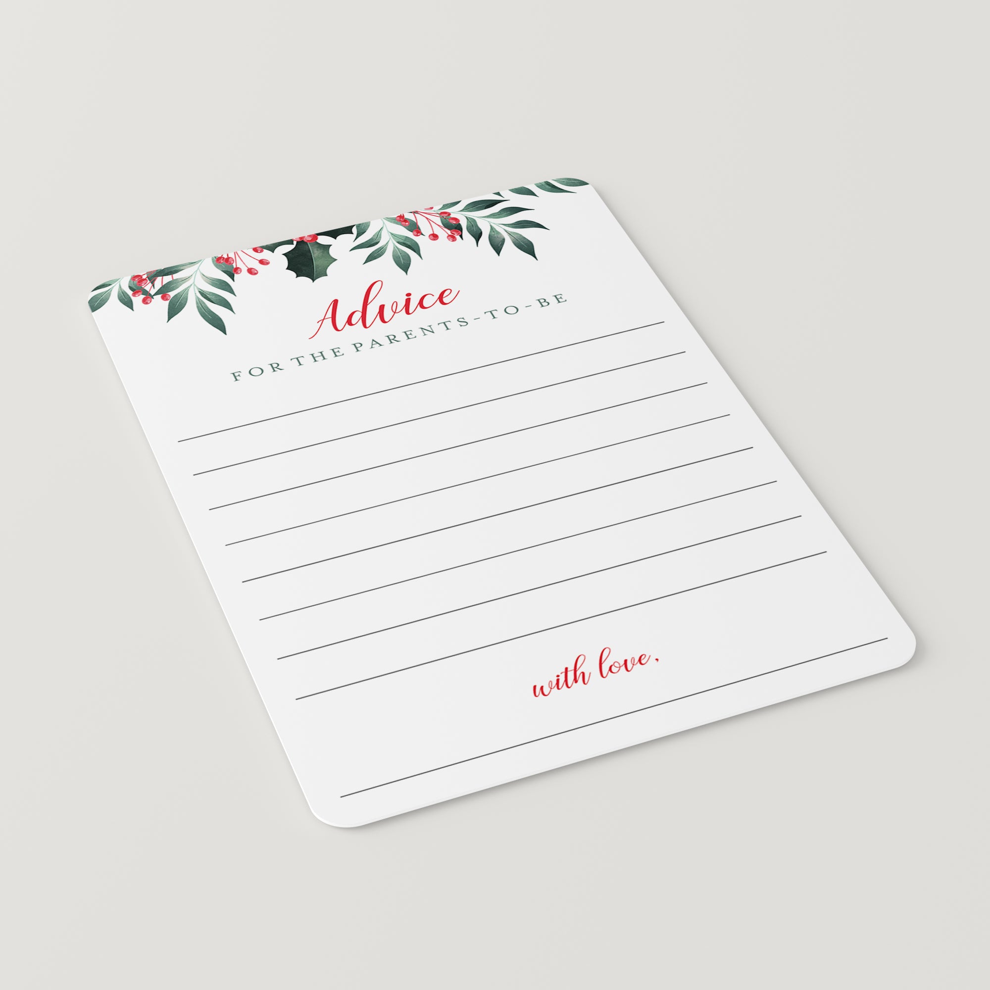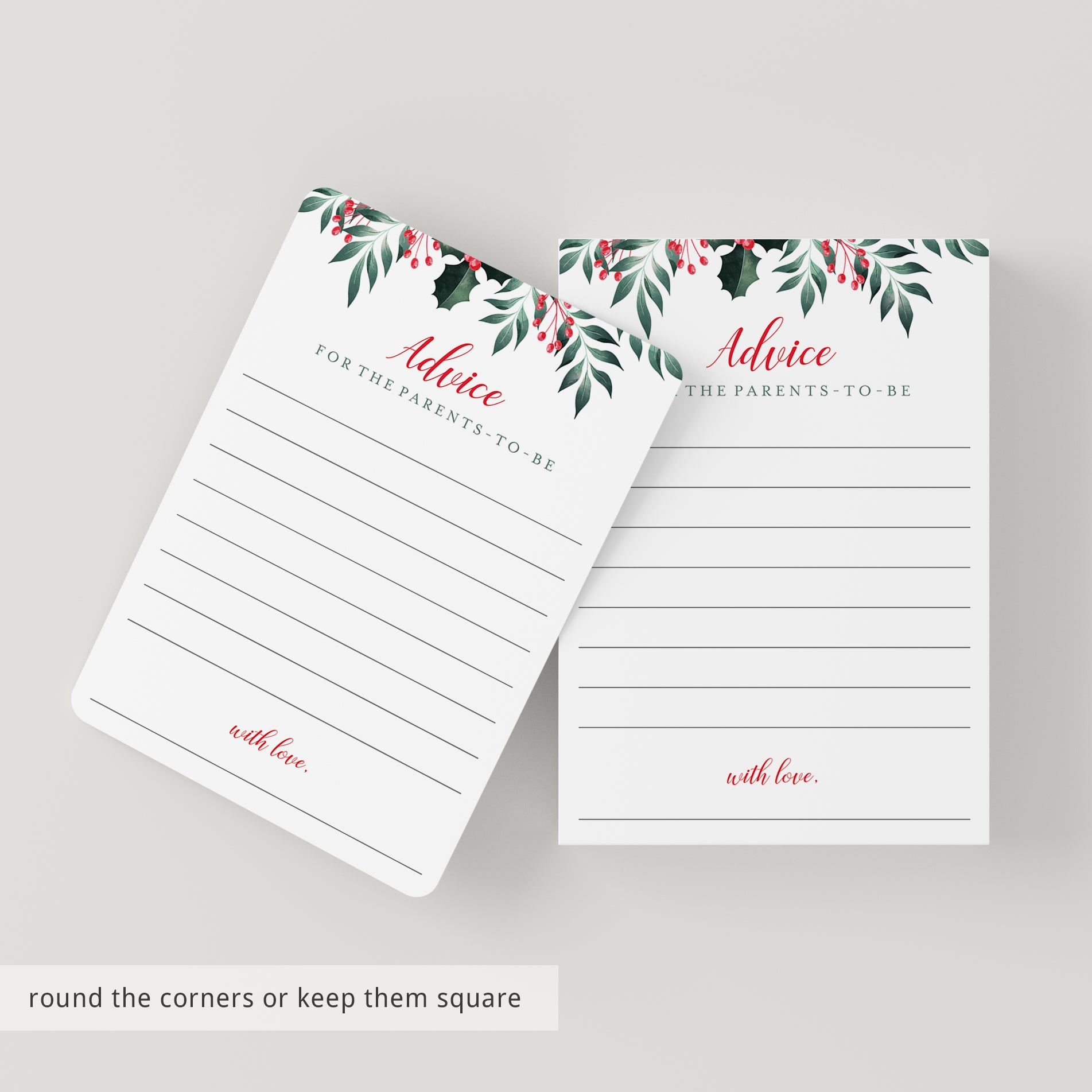Are you hosting a coed baby shower in the holiday season? Create a meaningful keepsake for the new parents with these printable baby shower advice cards with Christmas holly and berries. Let every guest write down their advice for the new parents and collect the cards for the lucky couple. The advice cards are the perfect addition to a Christmas baby shower.