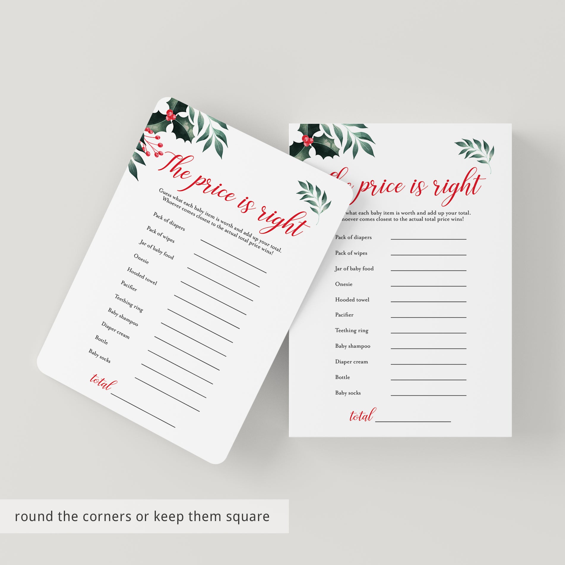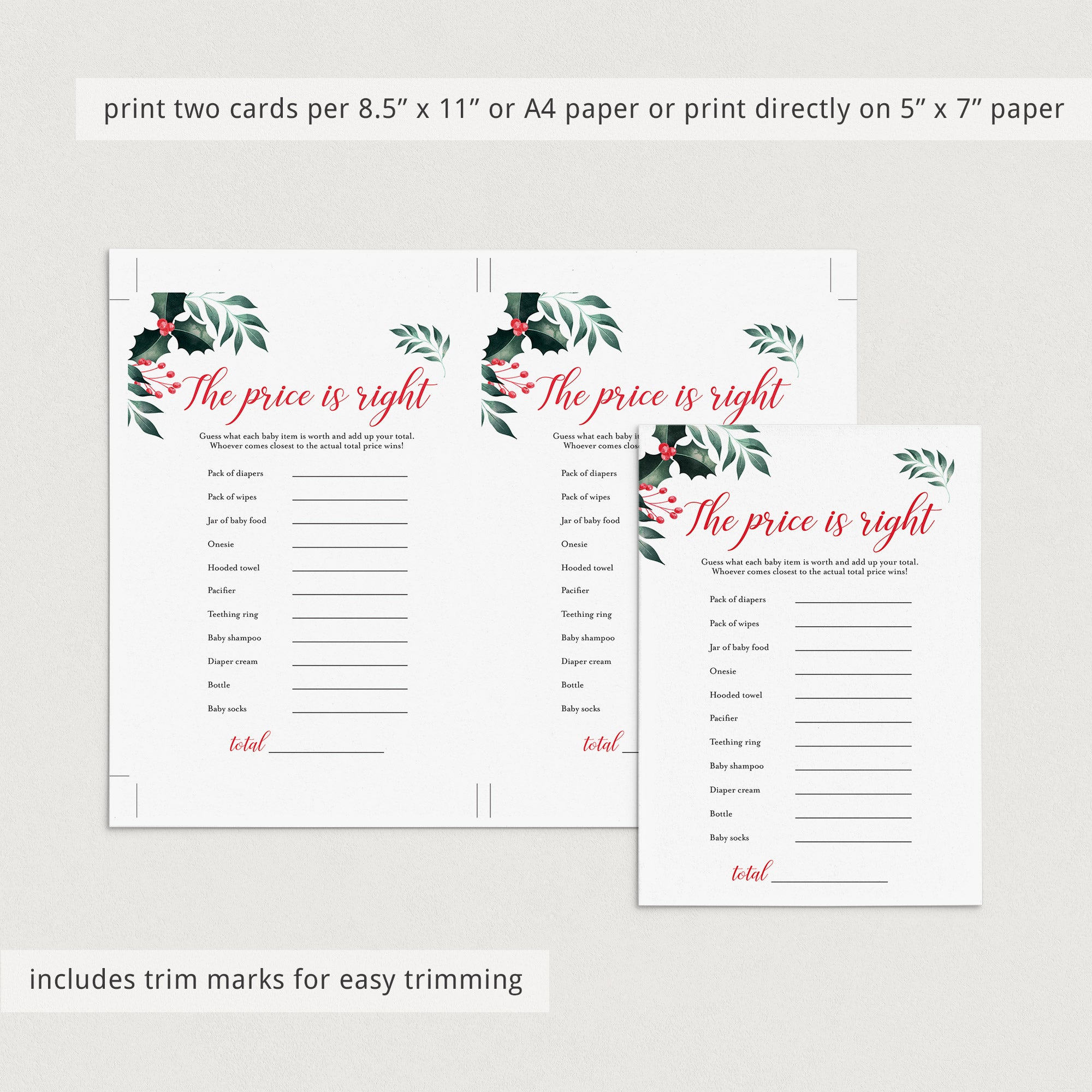 Play The Price is Right at your winter baby shower with these beautiful game cards with watercolor winter holly and berries. The gender neutral cards would be perfect for a holiday theme baby shower and will create an enjoyable moment for all of your guests.