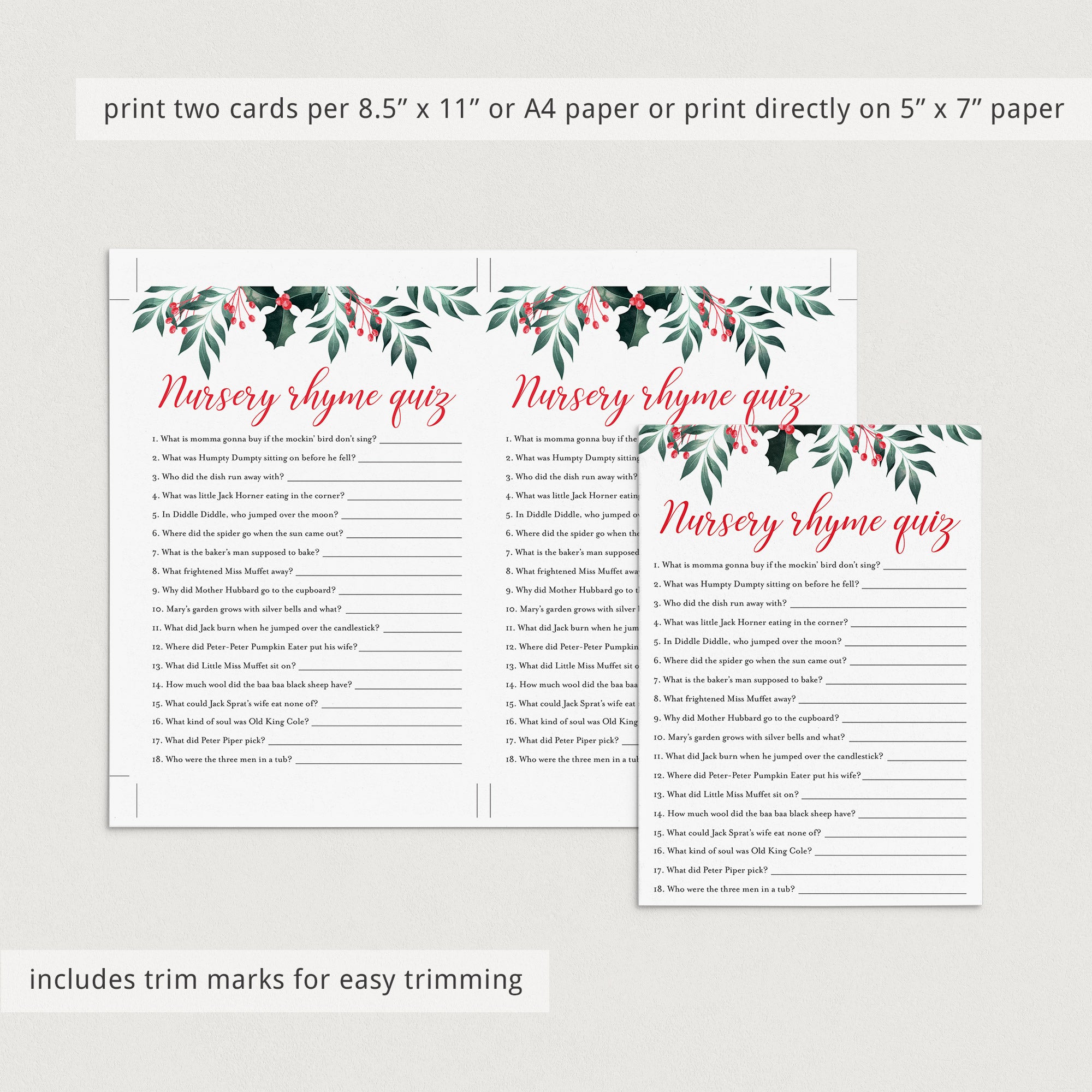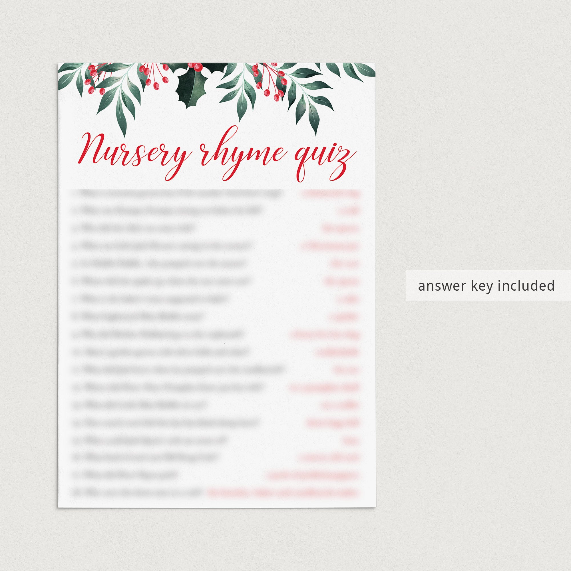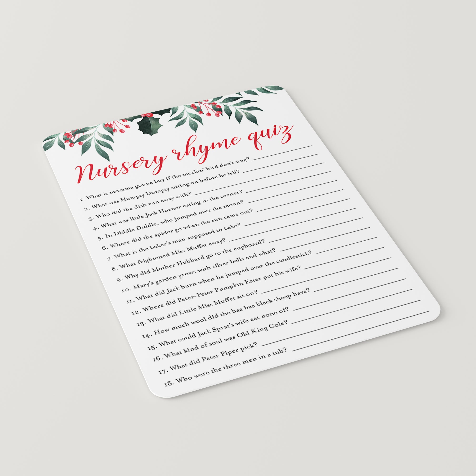Test your guests how well they know their nursery rhymes with this winter holly baby shower Nursery Rhyme Quiz. The game card with watercolor Christmas holly and red berries is the perfect addition to a holiday theme baby shower.