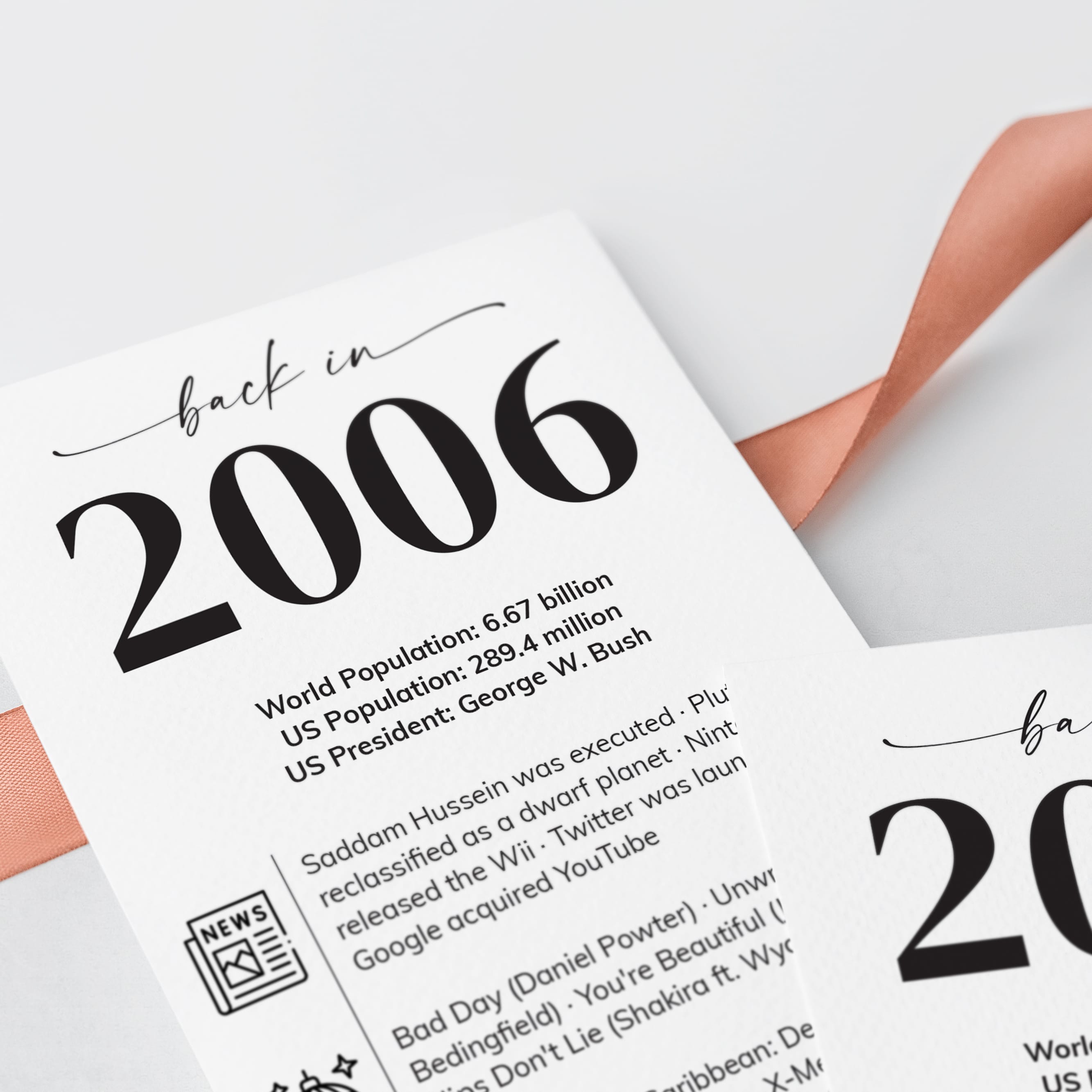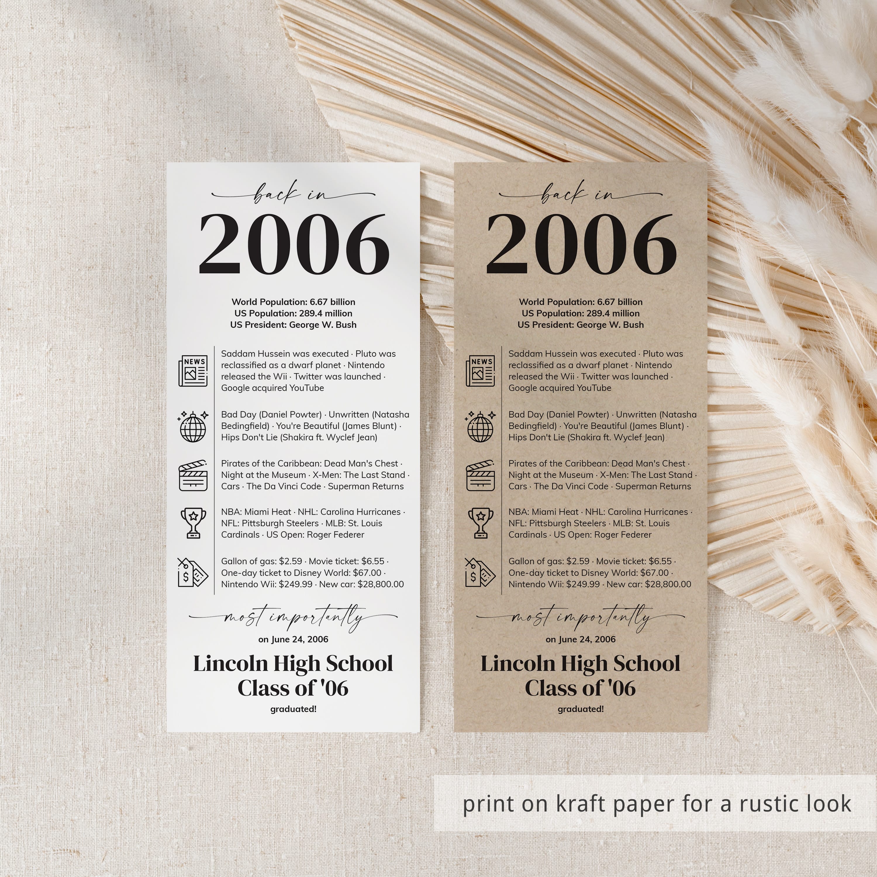 Looking for a stylish and personalized addition to your 20th Class of 2006 Reunion? Our “Back in 2006” table card is the perfect way to celebrate your milestone! This sleek and minimalist card, customized with your school’s name and graduation date, combines entertaining facts from 2006 with clean icons for a fresh, contemporary look.