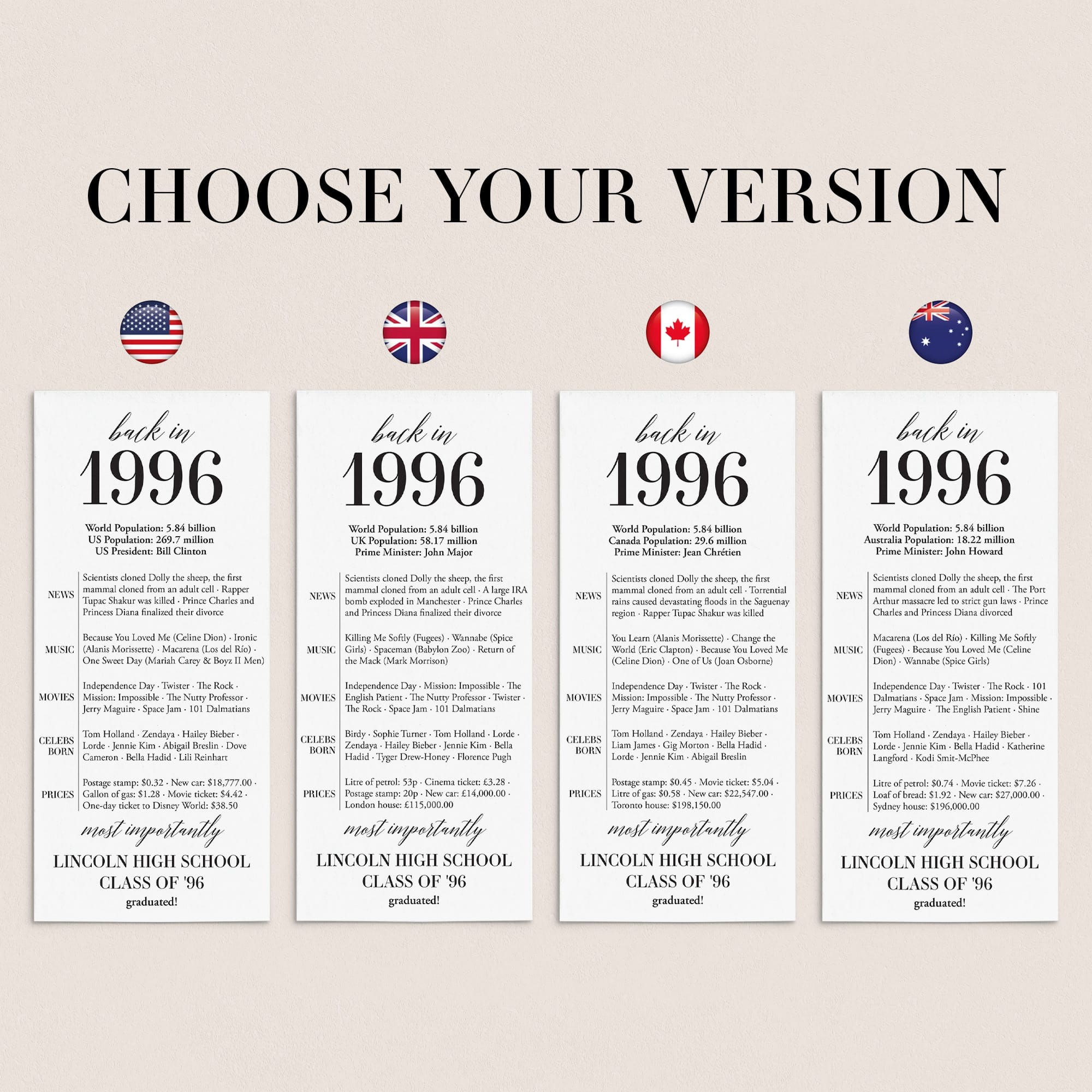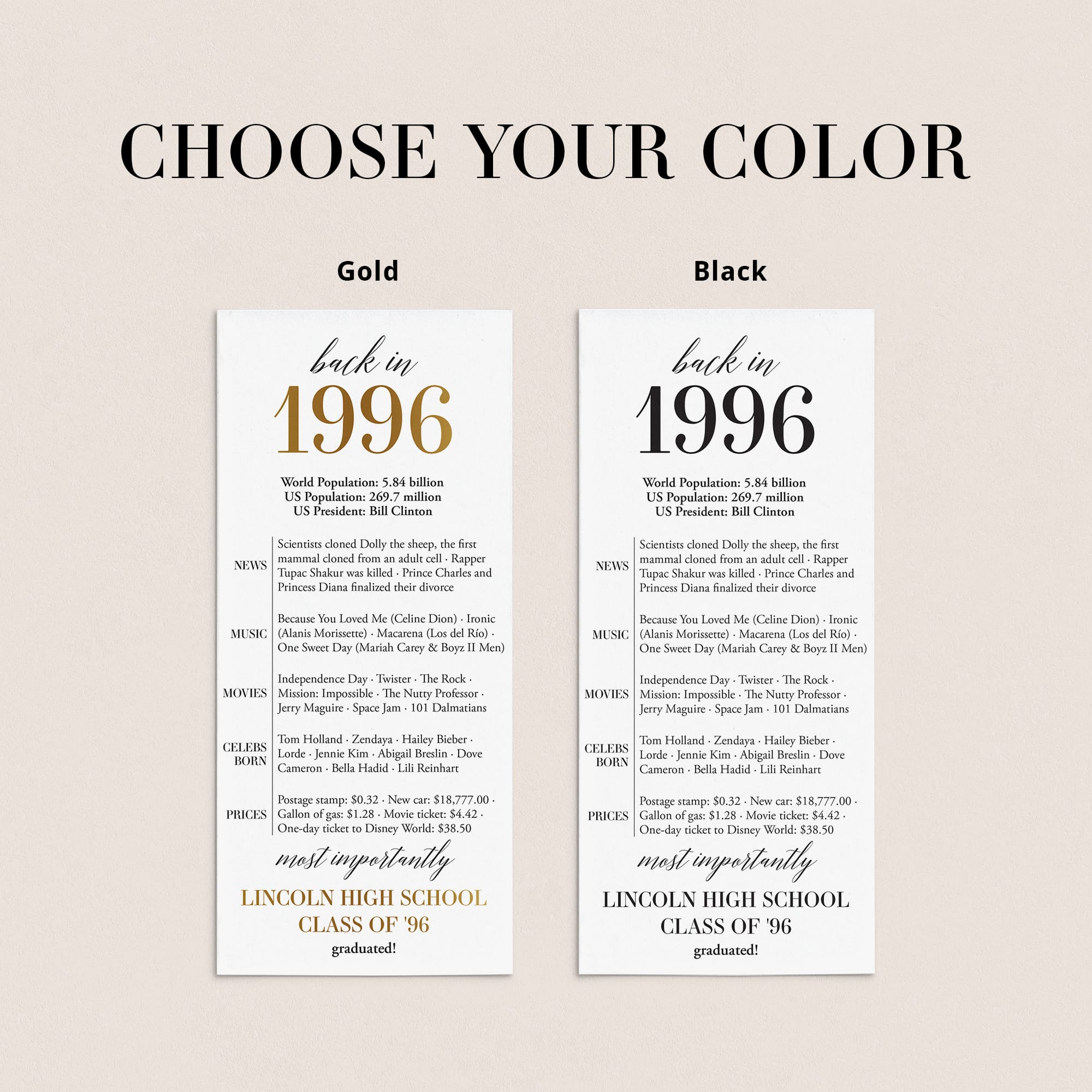 Looking for a stylish and personalized addition to your 30th Class of '86 Reunion? Our “Back in 1996” table card is the perfect way to celebrate your milestone! This sleek and minimalist card, customized with your school’s name, features fascinating facts from 1996.