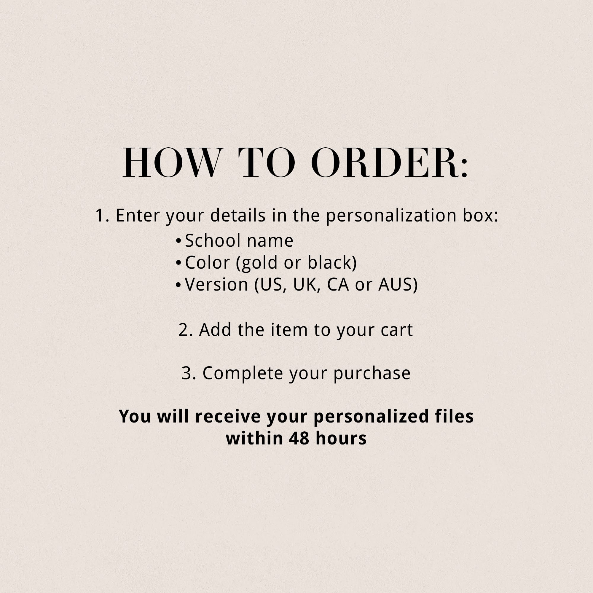 1. Enter the school name, preferred color (black or gold) and version (US, UK, CA or AUS) in the personalization box