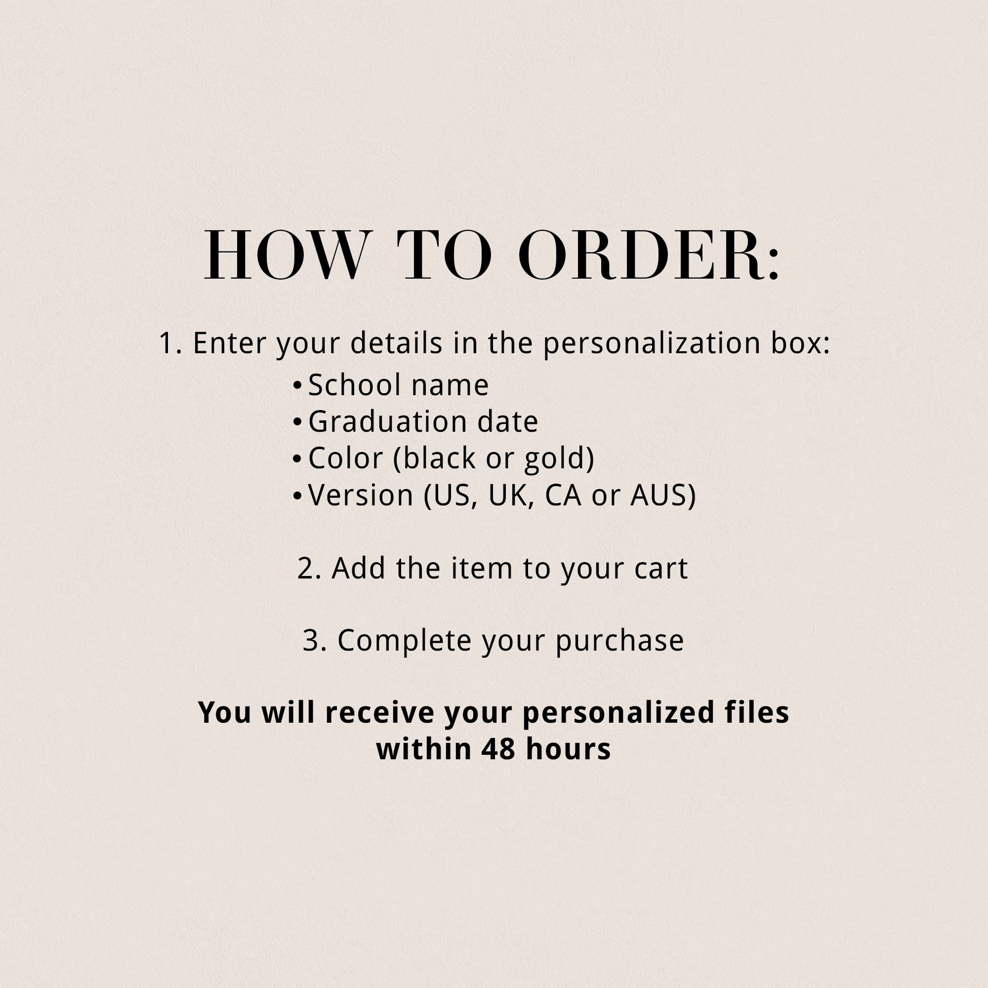 1. Add the school name, graduation date, preferred color (black or gold) and version (US, UK, CA or AUS) in the personalization box