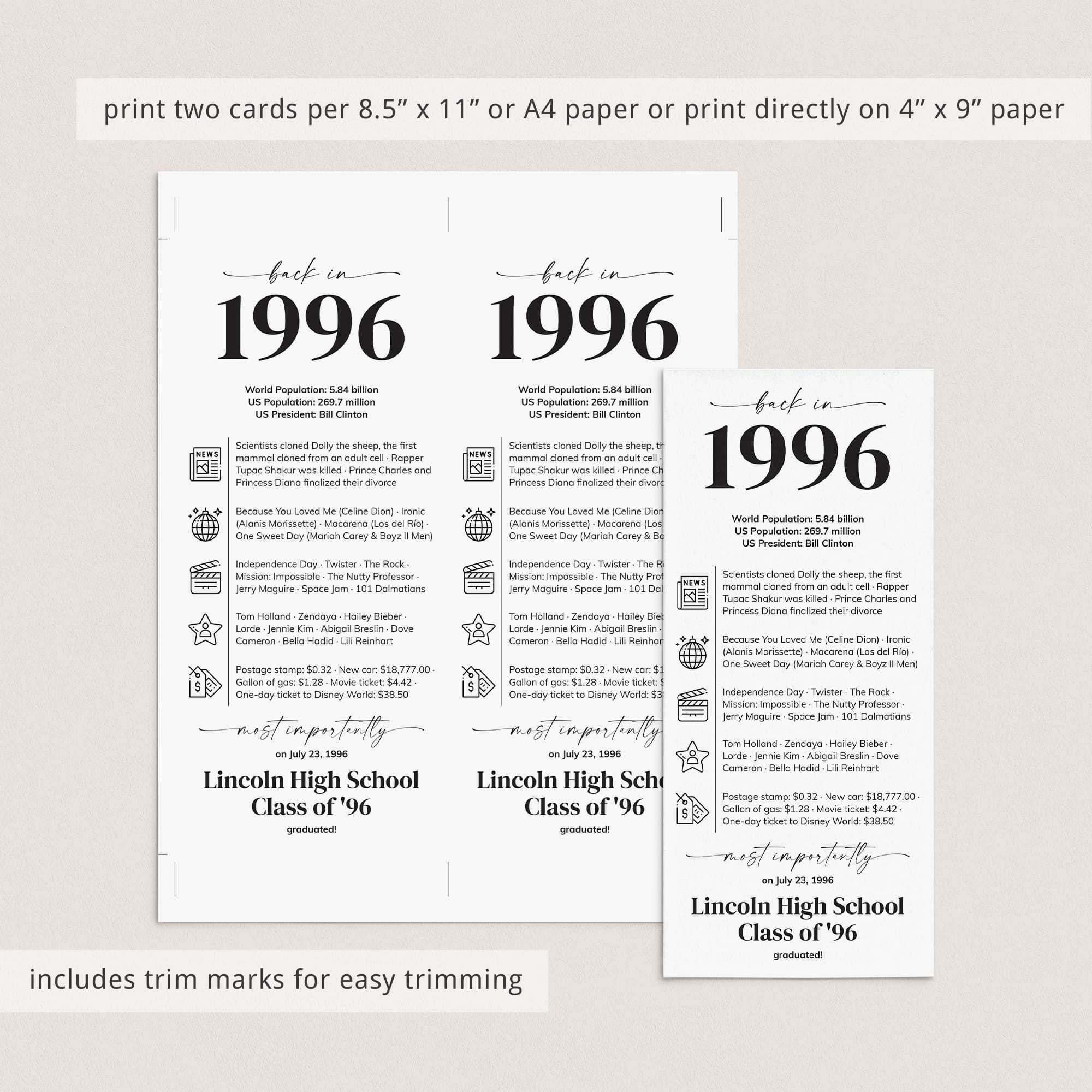 Looking for a stylish and personalized addition to your 30th Class of '96 Reunion? Our “Back in 1996” table card is the perfect way to celebrate your milestone! This sleek and minimalist card, customized with your school’s name and graduation date, combines entertaining facts from 1996 with clean icons for a fresh, contemporary look.