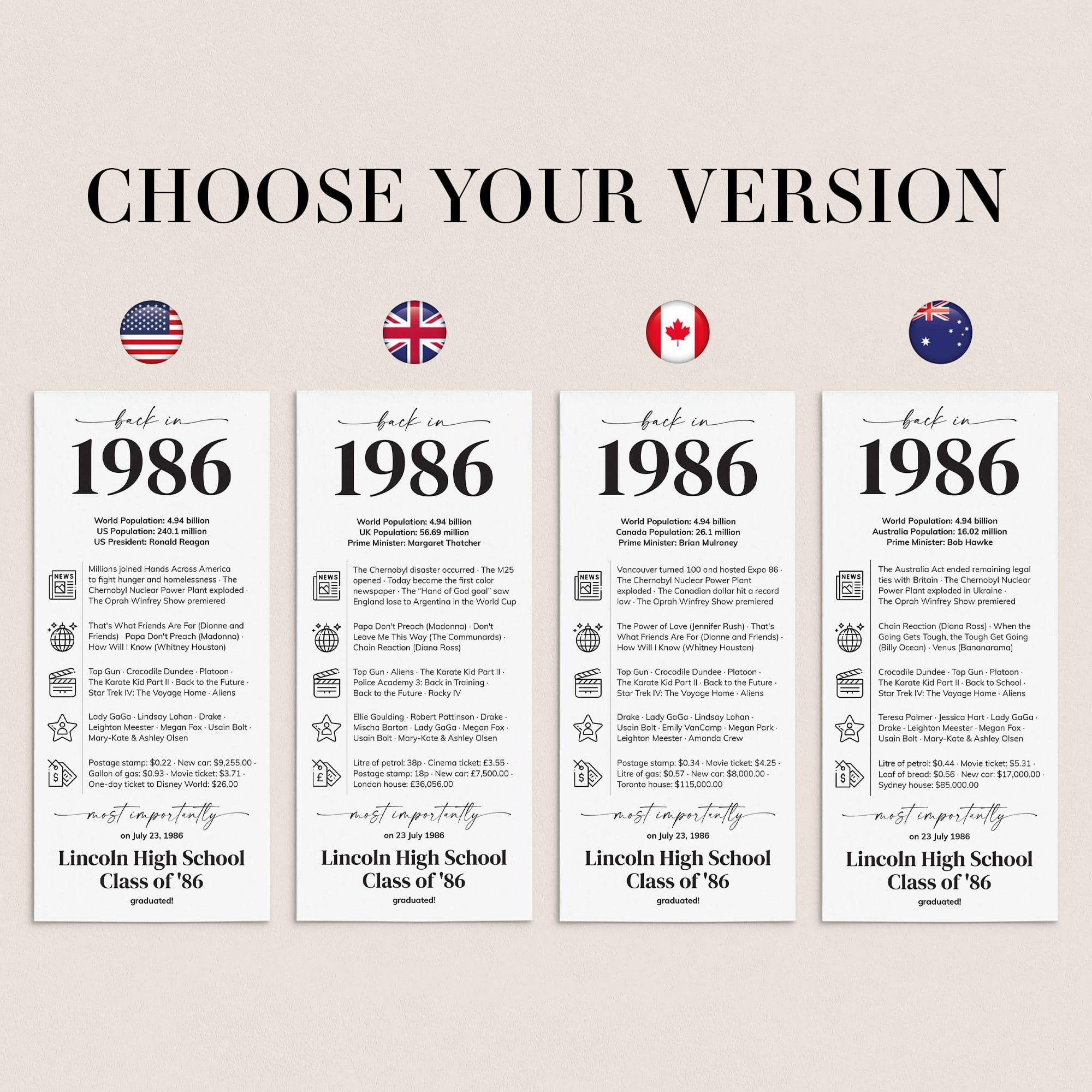 Looking for a stylish and personalized addition to your 40th Class of '86 Reunion? Our “Back in 1986” table card is the perfect way to celebrate your milestone! This sleek and minimalist card, customized with your school’s name and graduation date, combines entertaining facts from 1986 with clean icons for a fresh, contemporary look.