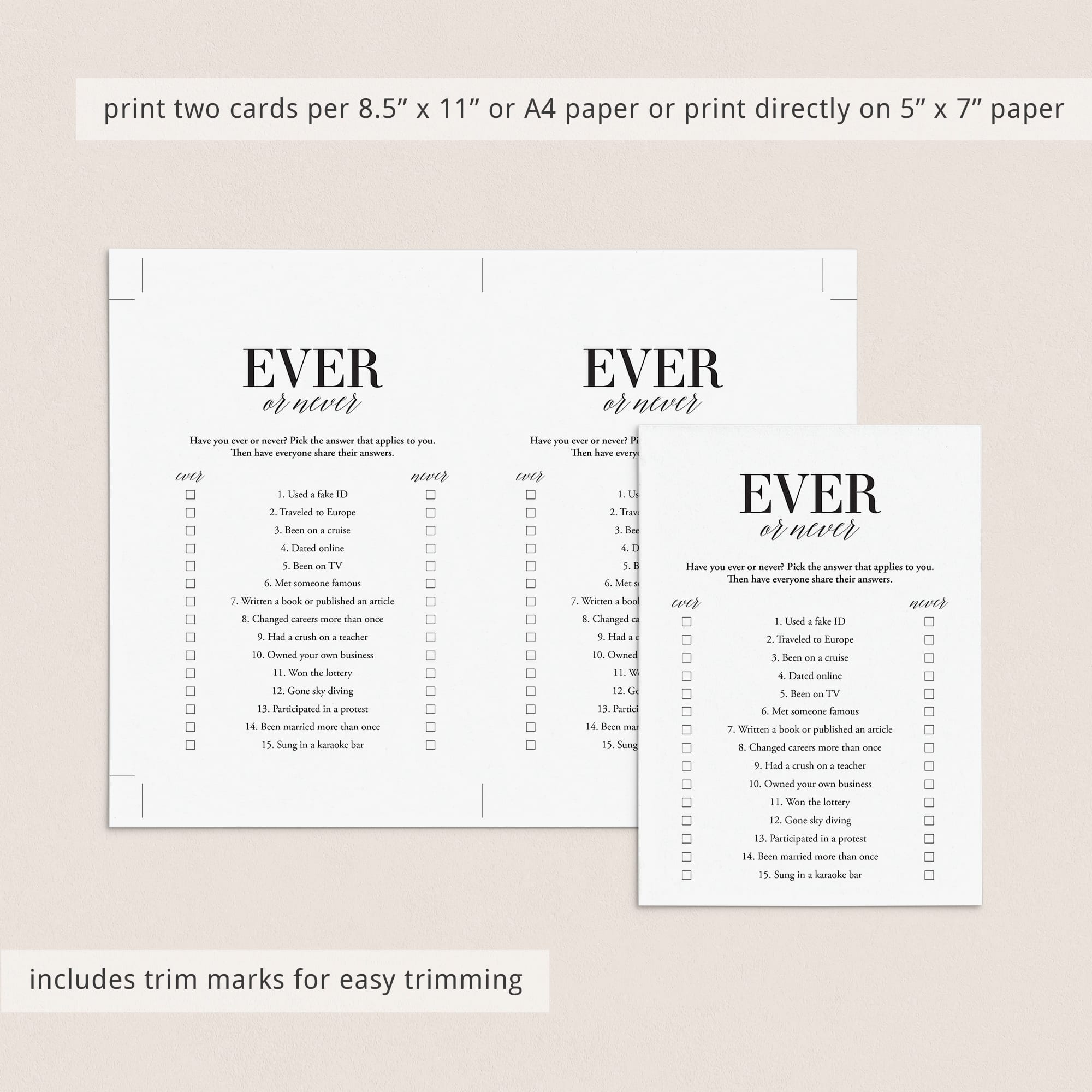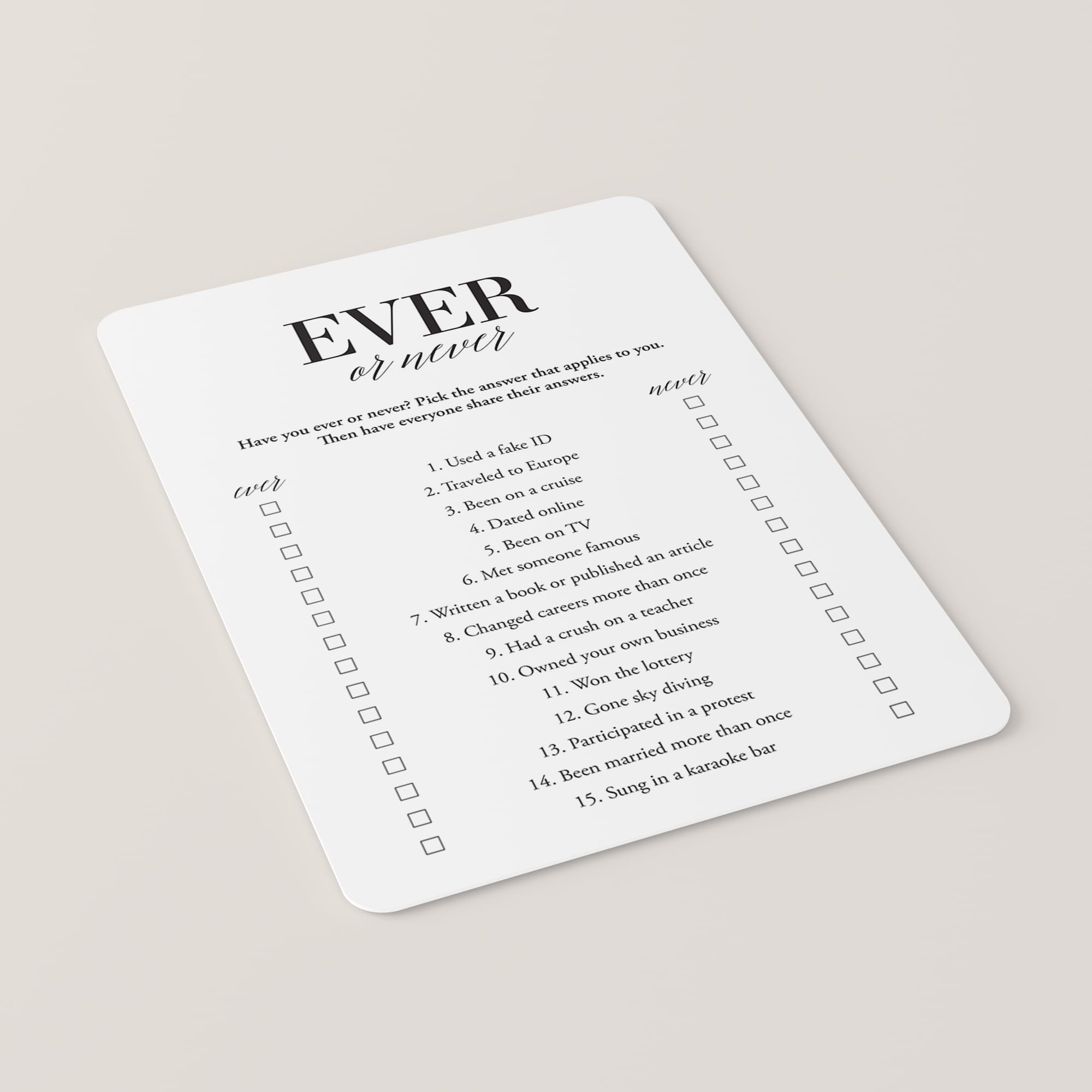 Here’s how it works: each guest fills out the Ever or Never game card by checking off the experiences they’ve had. Then, share answers with the group and see what you discover! Have you ever traveled to Europe, owned your own business, been on TV, or had a crush on a teacher? The results are always entertaining and often unexpected.