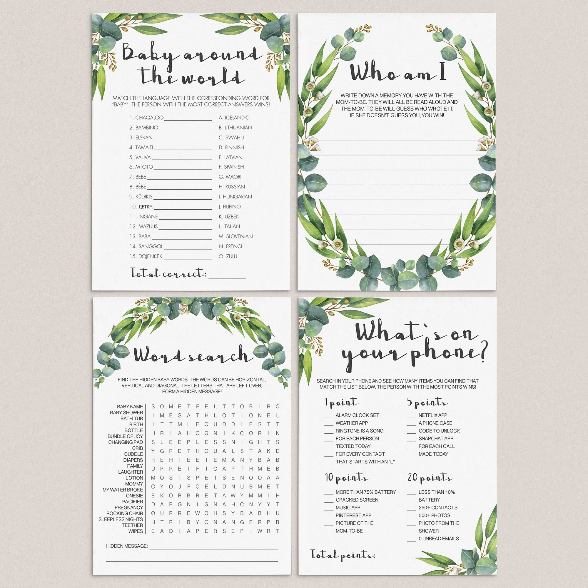This eucalyptus baby shower games pack includes the following unique baby shower games: