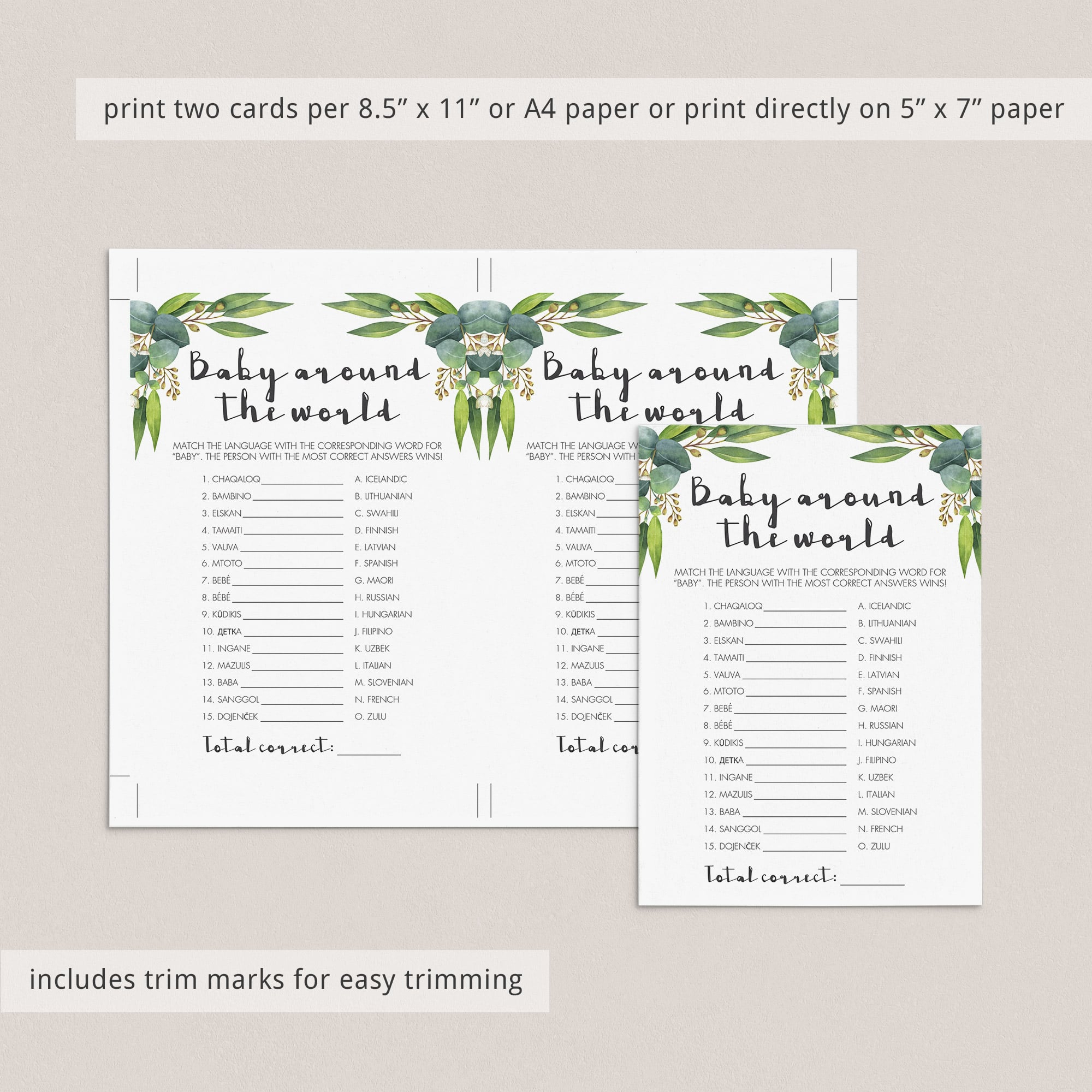 Entertain your guests with this eucalyptus baby shower games pack with green leaves. The digital games pack includes everything you need to entertain large groups of guests with a variety of activities.