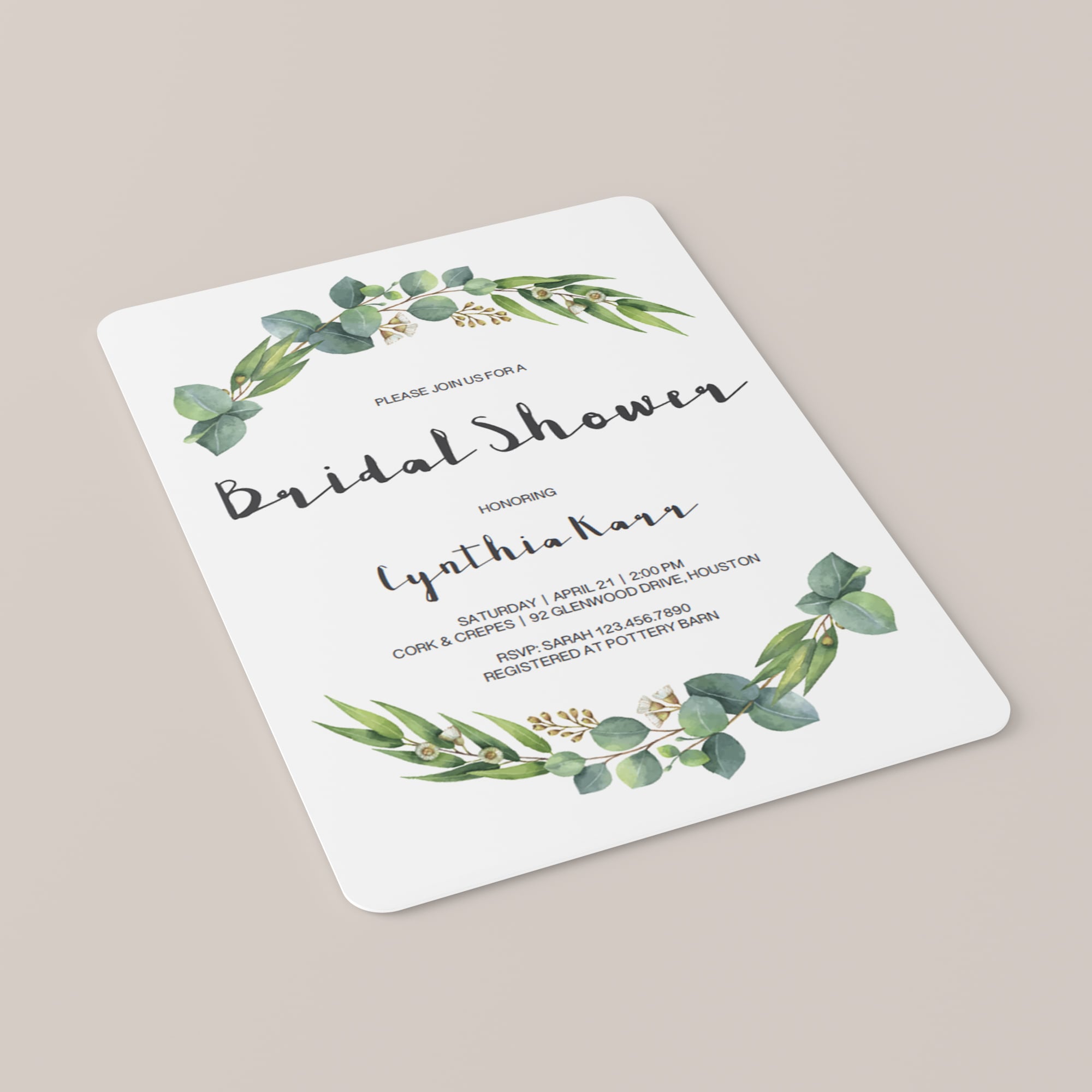 Invite your bridal shower guests in style with this beautiful eucalyptus bridal shower invitations template. The watercolor leaves give the invitation a chic botanical touch and will make all the girls excited for the bridal shower!