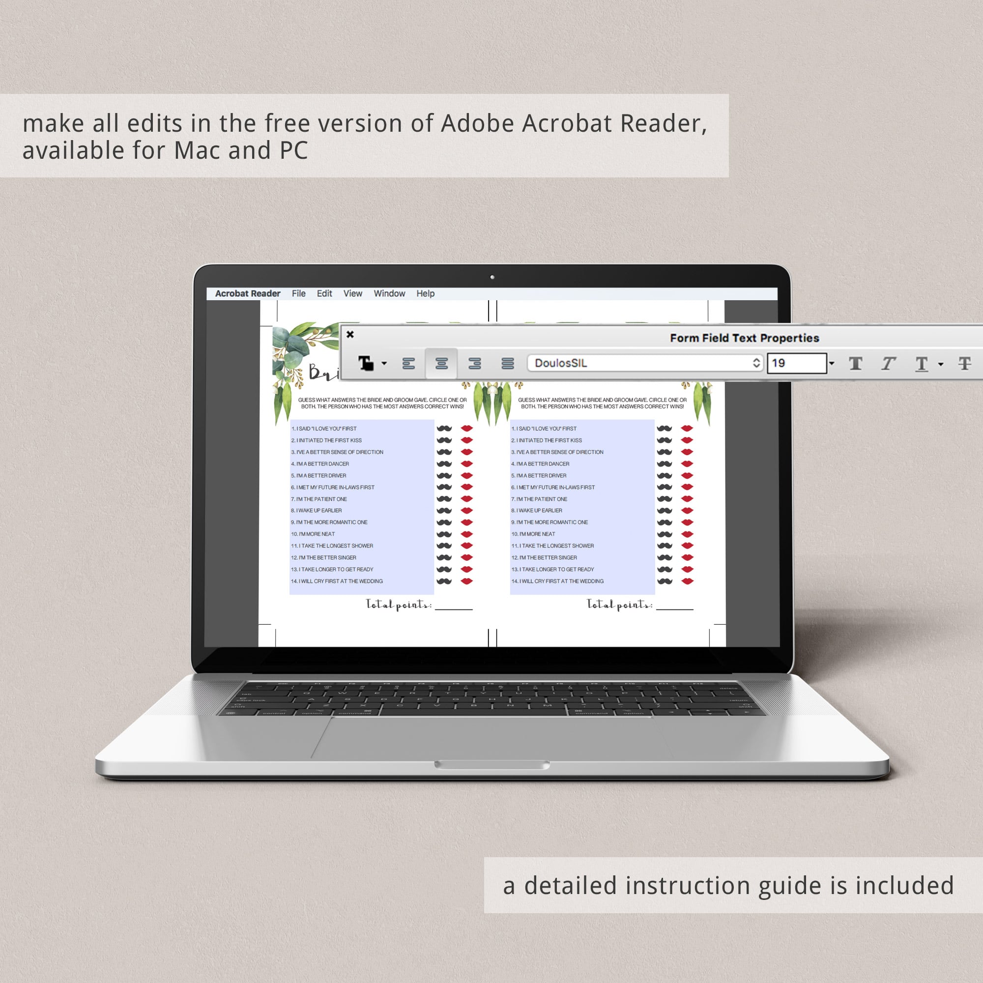 The games Bride or Groom and Mad Libs are editable in Adobe Acrobat Reader, so that your can personalize the games. A detailed instruction guide with tips & tricks on editing, printing, trimming, paper choices and more is included. Print right from your computer in a matter of minutes or have the cards printed at your favorite print shop.