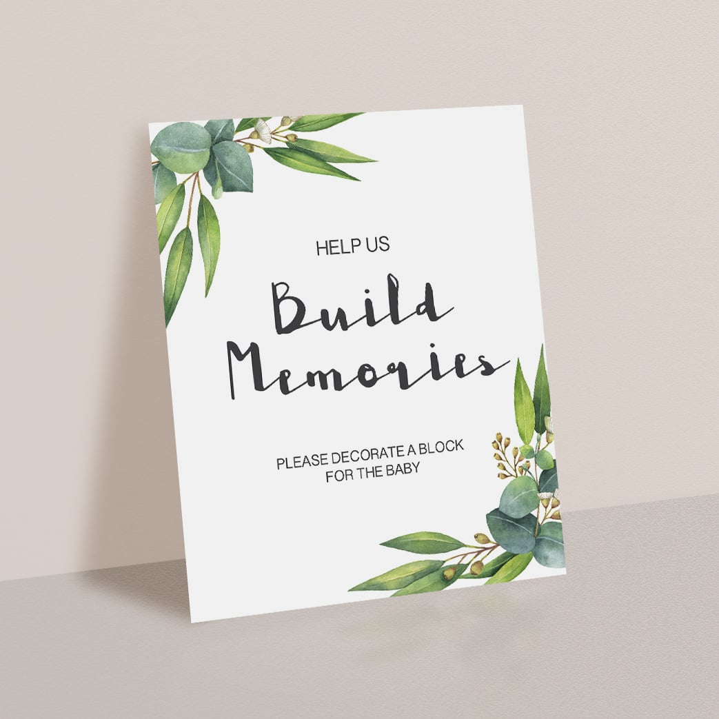 With little effort, set up this creative baby party activity. Download, print and frame this greenery baby shower Decorate A Block sign with watercolor leaves in a cute frame. Provide small plain wooden blocks and some sharpies for your guests and let the creativity come out!
