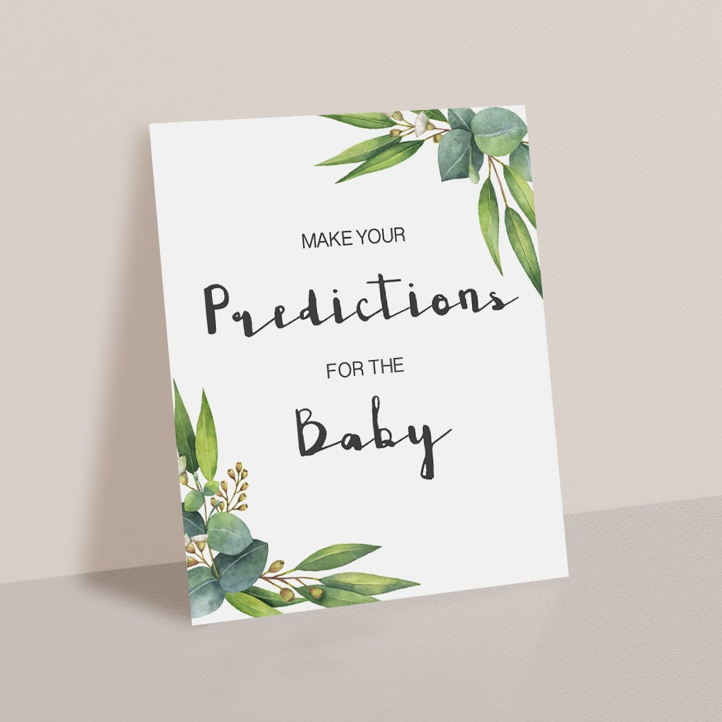Create a meaningful keepsake for the mommy-to-be with a baby prediction card. It's a fun way to engage your guests during the party and it makes a beautiful keepsake afterwards. Use this greenery baby predictions table sign to create your baby prediction station.