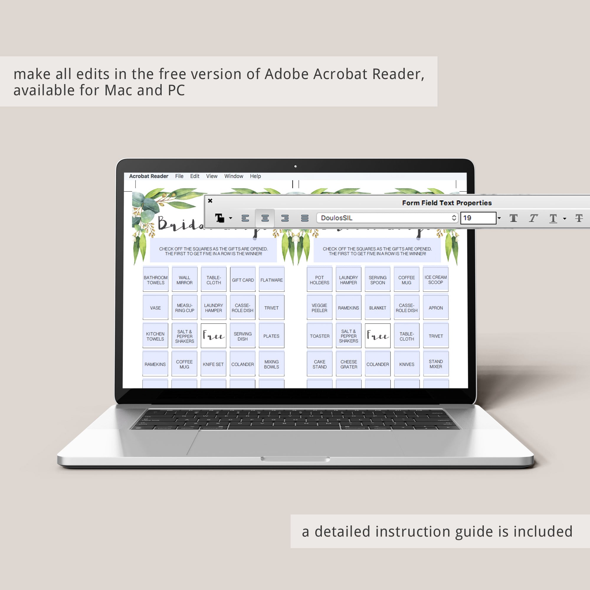 The bingo game has everything you need to play Bridal Bingo in a couple of different ways. The 30 prefilled cards with calling sheet are the easiest option for everyone. Simply print, trim and you're ready to go! If you have more than 30 guests, use the included PDF template, so that you can make a couple more bingo cards.