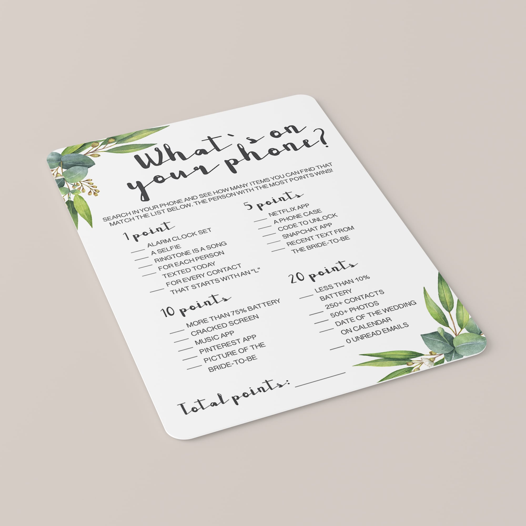 What's On Your Phone Bridal Shower Game Printable Greenery