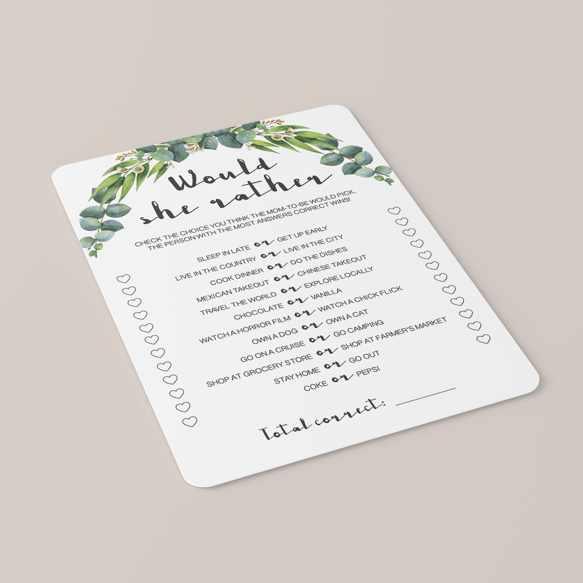 Are you looking for the perfect ice breaker to get people talking and in the party mood for your baby shower? Play “Would She Rather”! After all, your guests have one thing in common: you know the mom-to-be. These printable game cards with eucalyptus leaves would be perfect for a greenery themed baby shower.