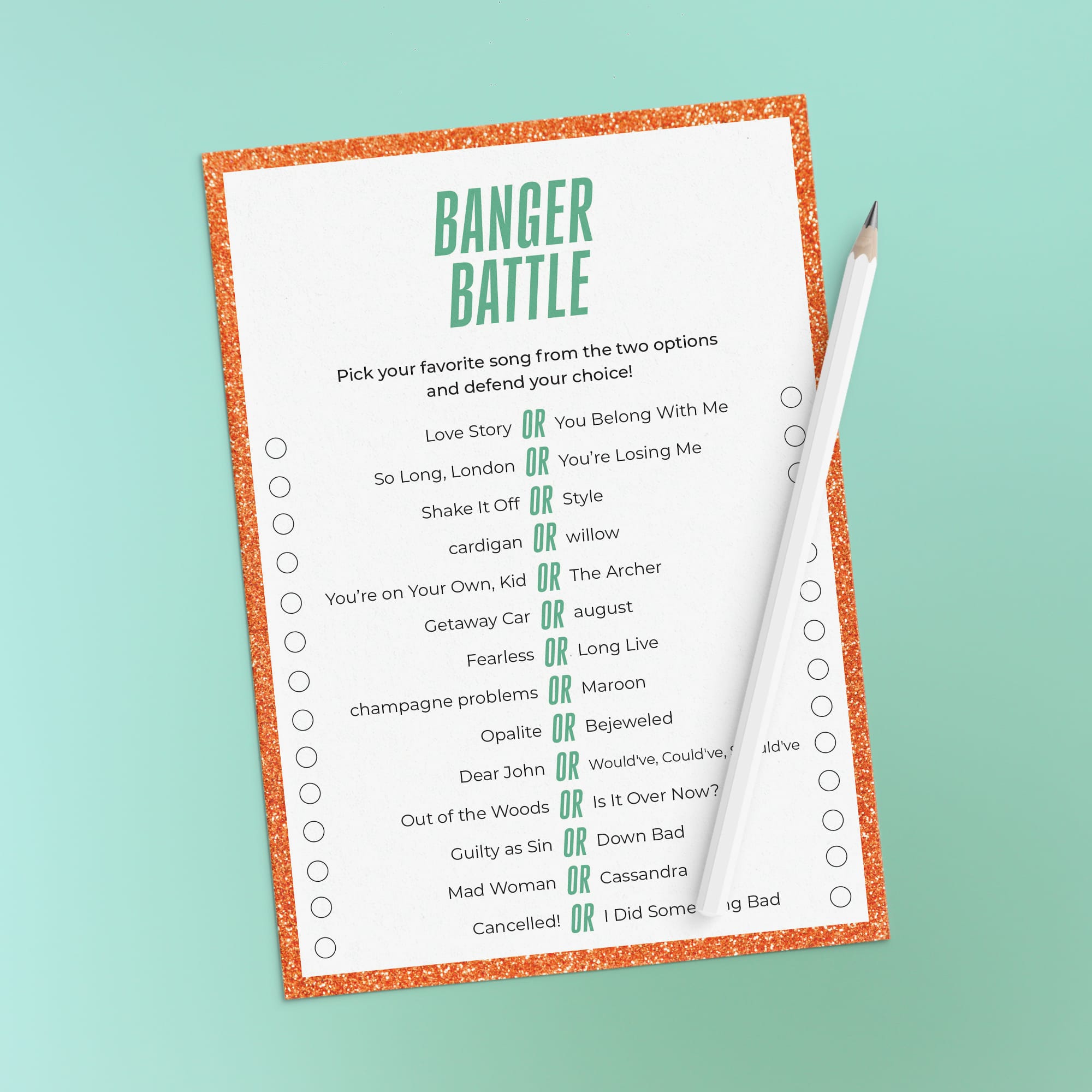 Turn your party into a glittering celebration with this Showgirl-inspired printable game bundle! Featuring a bold glitter-orange border and mint green details, this set is designed to shine at birthdays, slumber parties, and listening nights with friends.