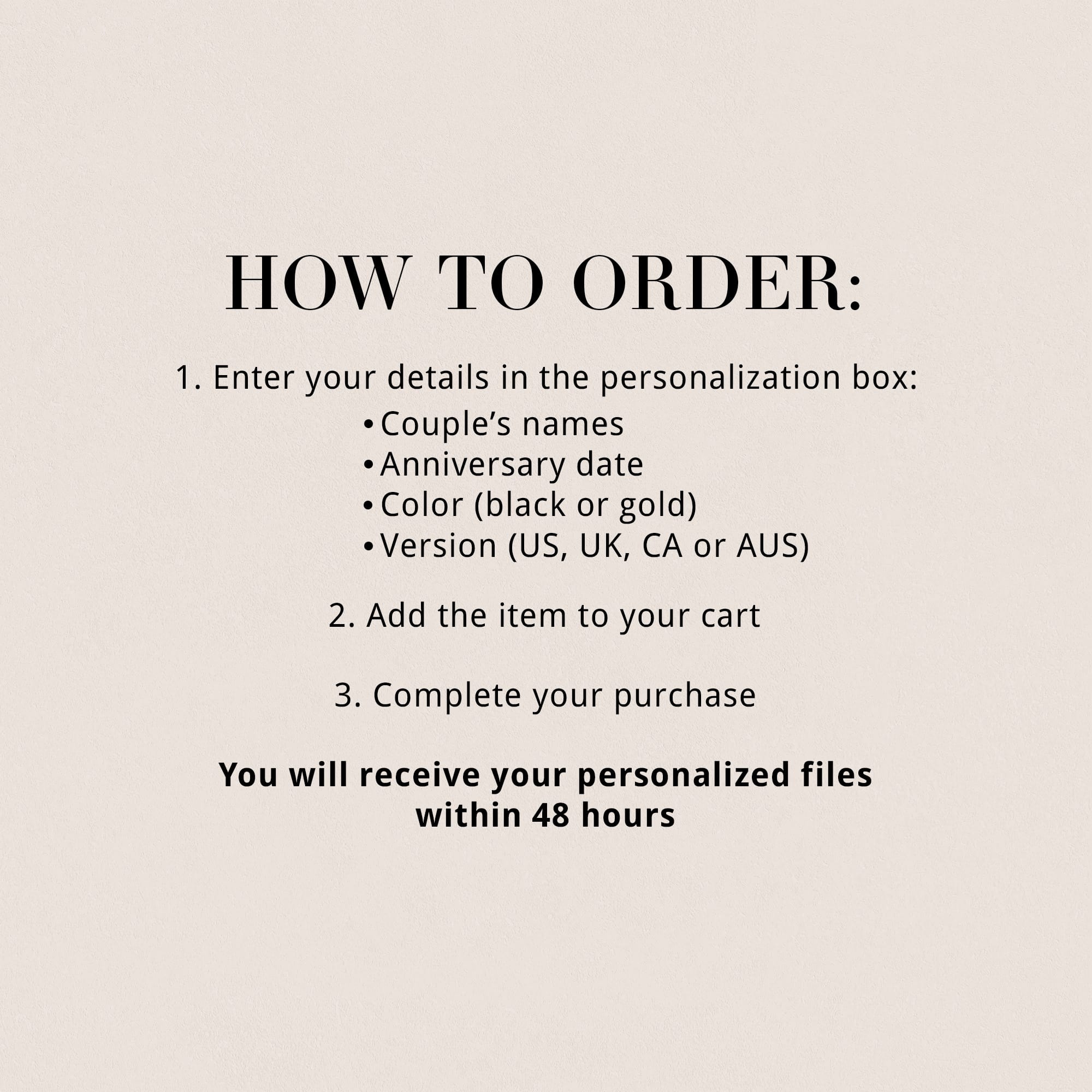 1. Enter the couple’s names, their anniversary date, preferred color (black or gold) and version (US, UK, CA or AUS) in the personalization box