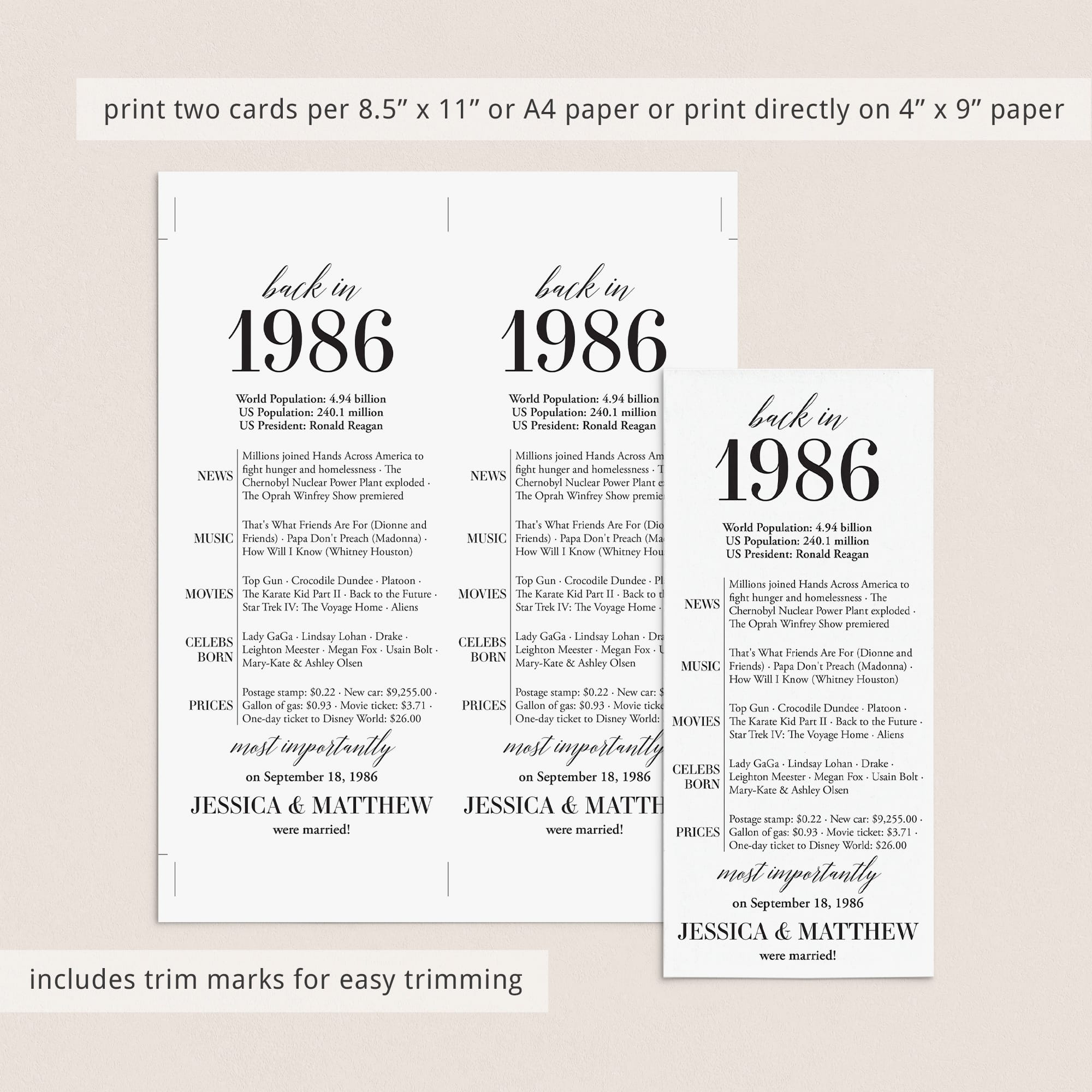 Celebrate 40 years of love and commitment with our simple yet elegant “Back in 1986” anniversary table card! This personalized card highlights memorable facts from the year 1986, making it the perfect keepsake or addition to an anniversary party for a couple celebrating their 40th anniversary in 2026.
