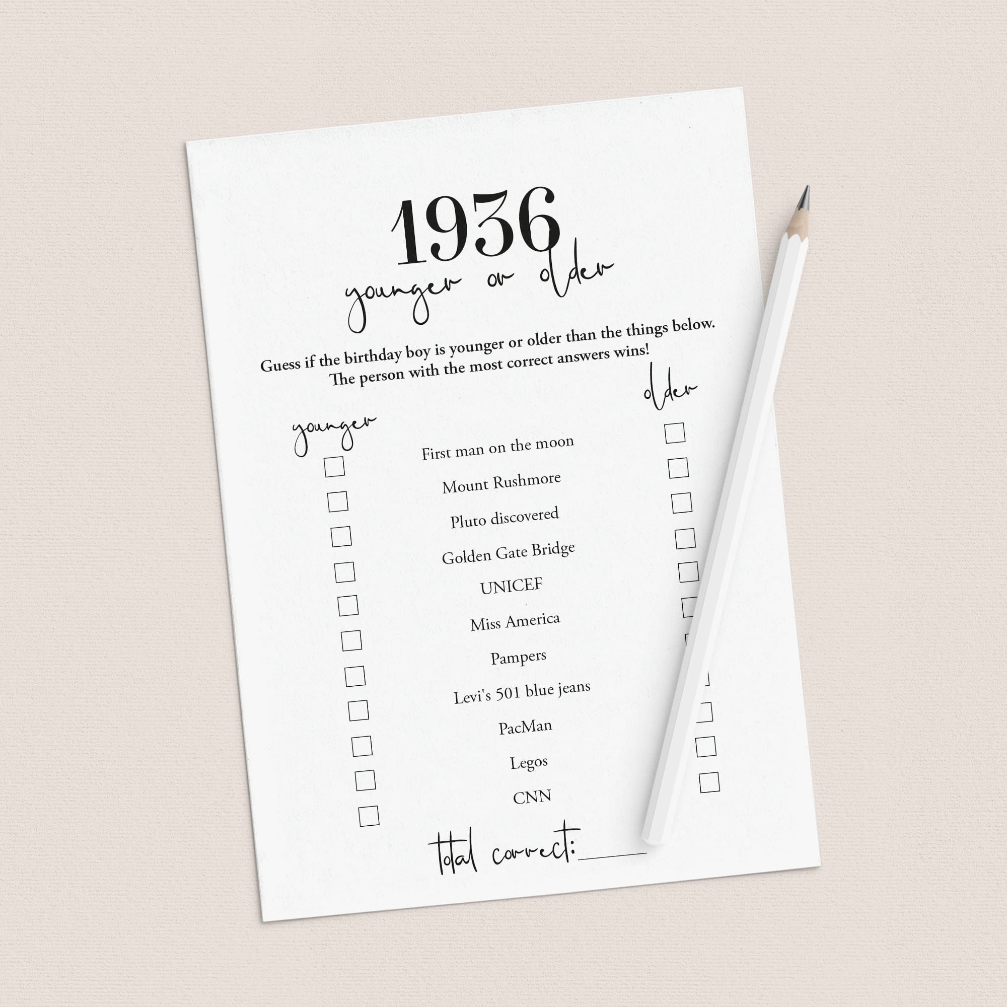 Celebrate a man born in 1936 with this 90th Birthday Games Bundle. Designed with a modern and minimalist style, this printable bundle includes 12 fun and meaningful games and activities, from nostalgic 1936 trivia quizzes to heartfelt wishes cards and keepsakes. It's the perfect way to add a special touch to this milestone birthday celebration.
