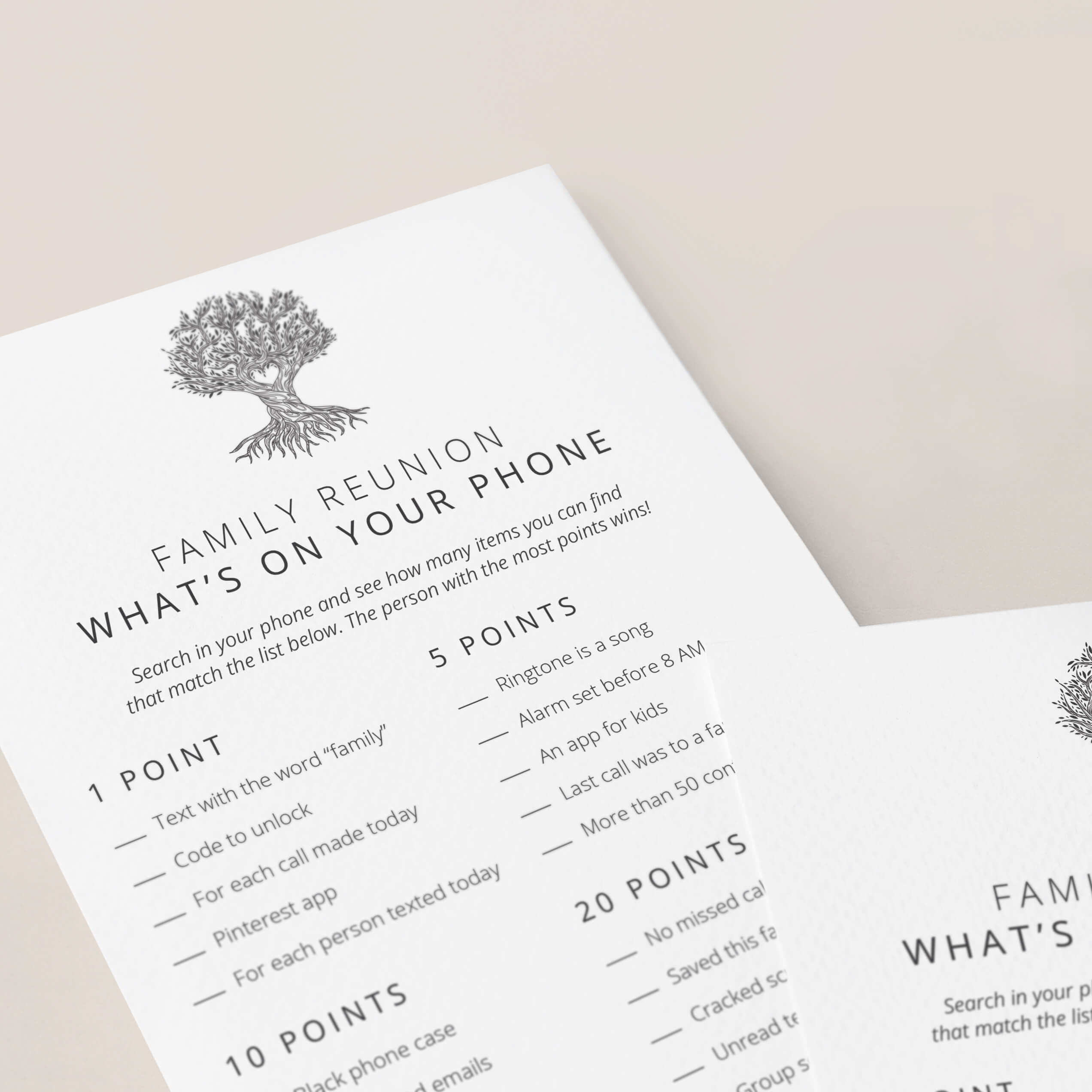 All you need to play is a smartphone and one of these What's On Your Phone game cards with minimalist family tree.