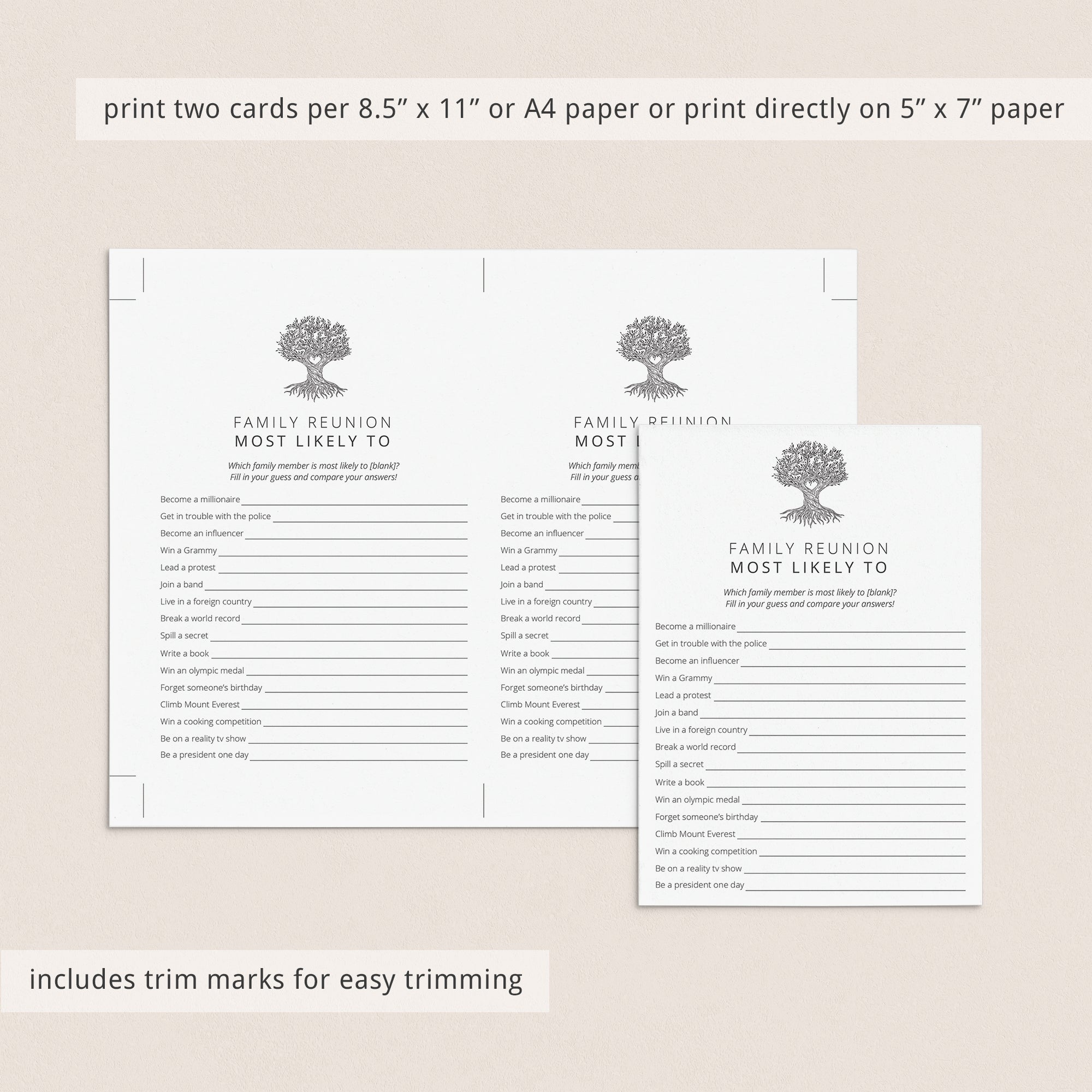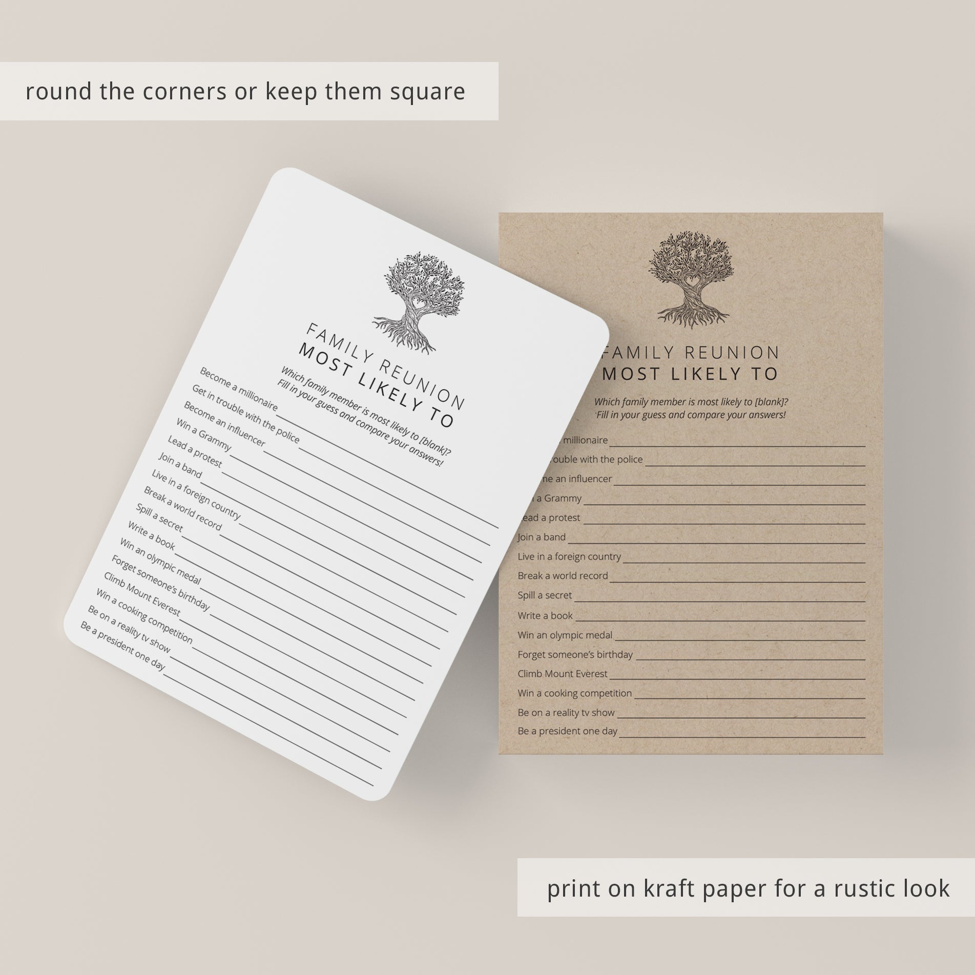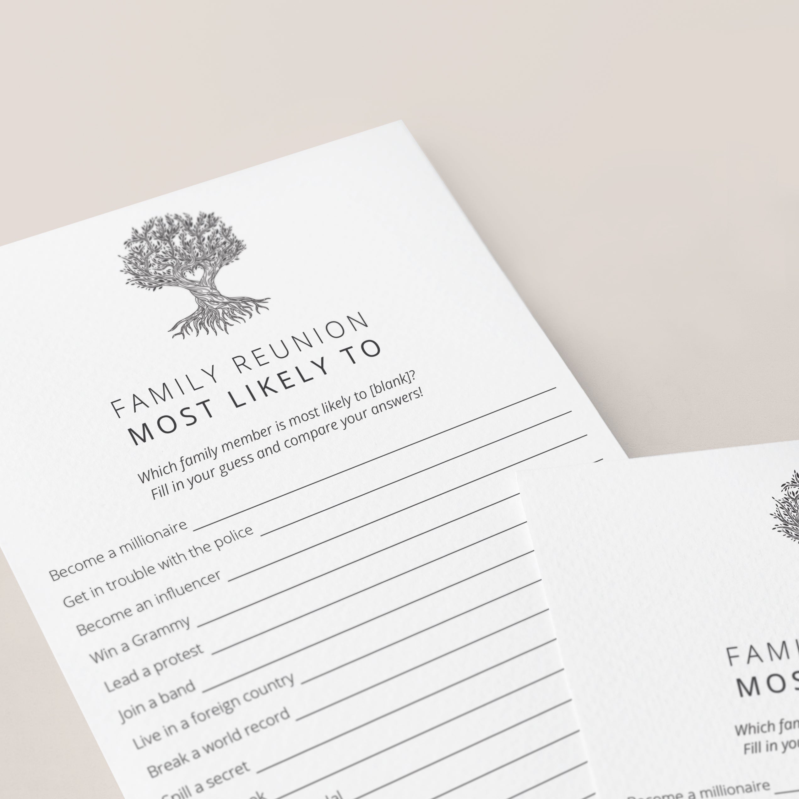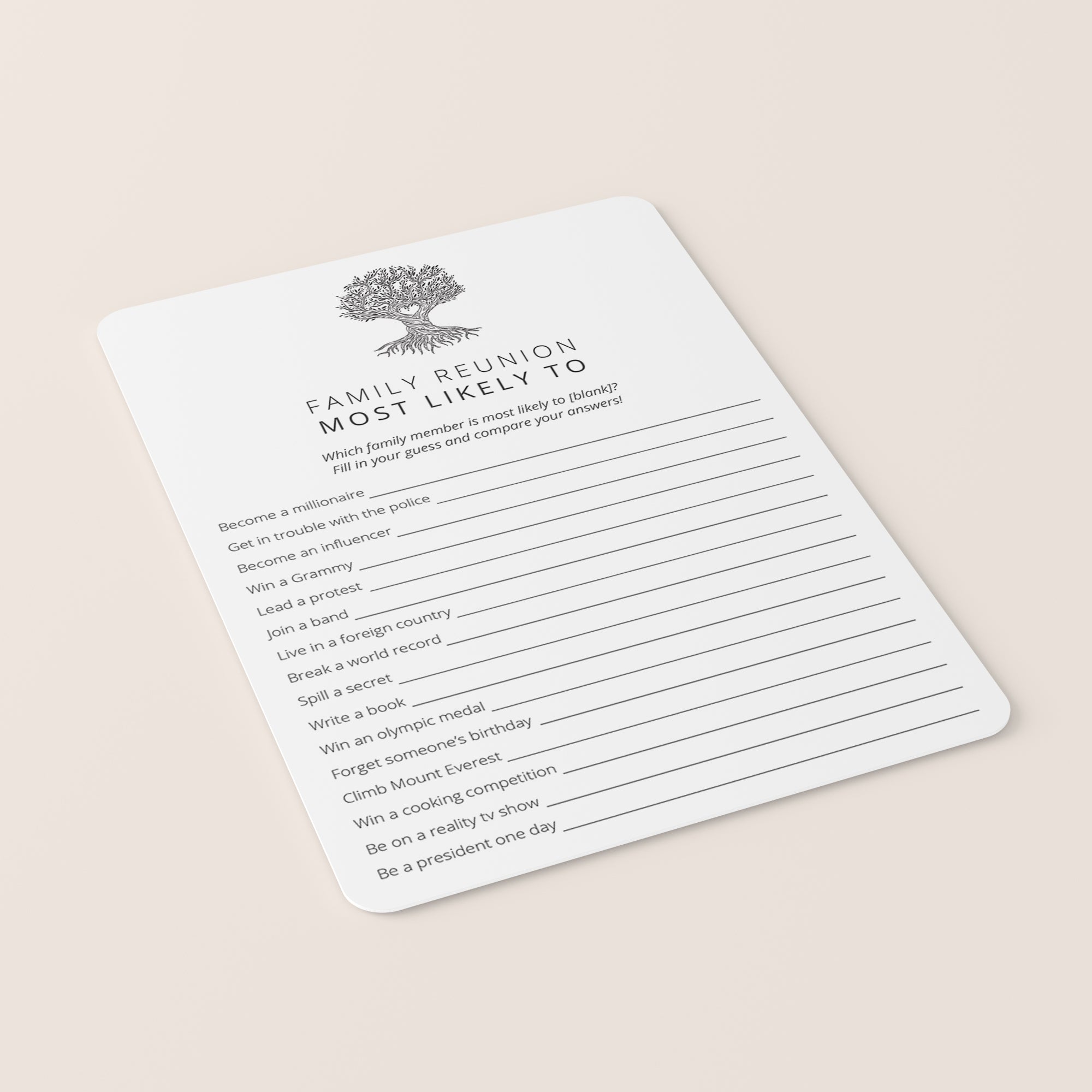 Are you looking for a fun Family Reunion Party game to play with your relatives? Play Most Likely To. This funny game with minimalist family tree has 16 Most Likely To questions for families that will get everyone talking and laughing. You will get to know your family members at some new level.