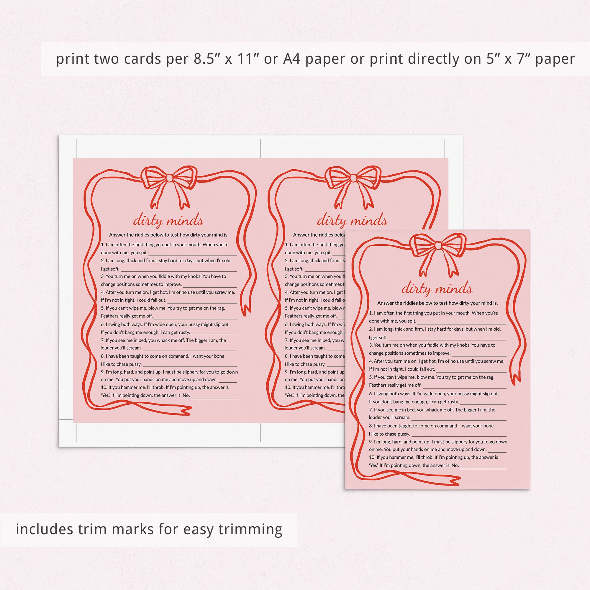 The game, featuring a playful pink background, red text, and a cute wavy ribbon border topped with a bow, will provide you and your girls with hours of laughter as seemingly naughty riddles point towards the most innocent of answers. An answer key is included.