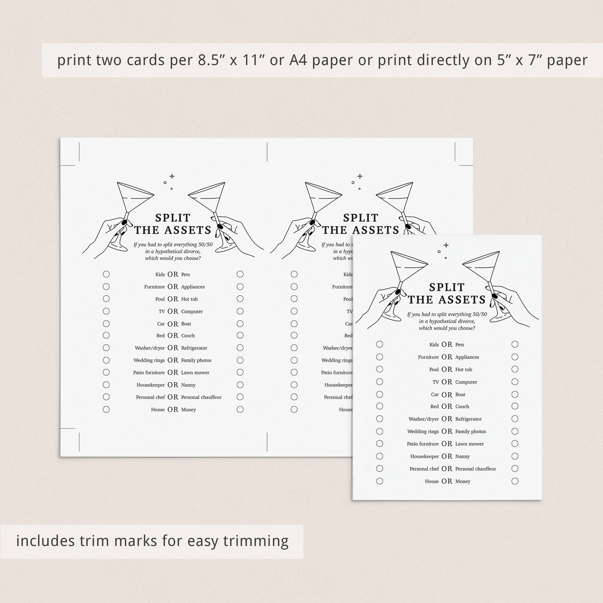 Are you looking for a fun icebreaker game for your divorce party? Play Split The Assets. It's is a great conversation starter for your divorce celebration. If you had the split everything 50/50 in a hypothetical divorce, which would you choose?
