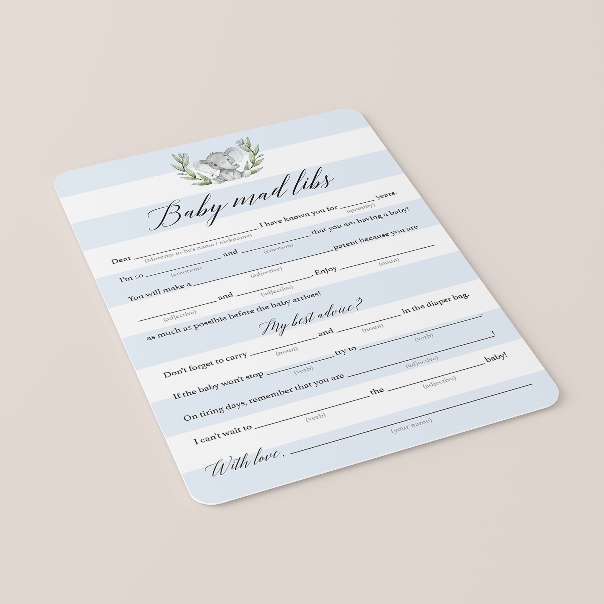 The directions are super easy. Print out these blue and white mad libs cards for each baby shower guest. Have them fill in the blanks using the description below (emotion, noun, adjective etc.) for a fun and unique way to leave their advice and wishes for the new mom.
