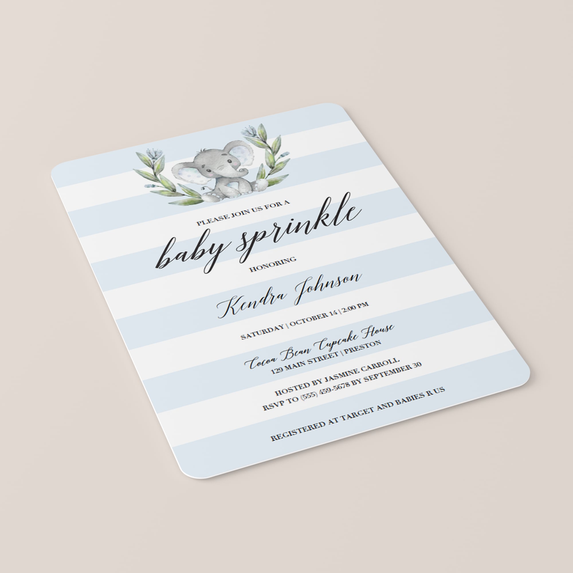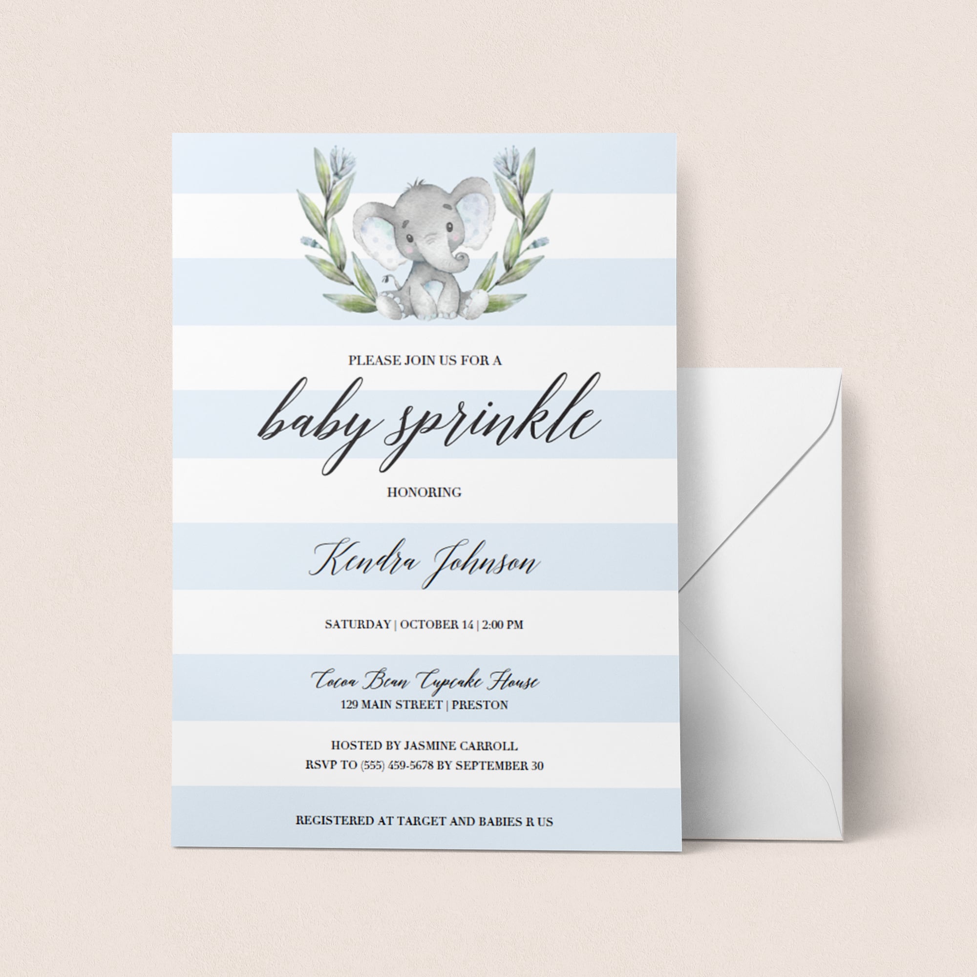 Are you hosting an elephant themed baby sprinkle to celebrate the arrival of a little brother? Make the perfect announcement with this adorable baby sprinkle invitation set. It is perfect for a low-key gathering with close friends and family.
