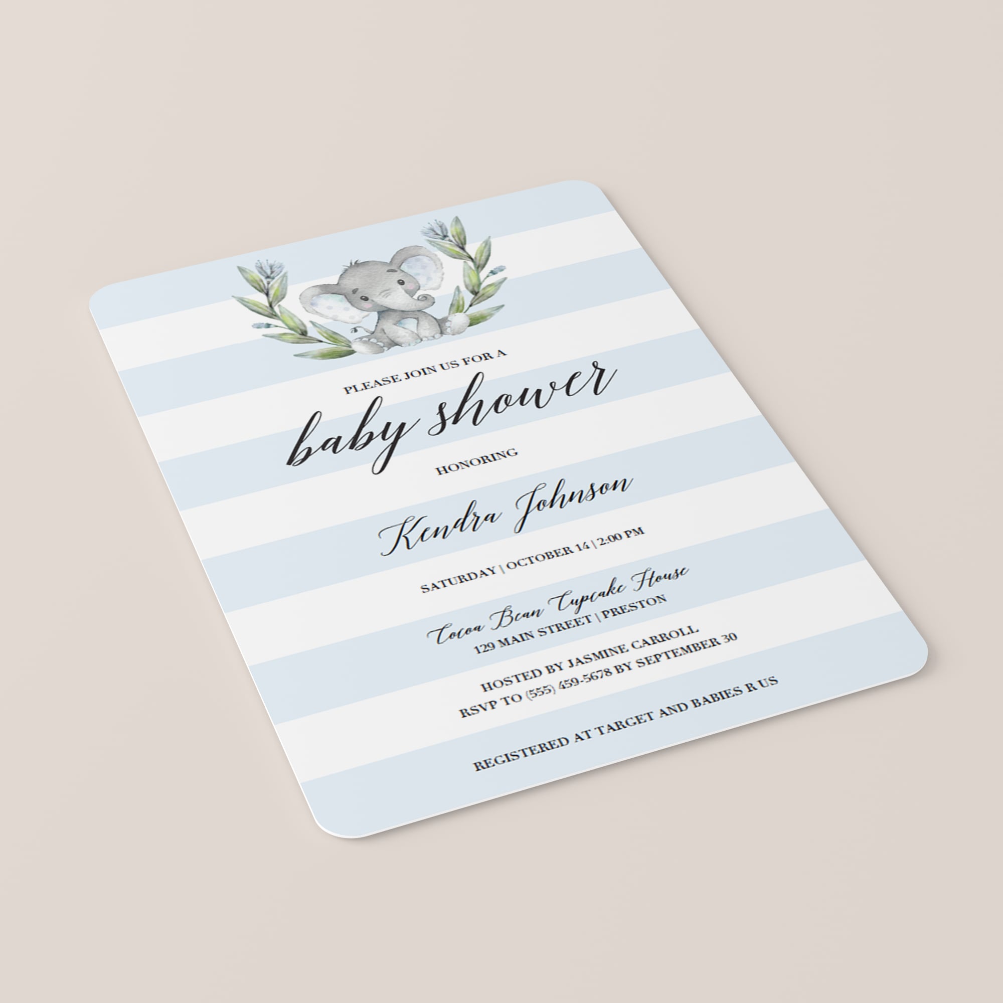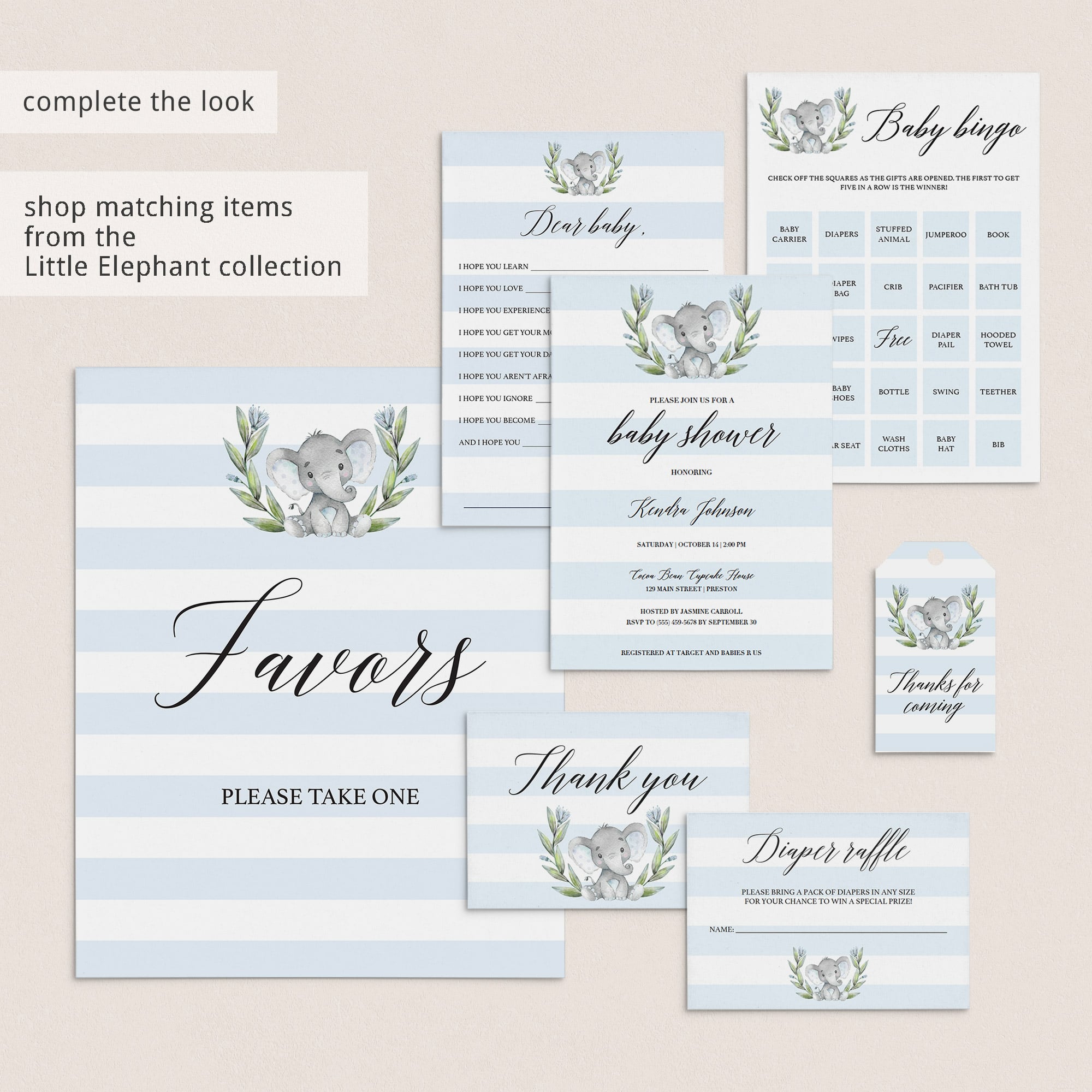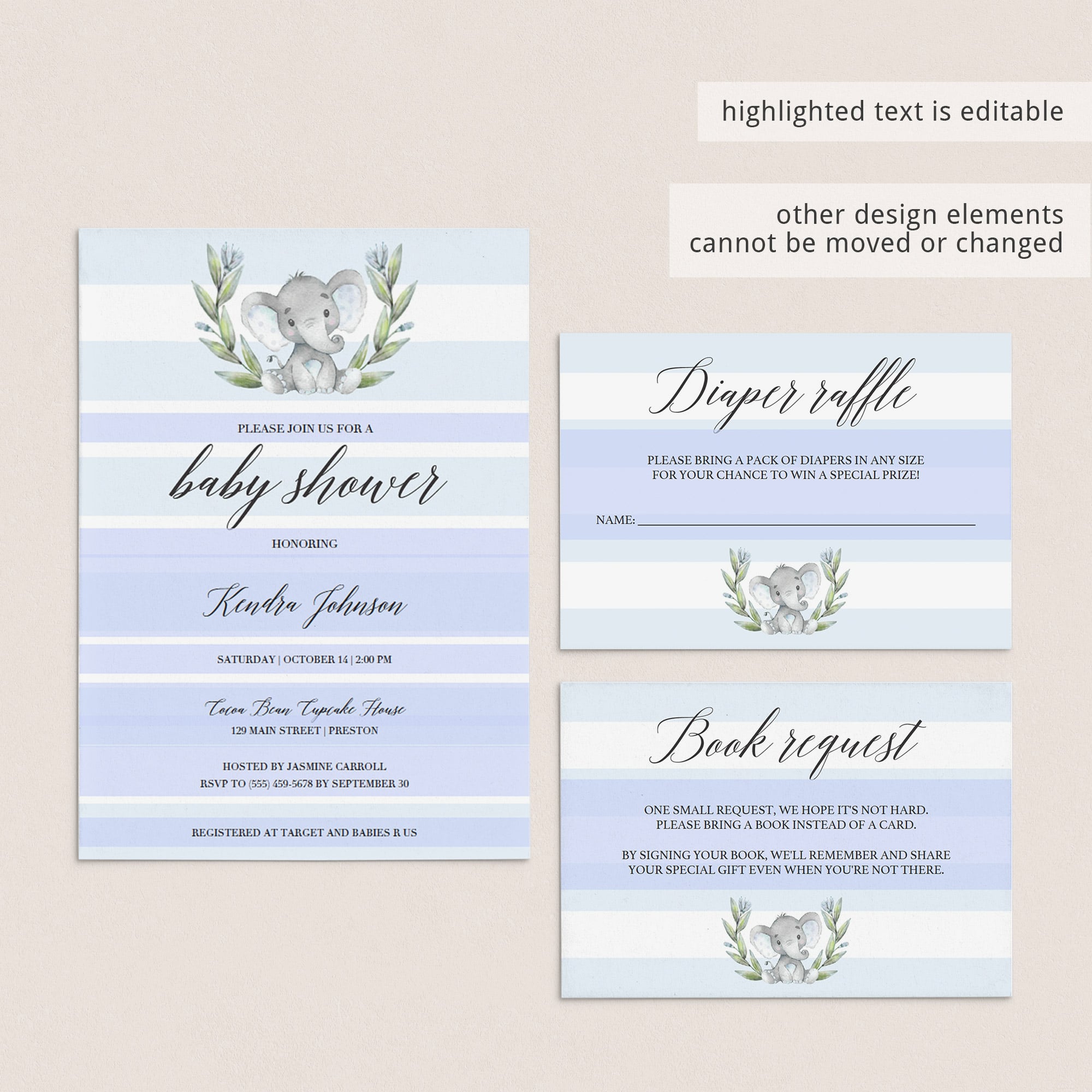 Are you hosting an elephant themed baby shower? Make the perfect announcement with this elephant themed boy baby shower invitation kit. The adorable elephant themed invitation kit includes the Baby Shower Invitation, a Diaper Raffle ticket and a Book Request card. It is perfect to celebrate the arrival of a little boy.