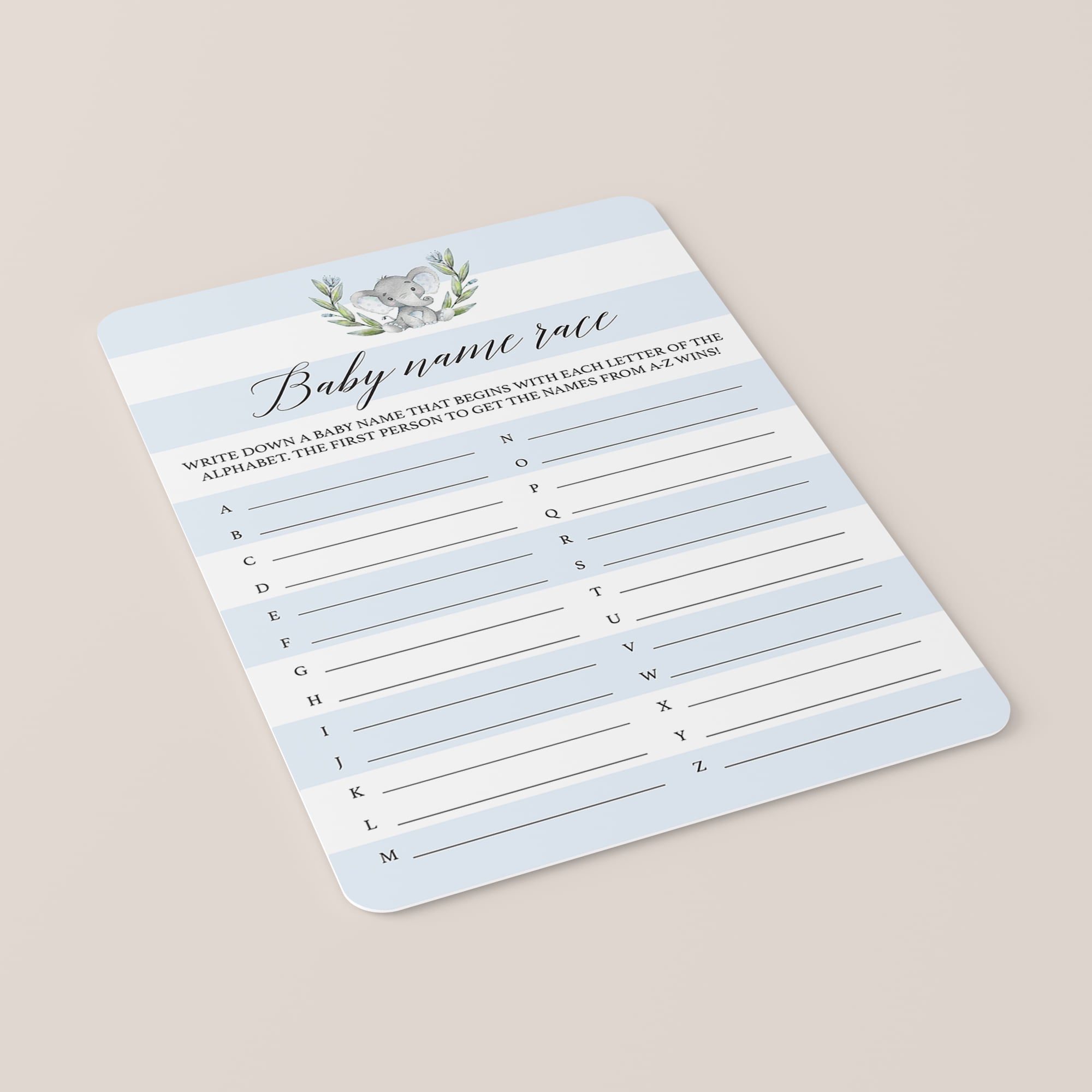 How many baby names do you know? Play Baby Name Race with this elephant baby shower game with blue and white stripes. It is perfect for a baby boy shower.