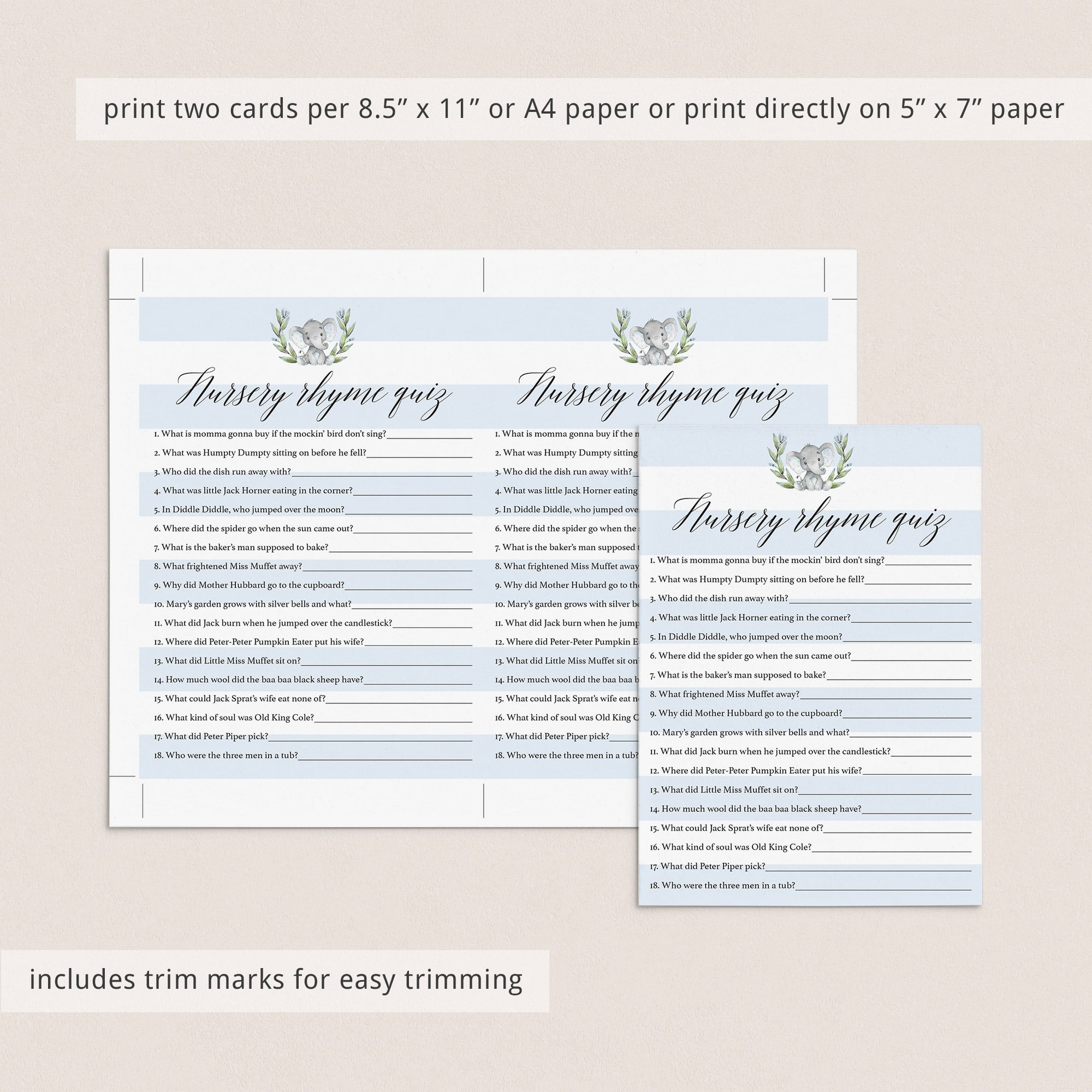 Test your guests how well they know their nursery rhymes with these blue elephant baby shower Nursery Rhyme Quiz.