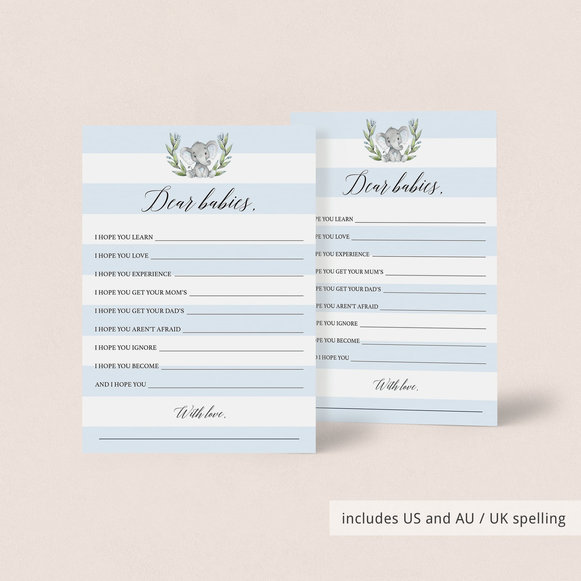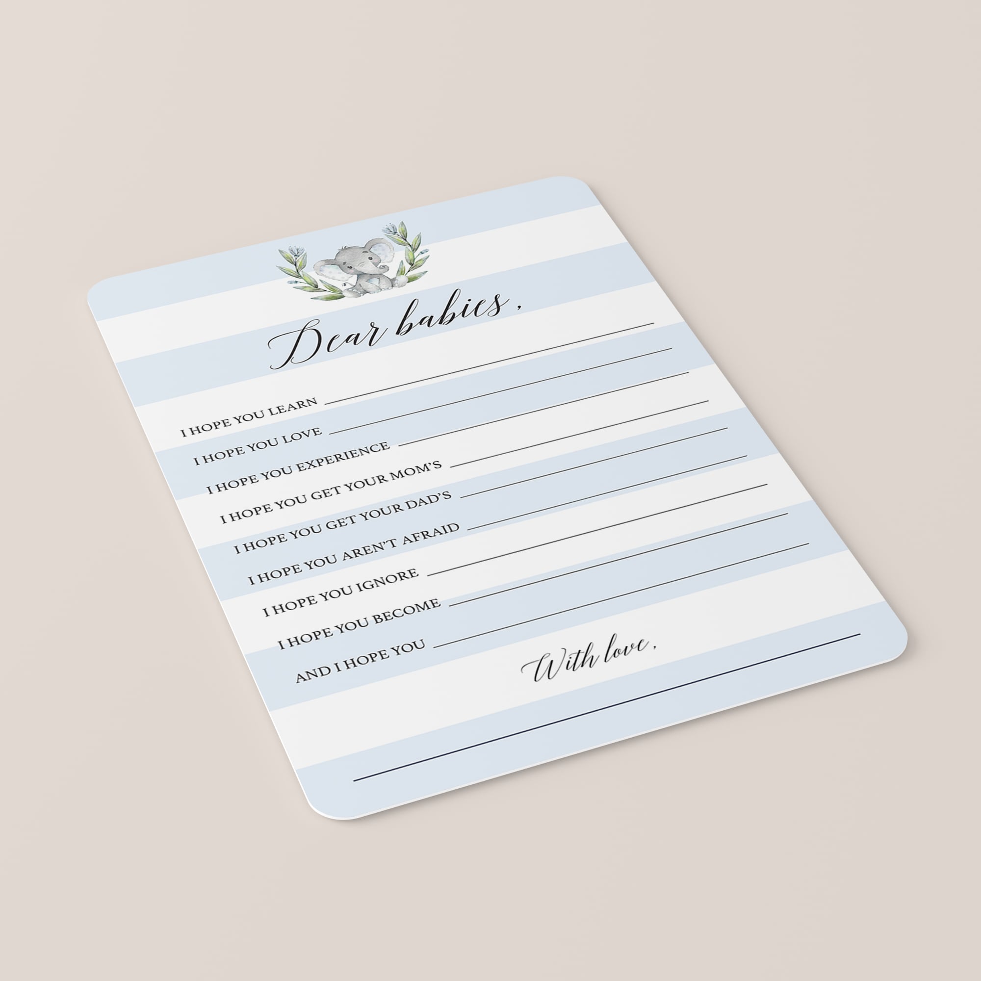 Are you hosting a twin baby shower to celebrate the arrival of baby boys? Create a meaningful keepsake for the parents-to-be with this Twin Boys Dear Babies card with baby elephant. Let every baby shower guest write down their wishes for the new boys and collect the cards for the lucky couple.