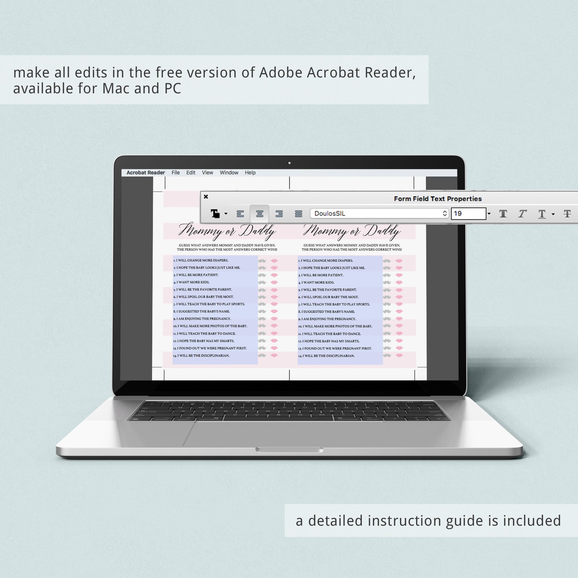 The game Mommy or Daddy is editable in the free version of Adobe Acrobat Reader, so that your can easily personalize the game. A detailed instruction guide with tips & tricks on editing, printing, trimming, paper choices and more is included. Print right from your computer in a matter of minutes or have the games printed at your favorite print shop.