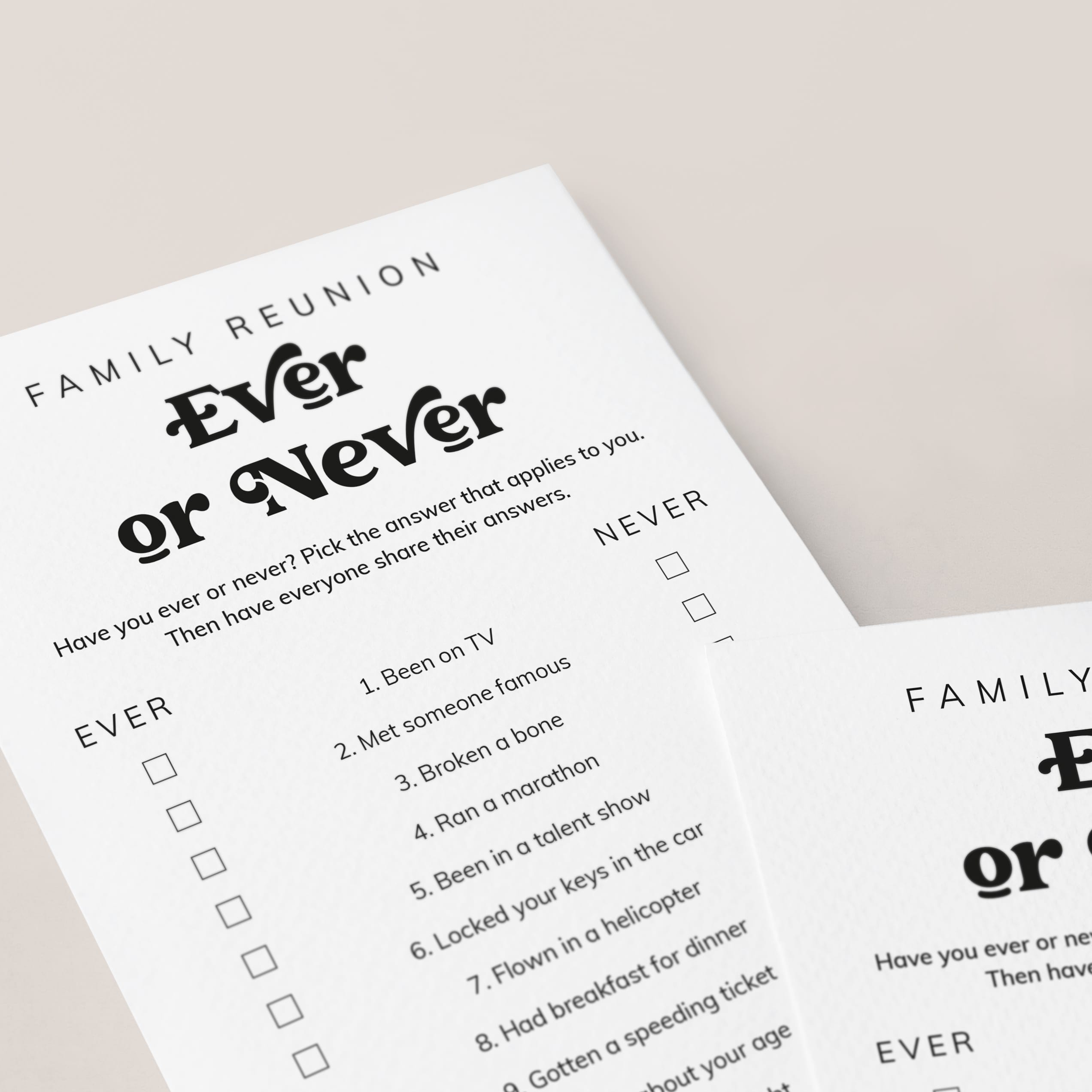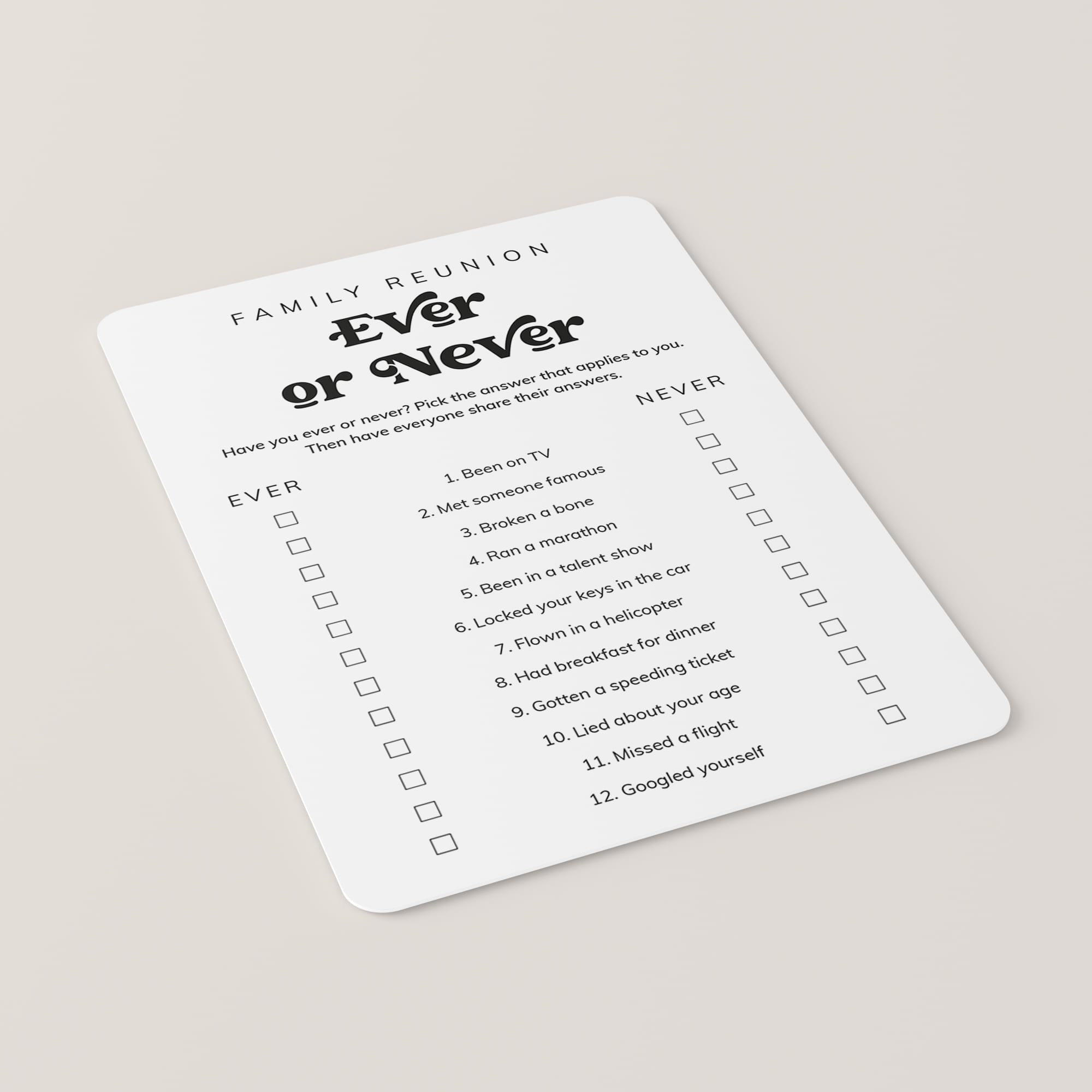 Find out what your relatives have ever or never done in this fun icebreaker game for the whole family! Each guest fills out this black and white game card by marking whether they have ever or never done the listed activities. Then share your answers with the group and enjoy the funny stories, surprises, and memories that come up.