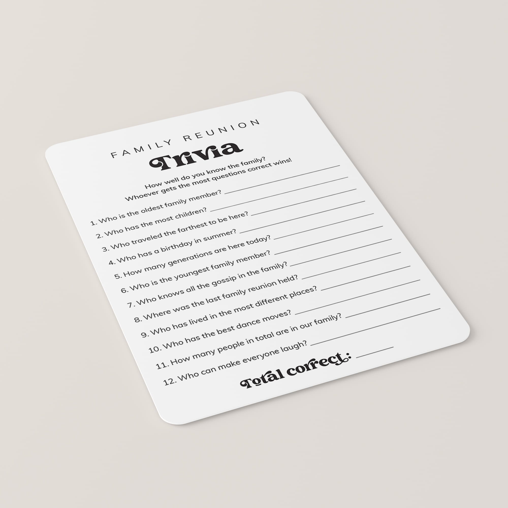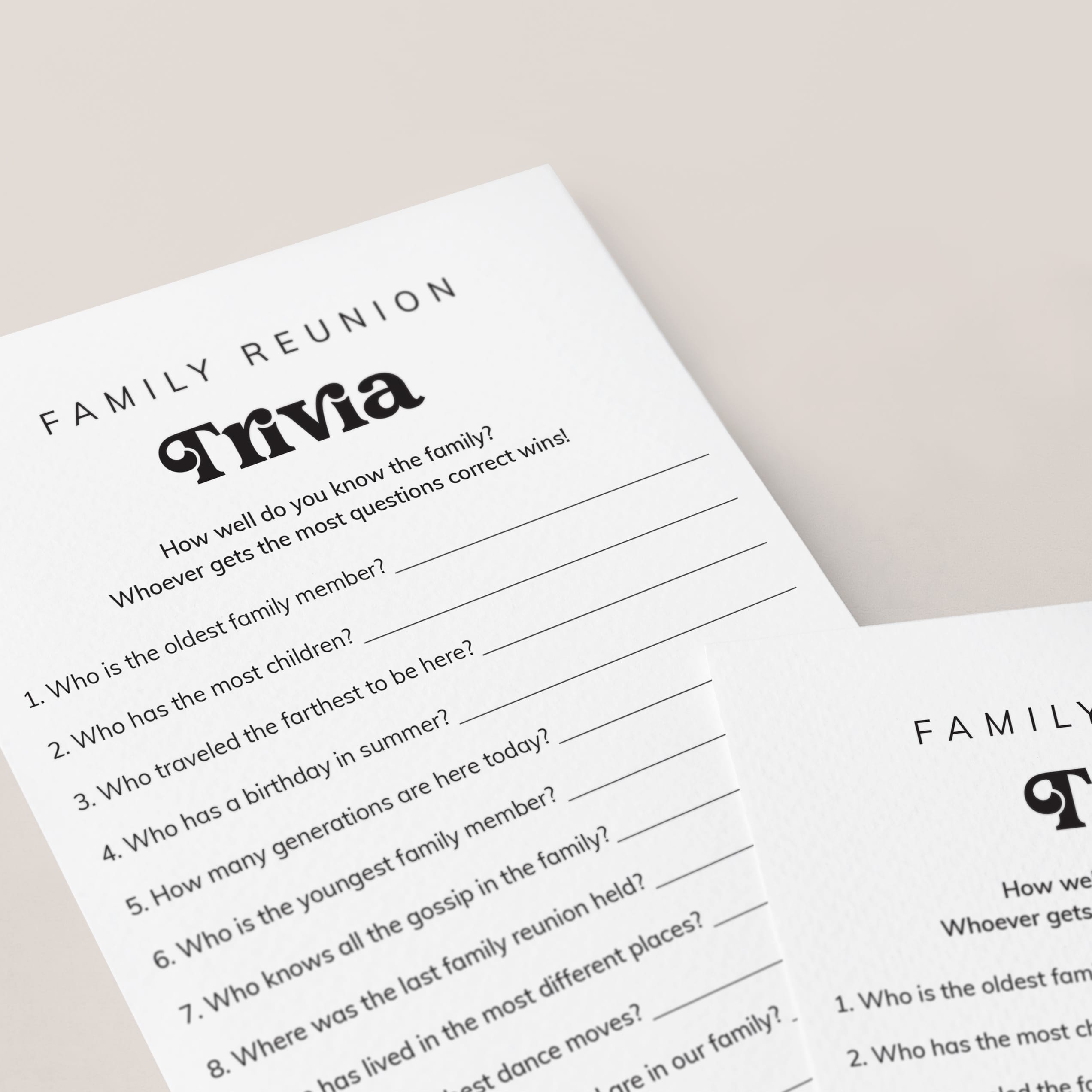 Make sure your family members mingle and get to know your relatives better with this Family Reunion Trivia. It's the perfect icebreaker game to any family gathering or family game night.