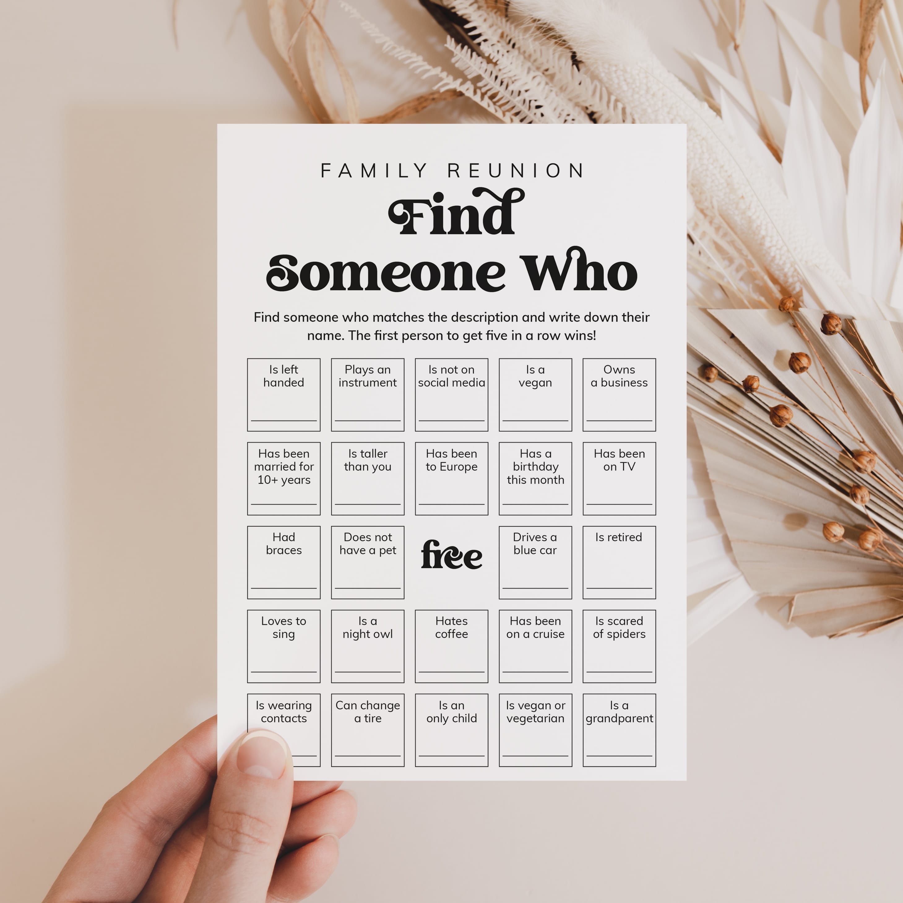 Kick off the fun at your next family reunion with this Icebreaker Game Bundle! Designed to bring everyone together, from teens to grandparents, this set includes three family-friendly games: Find Someone Who Bingo, Ever or Never, and Family Trivia. With a clean, modern black script design, these printables match any family gathering theme. Whether you're hosting a reunion, a casual get-together or a family game night, this bundle is the perfect way to spark laughter, stories and connection.