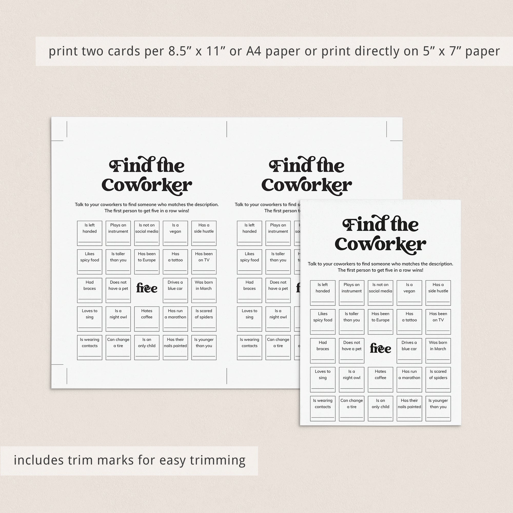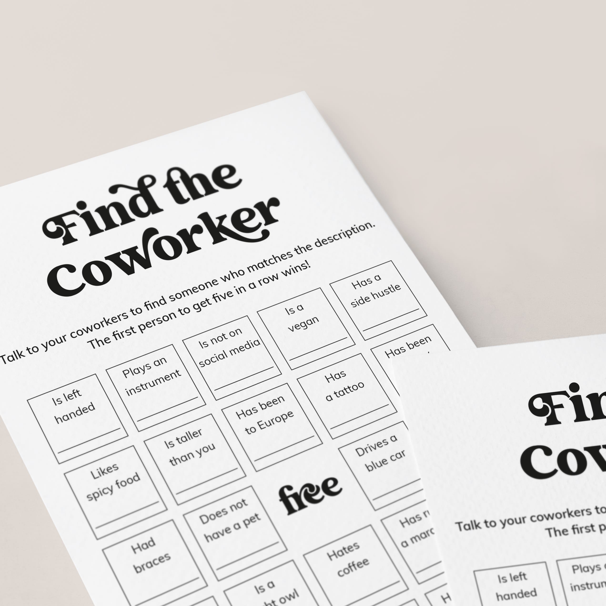 Turn your next office party into a lively, conversation-filled event with this "Find the Coworker" Human Bingo Game! This fun and interactive activity encourages coworkers to mingle, connect, and discover fun facts about each other, all while racing to get five in a row.