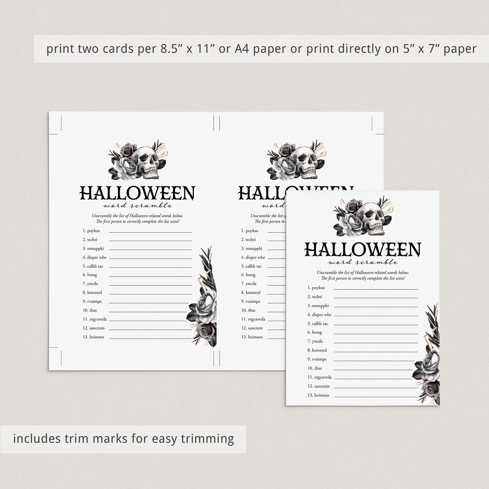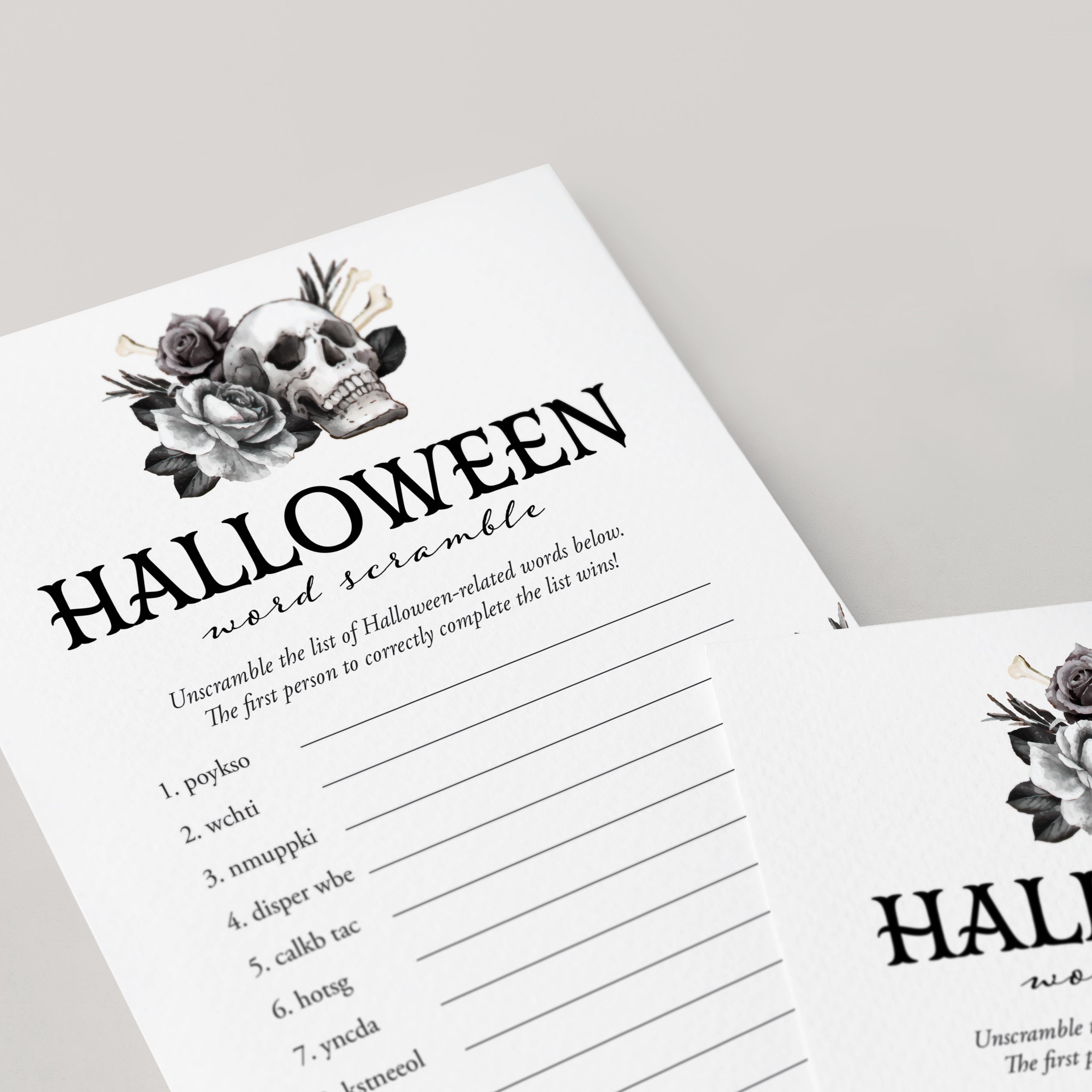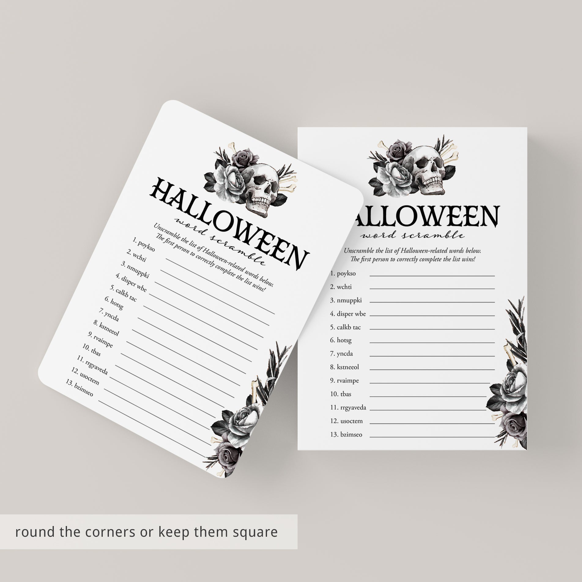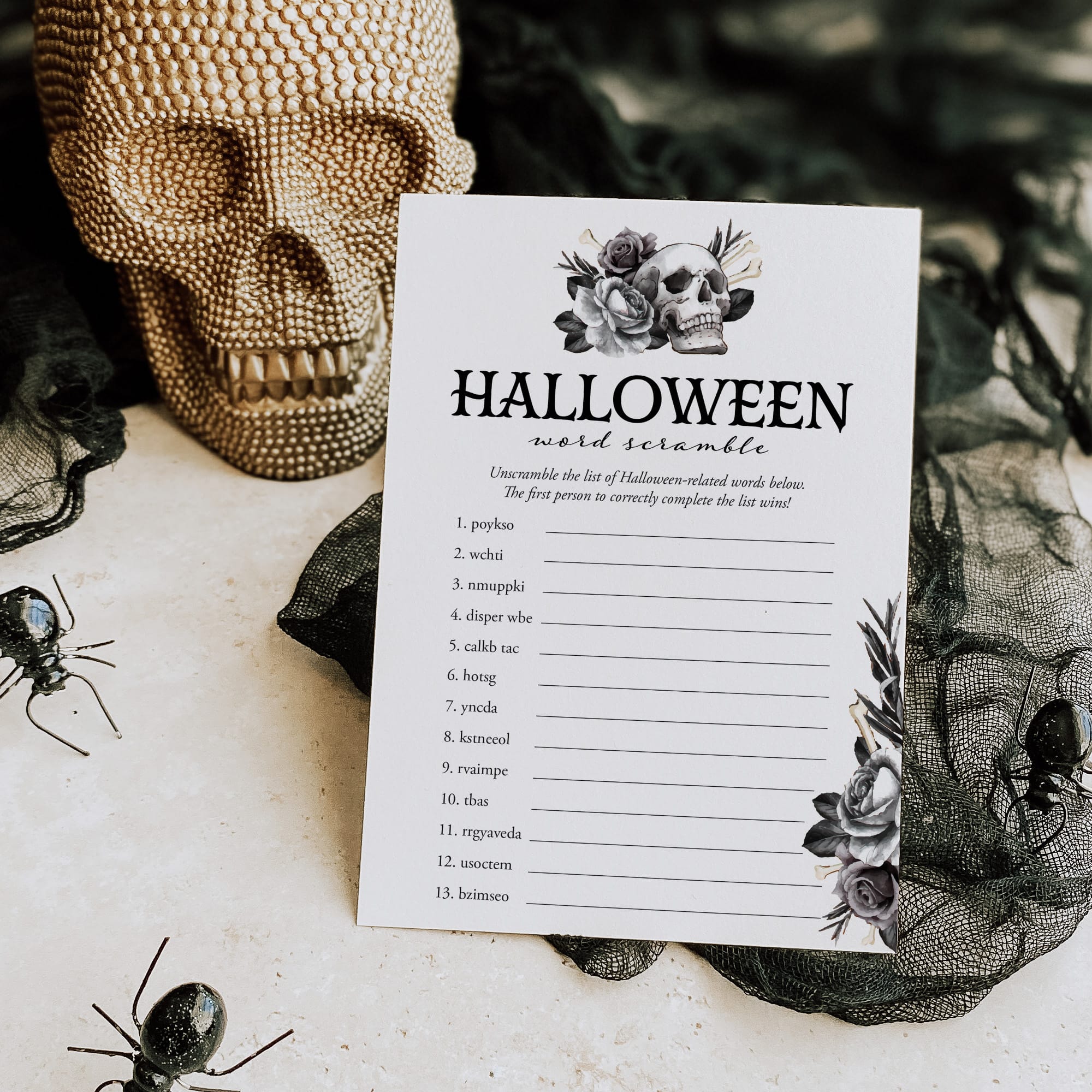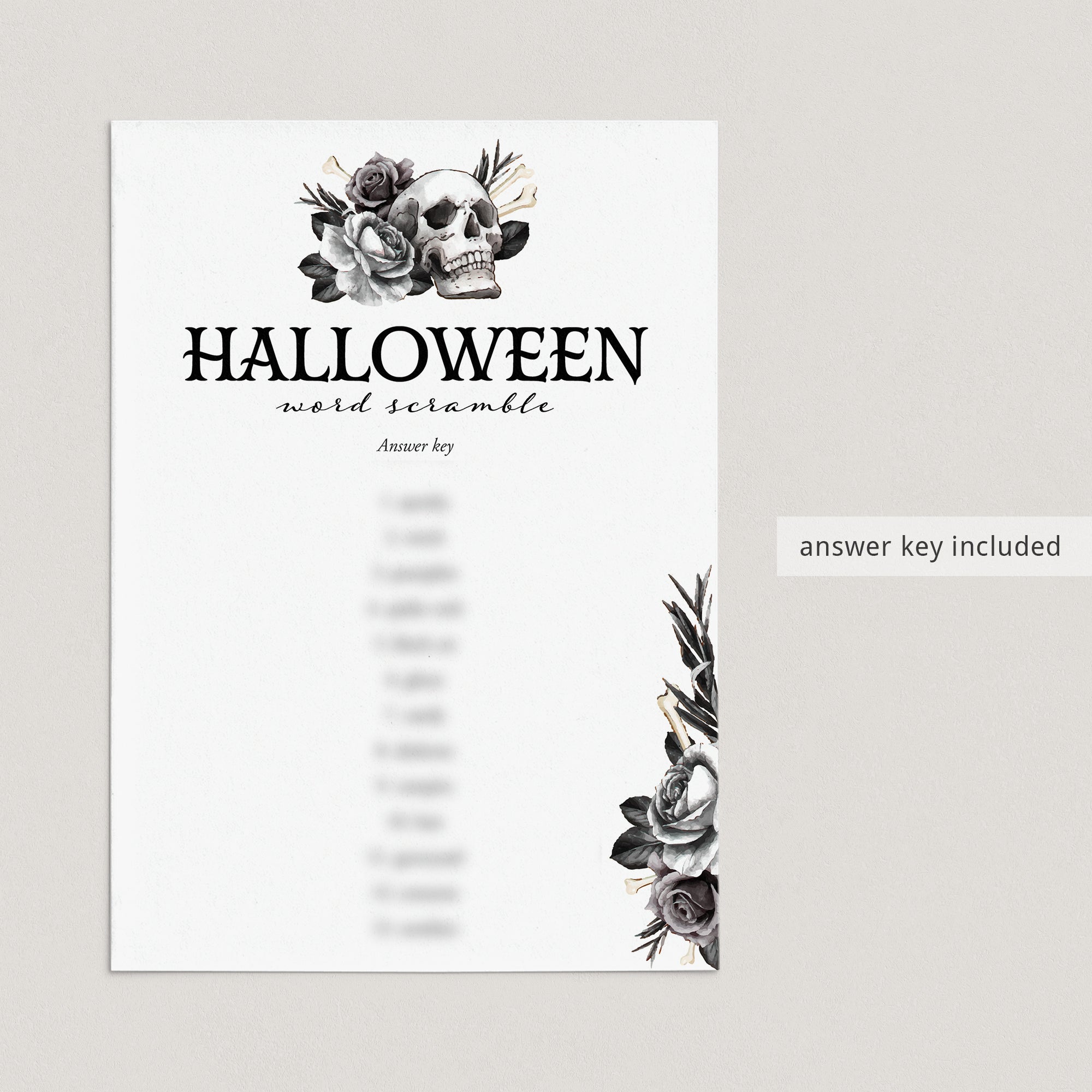 Words scramble games are so much fun! They are a great challenging activity for people of all ages. Add some fun to your Halloween party with this black floral Halloween Word Scramble game featuring 14 spooky and scary Halloween themed words to unscramble.