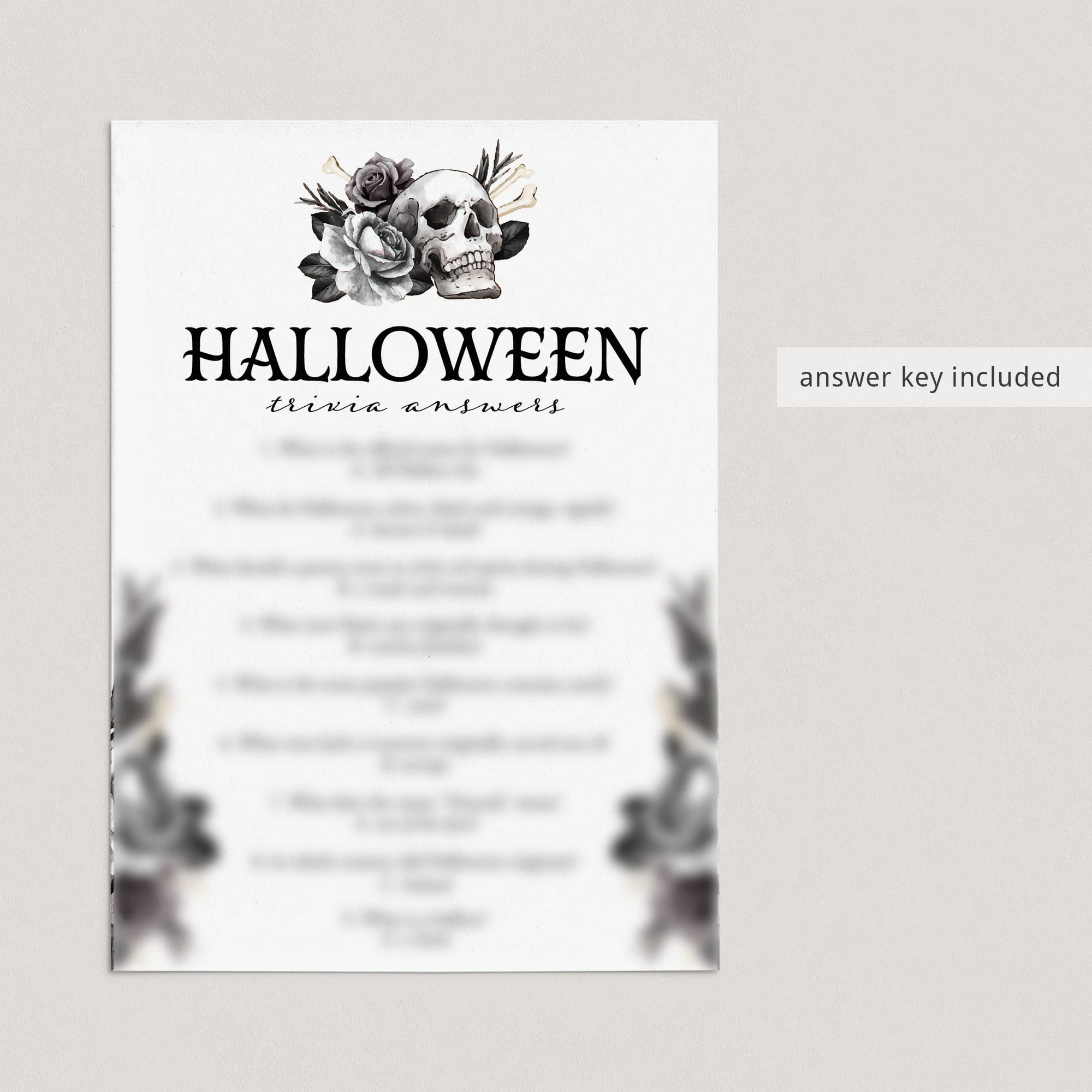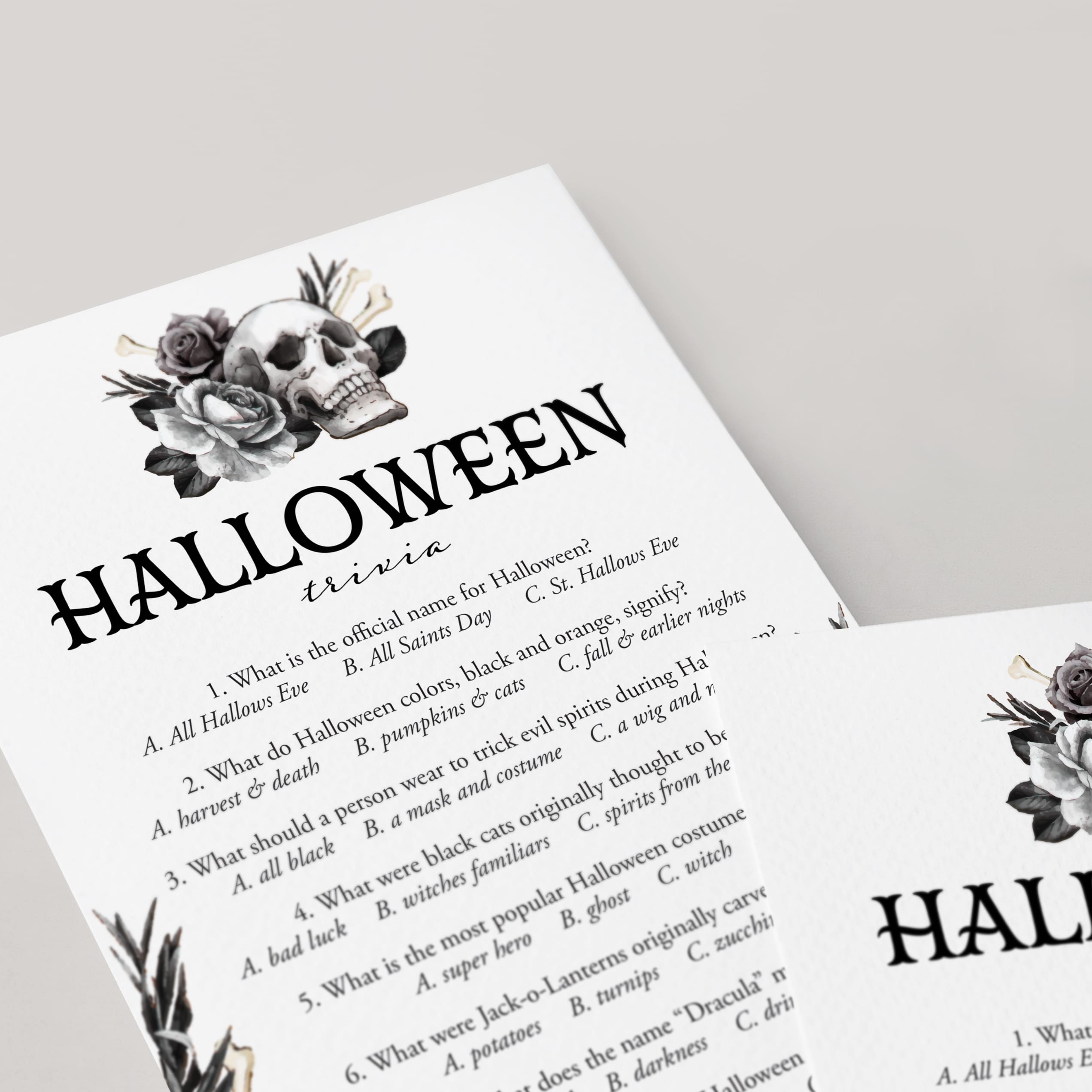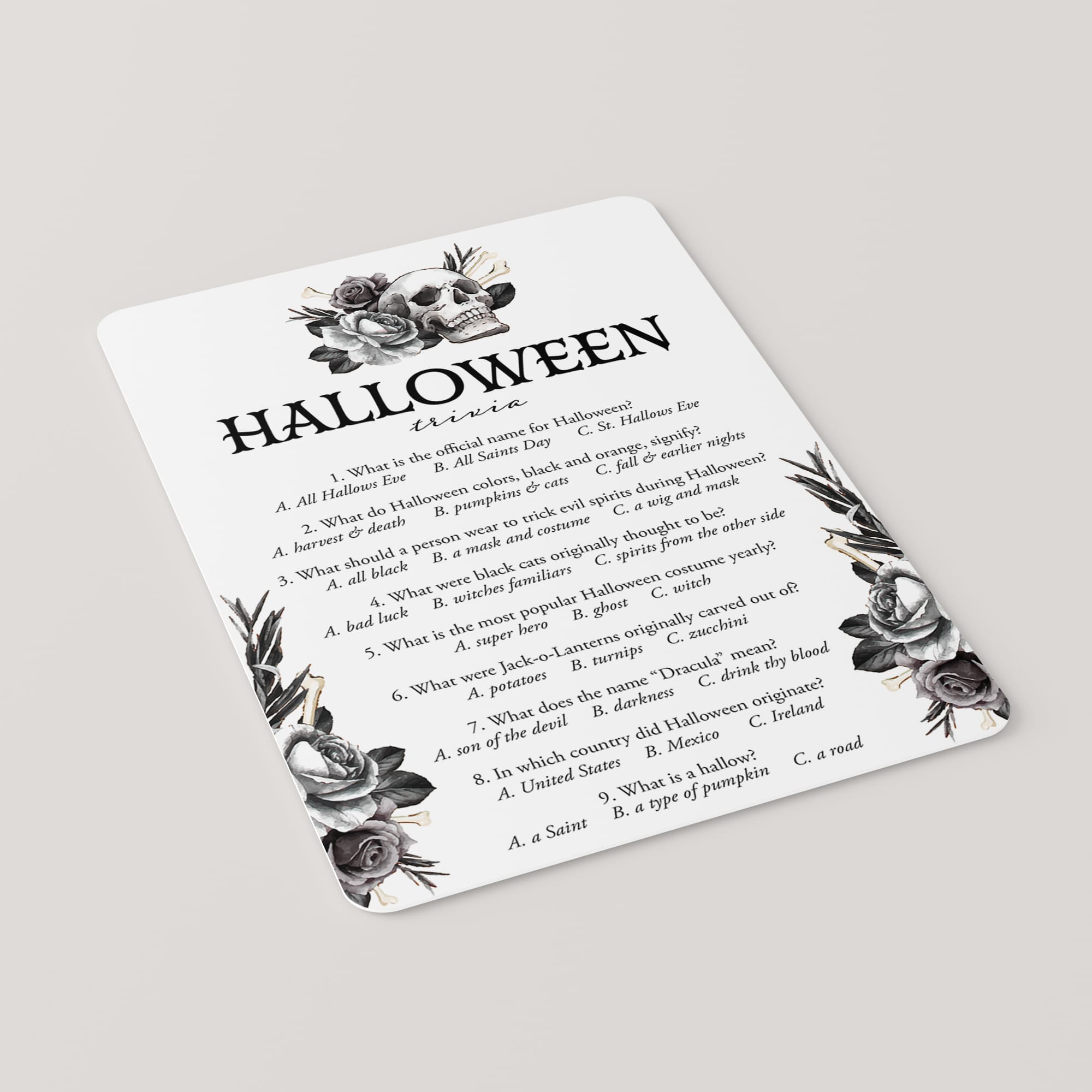 Are you hosting a Halloween party? Use this black floral Halloween Trivia Quiz to test your guests Halloween knowledge. What is the most popular Halloween costume? And what do the Halloween colors, orange and black, signify? Play this fun Halloween trivia game to find out! It’s a great challenging Halloween game to play at your Halloween office party or Halloween family night.