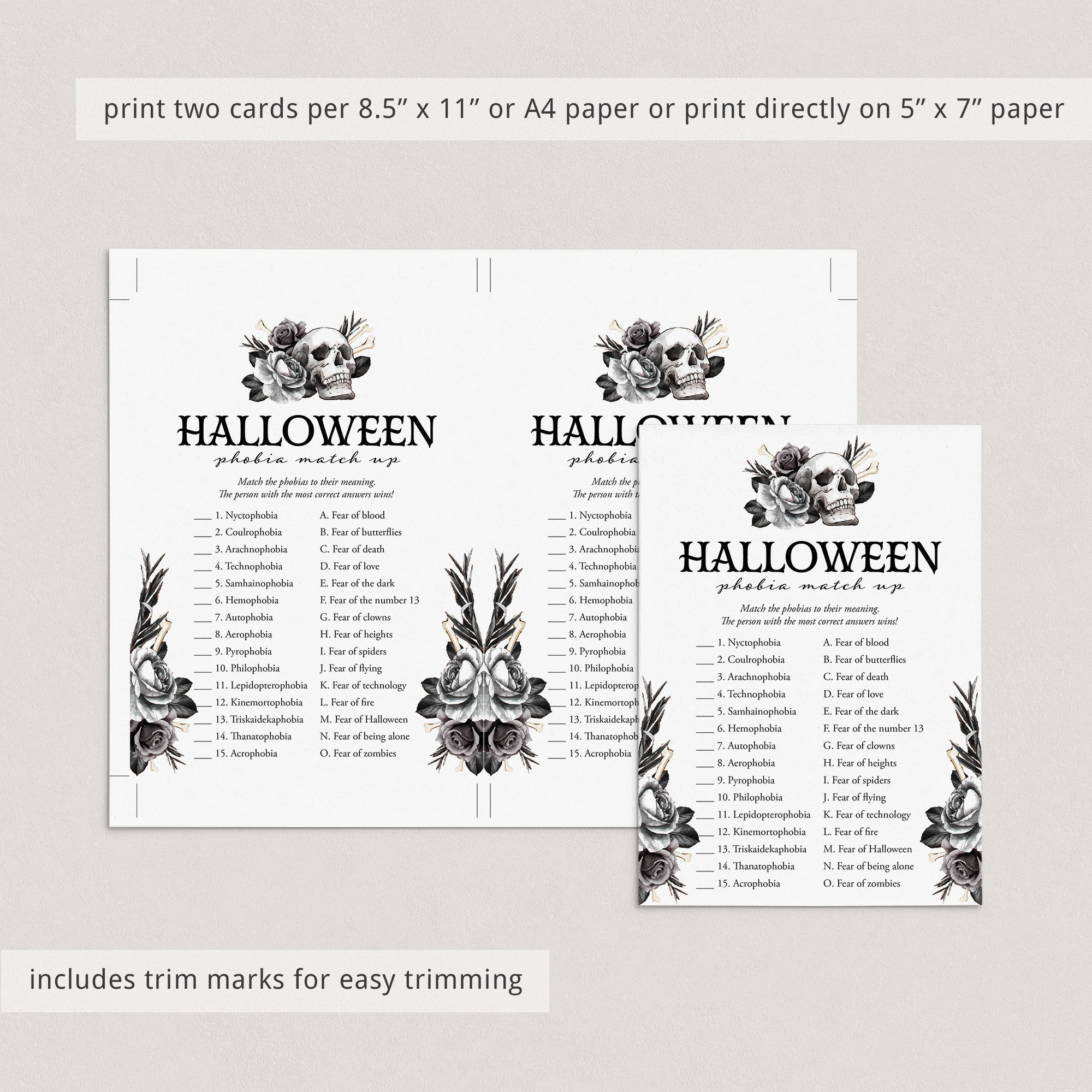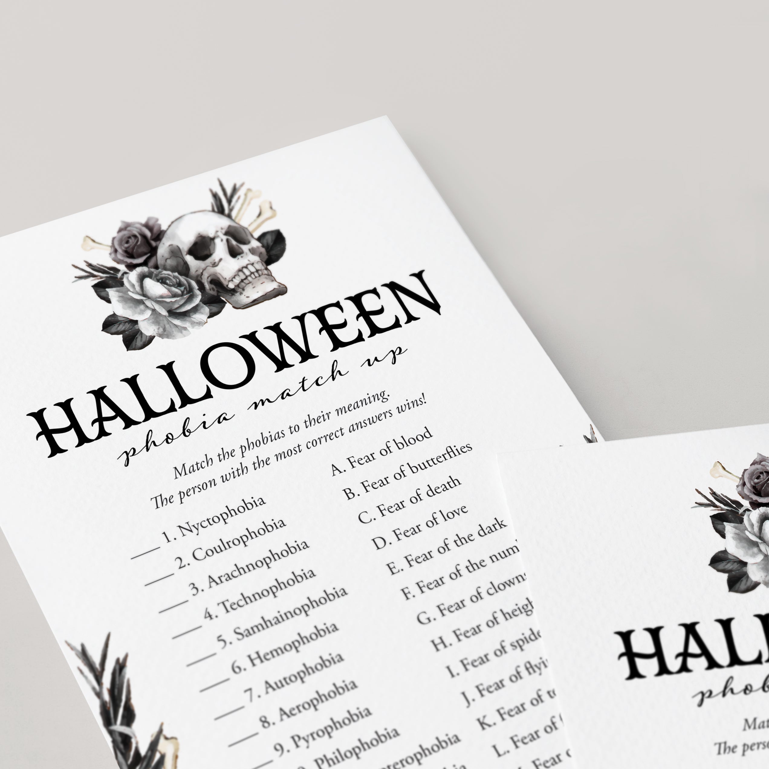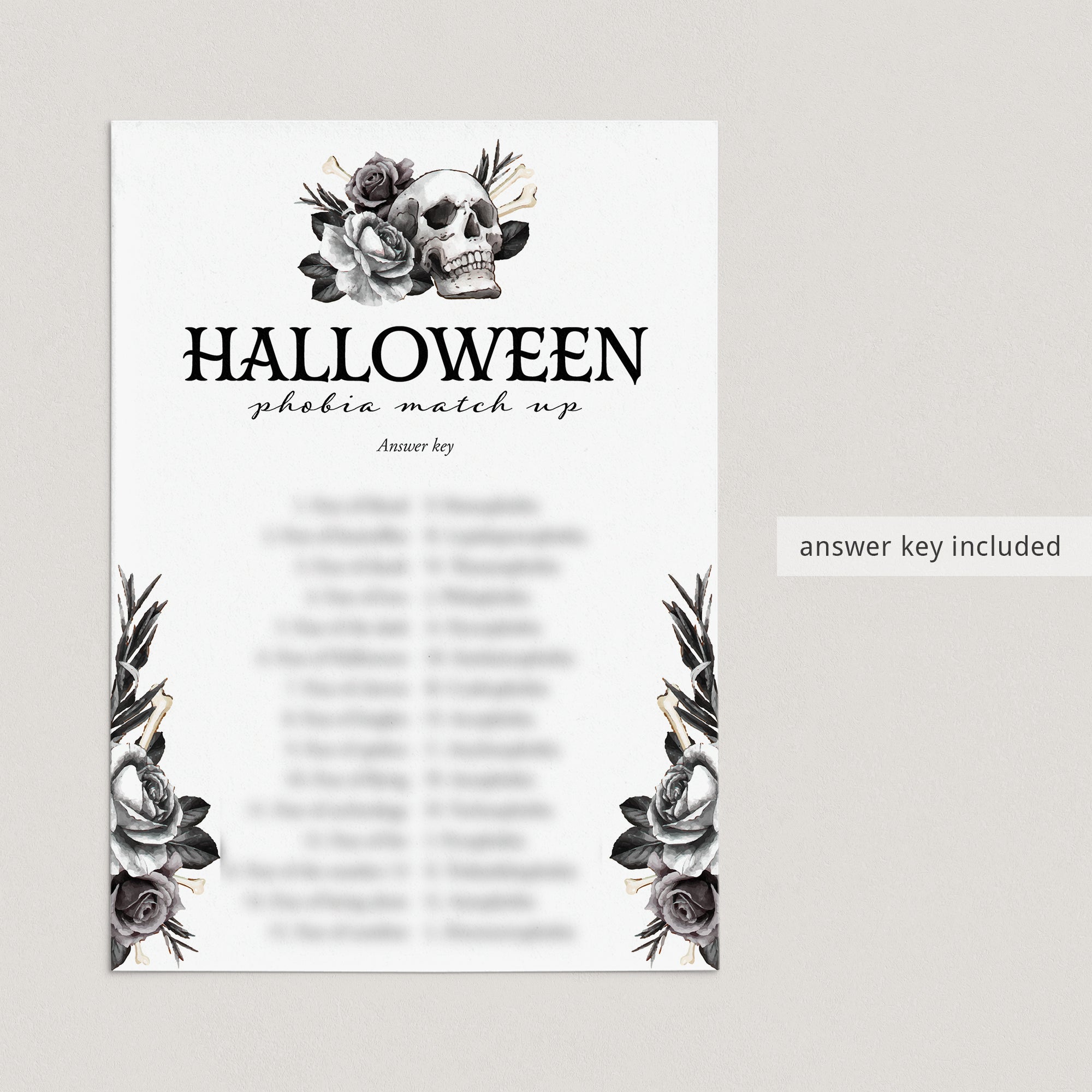 Are you looking for a fun game to play at your Halloween party? Play Phobia Match with this Skull Halloween game card. The black floral Halloween game will be the perfect addition to your adult Halloween bash.