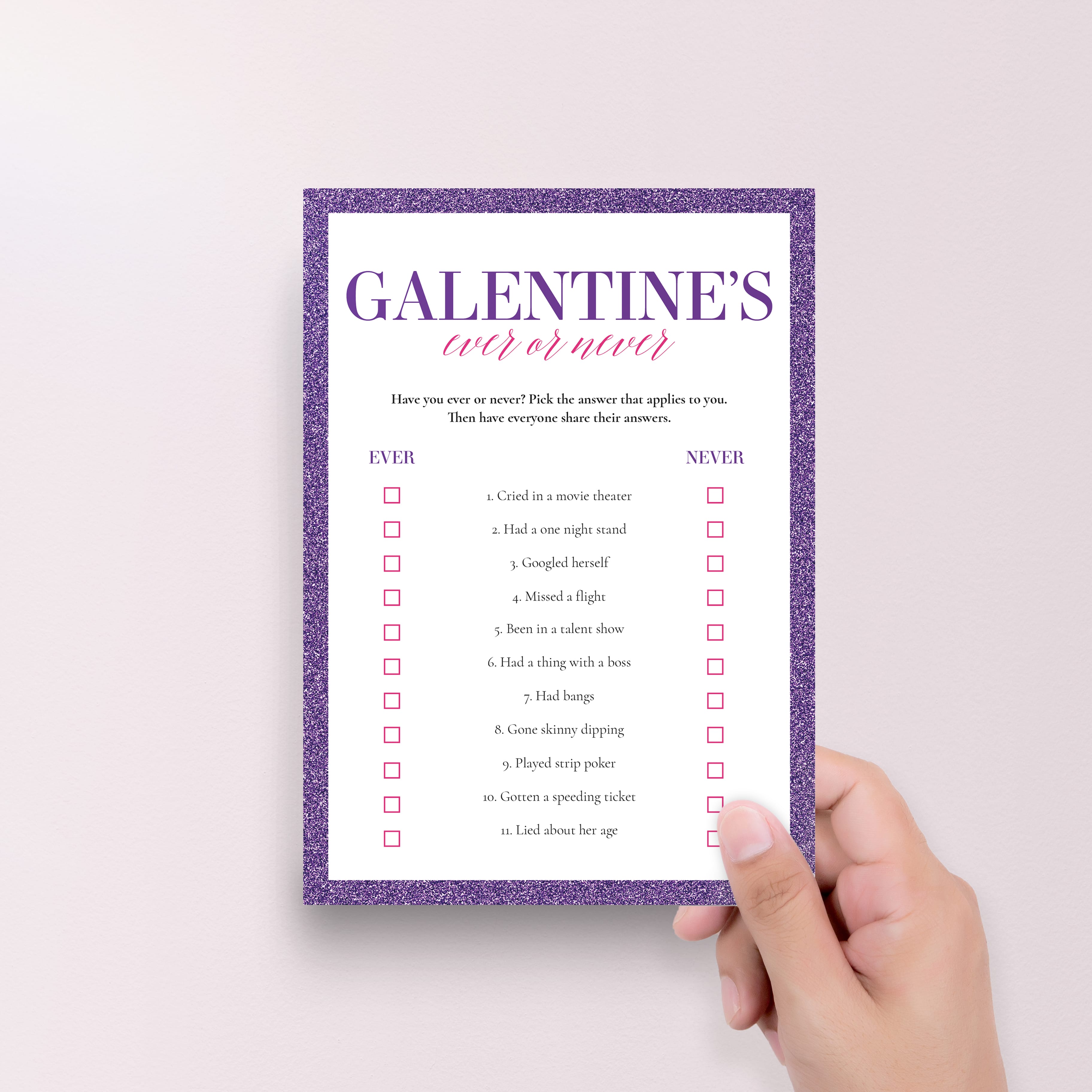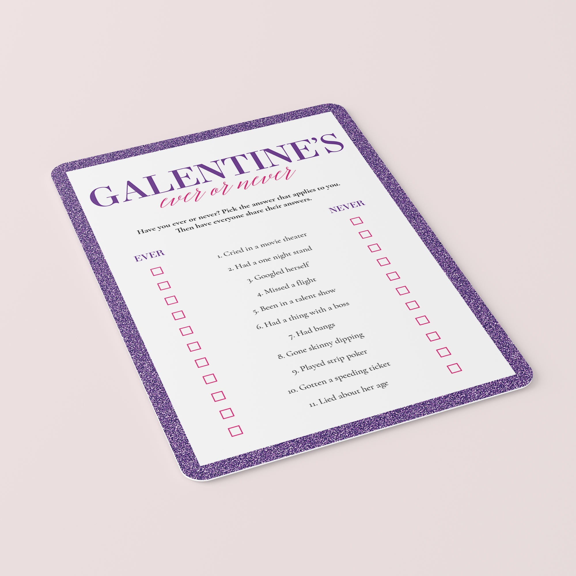Are you looking for a funny conversation starter for your Galentine's Day Party or Ladies Night? Play Ever or Never! Have your girls fill out this glittery Ever or Never game and then share answers. Have you ever drunk dialed an ex? Or peed in a public pool? This game will be a great icebreaker that guarantees lots of laughter.