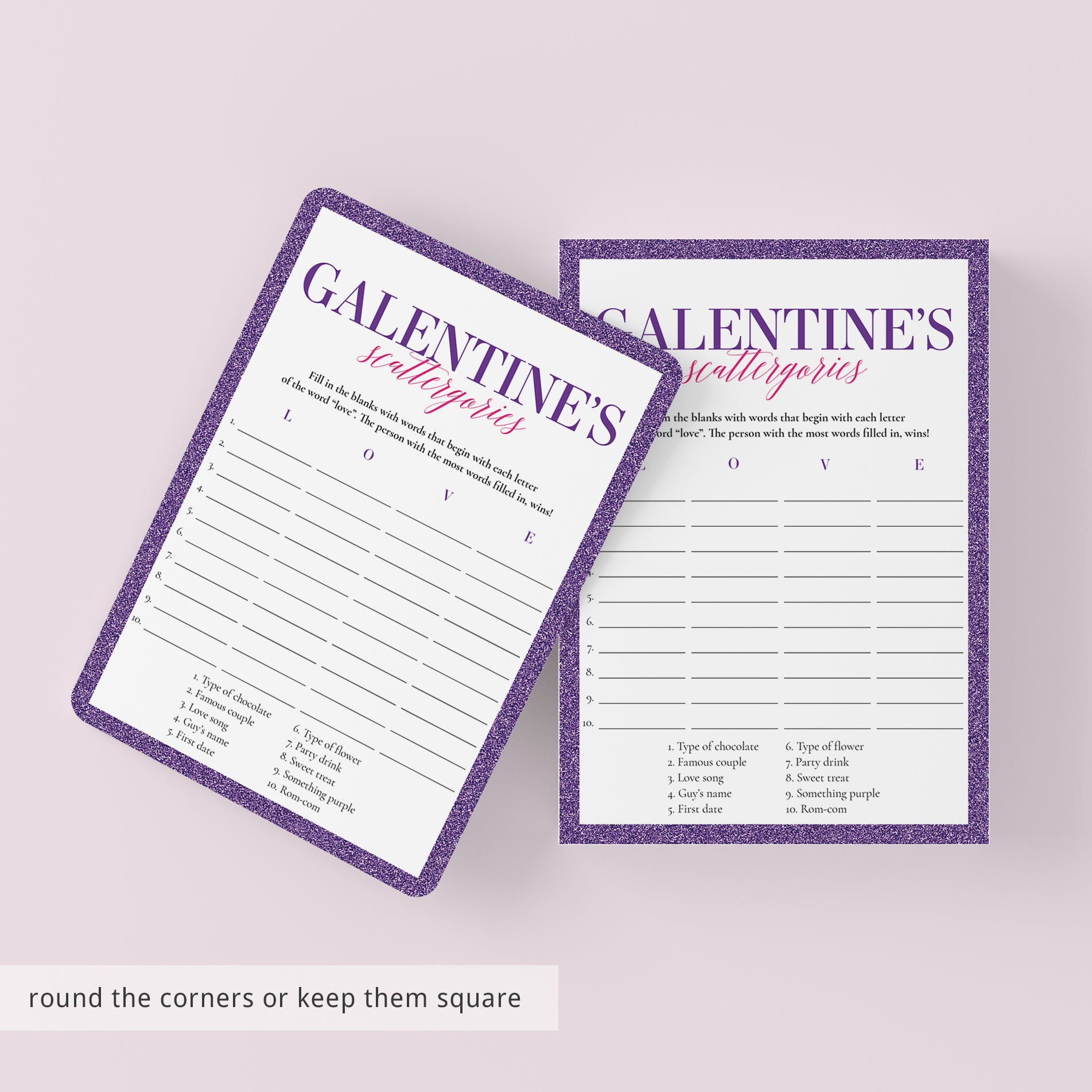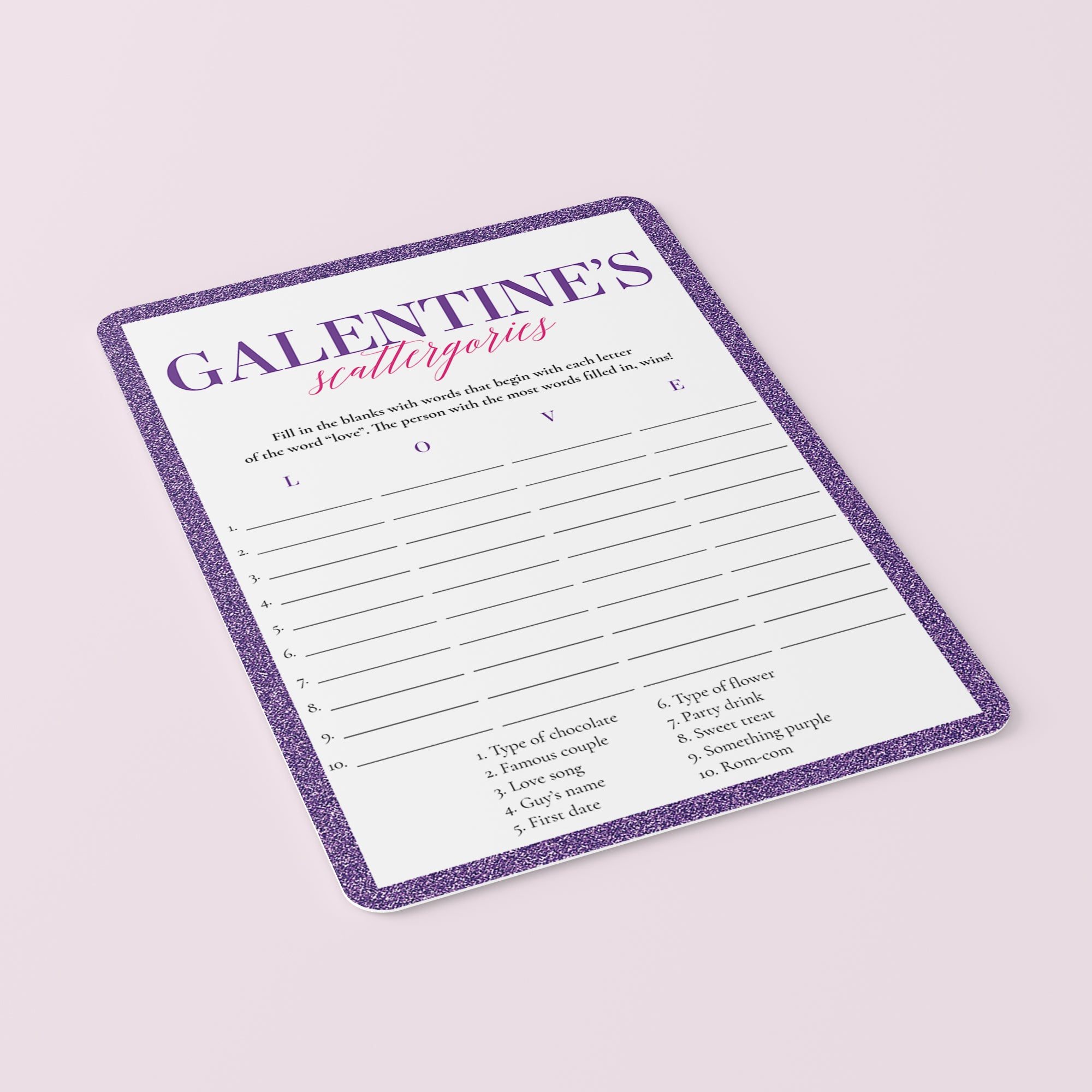 The game is very easy to play. Simply hand out or send this purple glittery Scattergories game card to your girlfriends. They will have to come up with as many words related to the categories at the bottom of the sheet. The difficulty is that the words must begin with the letters in the word "LOVE". The girl that gets the most answers filled in within the set time, wins!