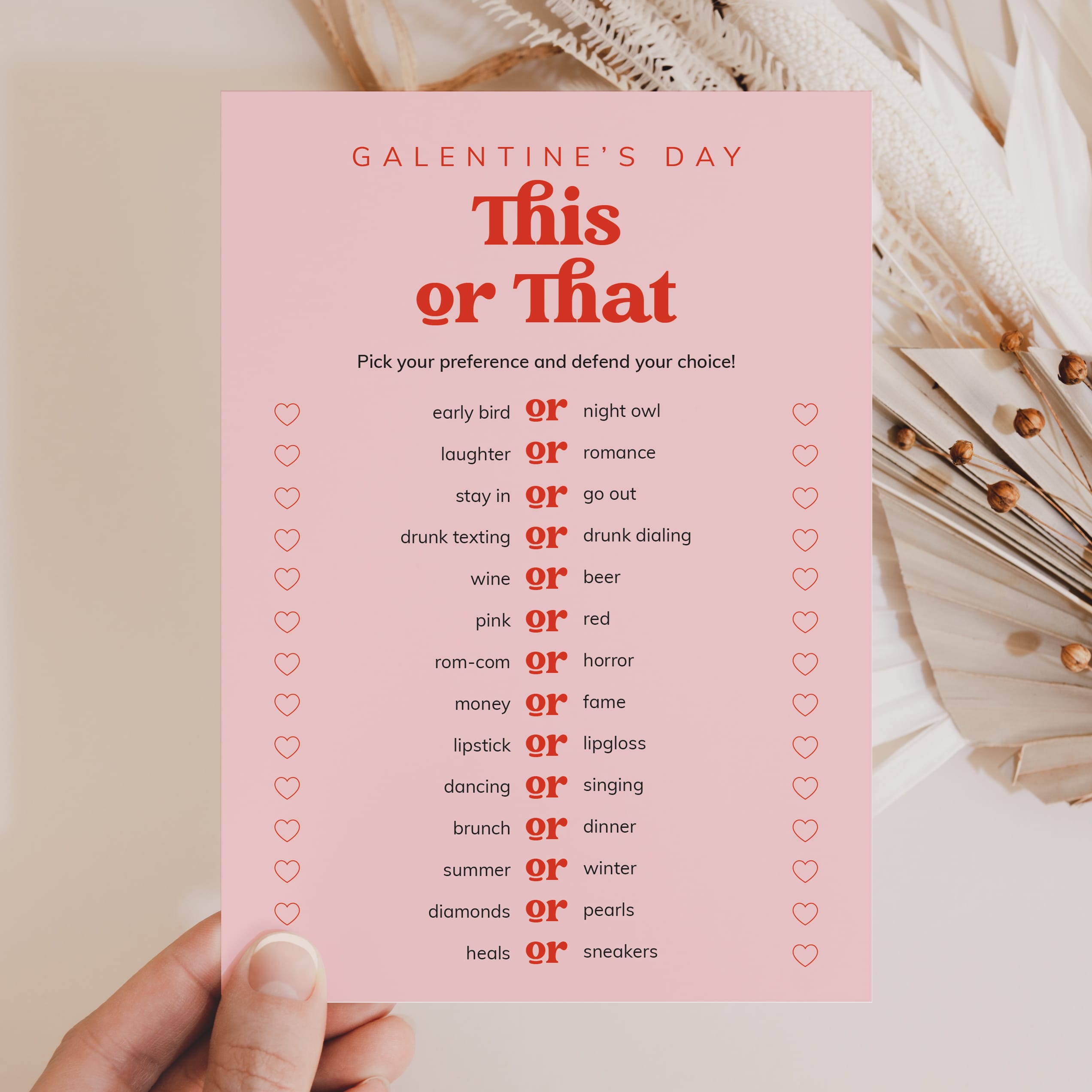 Are you looking for a fun icebreaker game for your Galentines party? Play This or That. It's is a great conversation starter. This vibrant game, featuring a soft pink background paired with a bold retro red font for a playful look, has 13 This or That questions. Have all the girls pick their preferences and defend their choice.