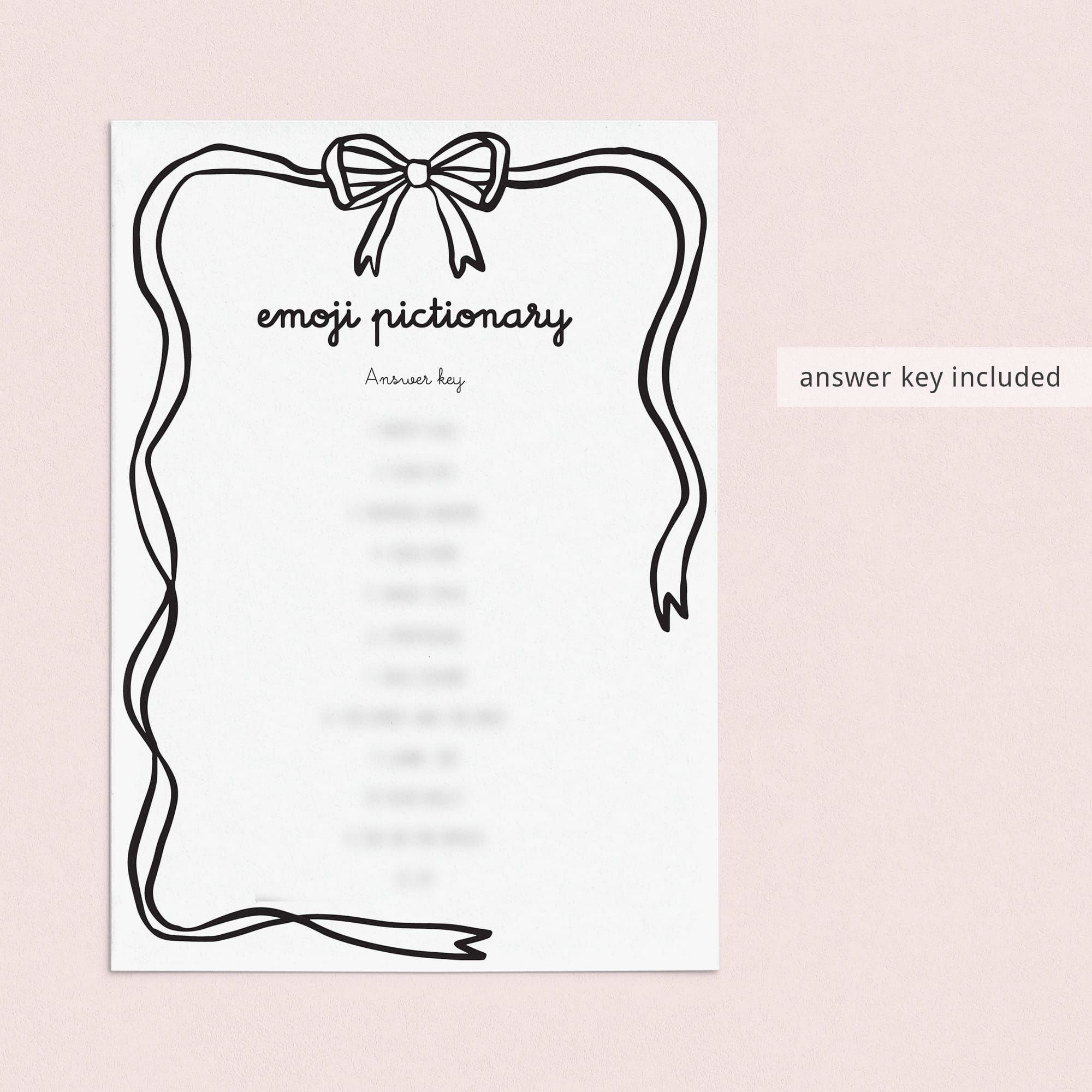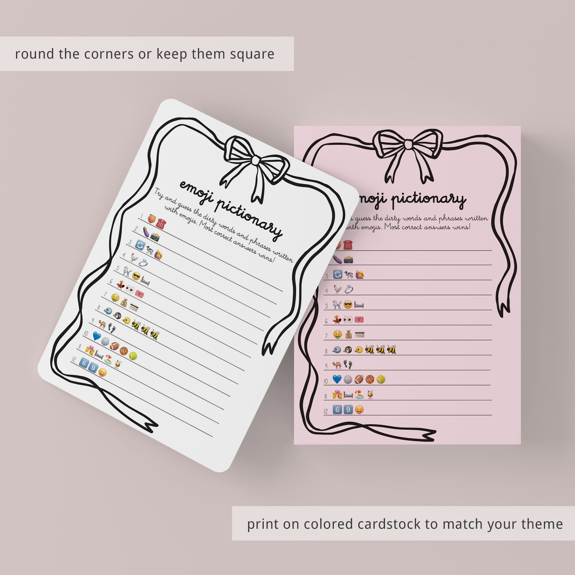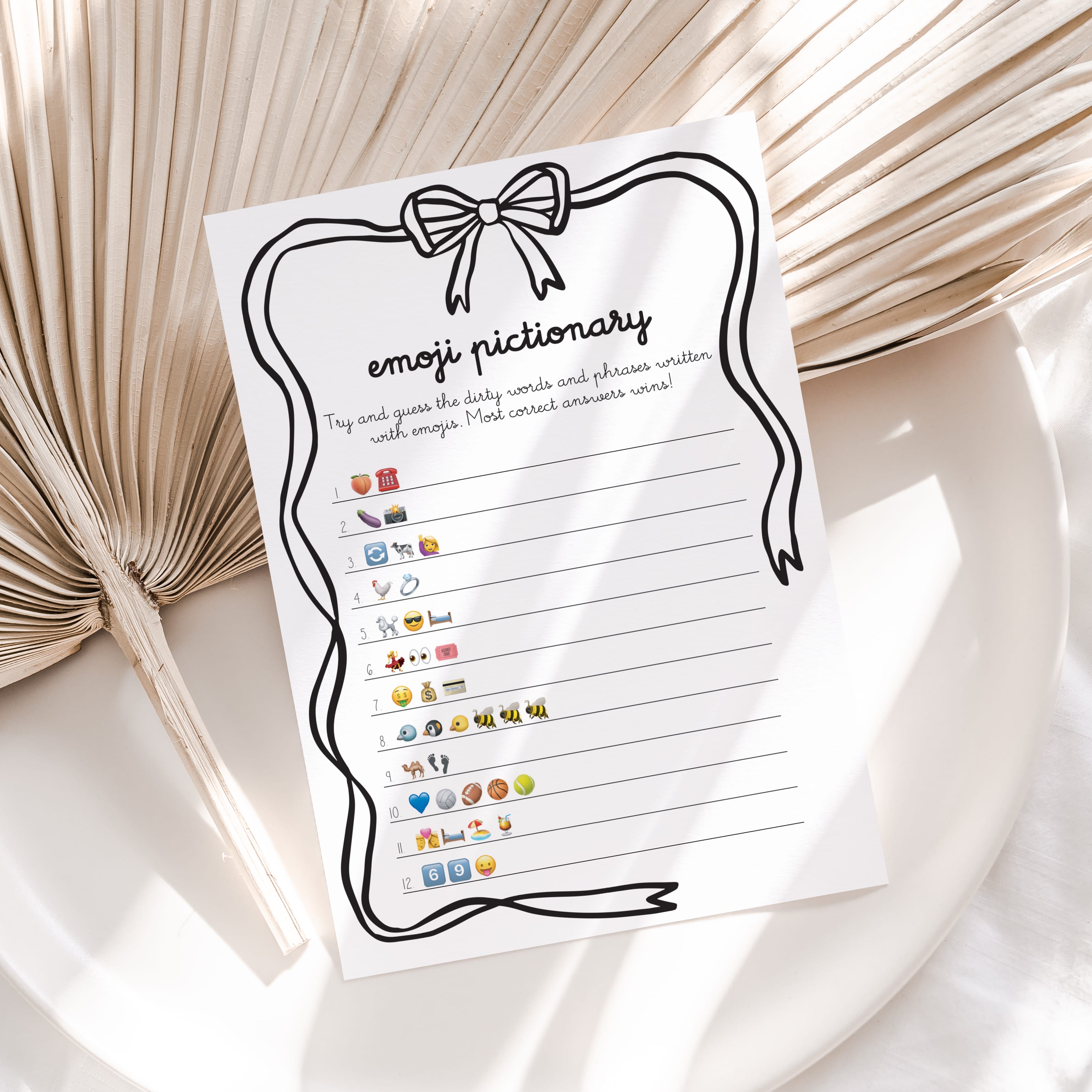 Are you looking for a unique and hilarious game to play with your girlfriends? Play Dirty Emoji Pictionary with this cute Emoji Pictionary game card, featuring a playful wavy border topped with a sweet black bow. It is the perfect addition to your Bachelorette Party, Hen Night, Bridal Shower or Ladies Night. You'll have your girls laughing in no time.