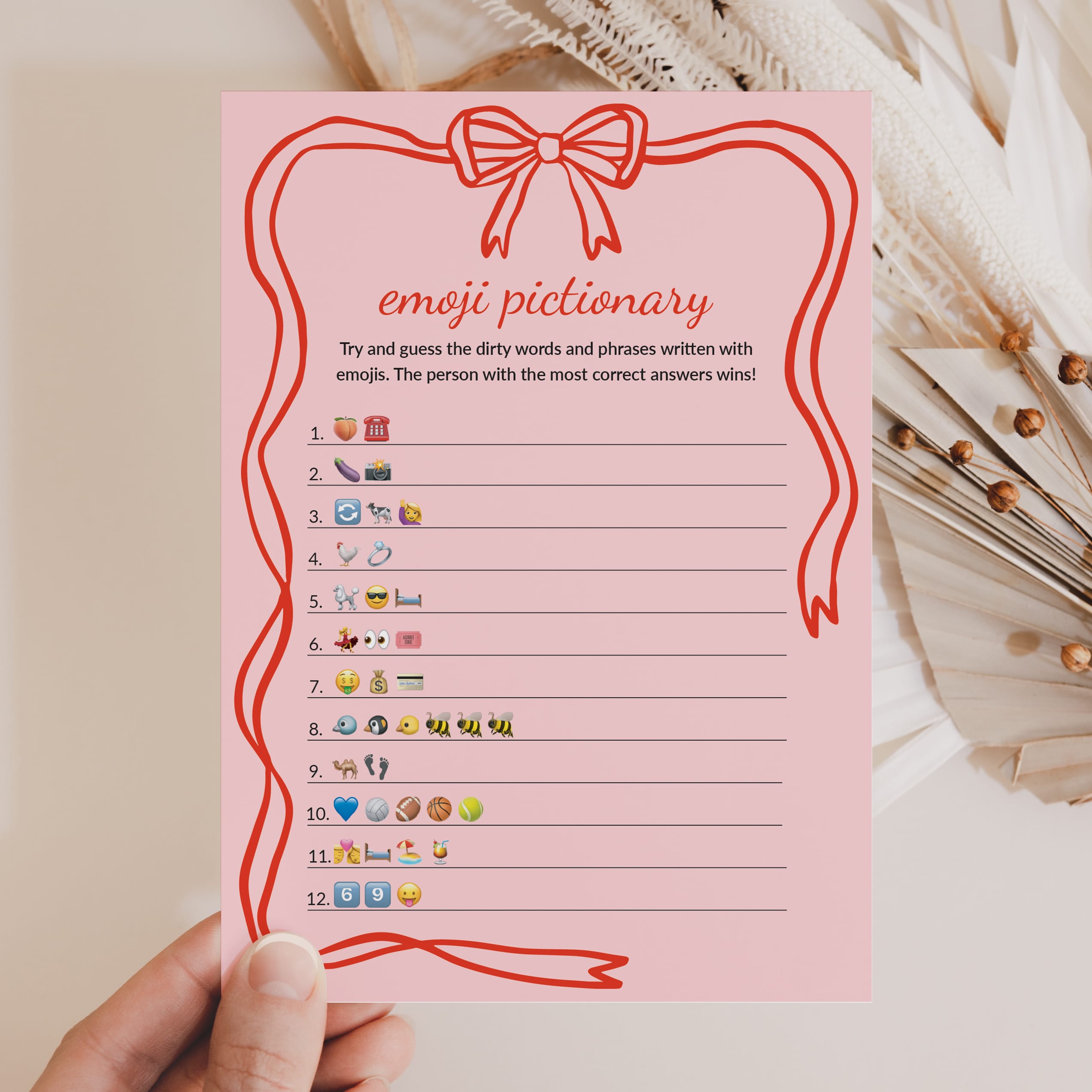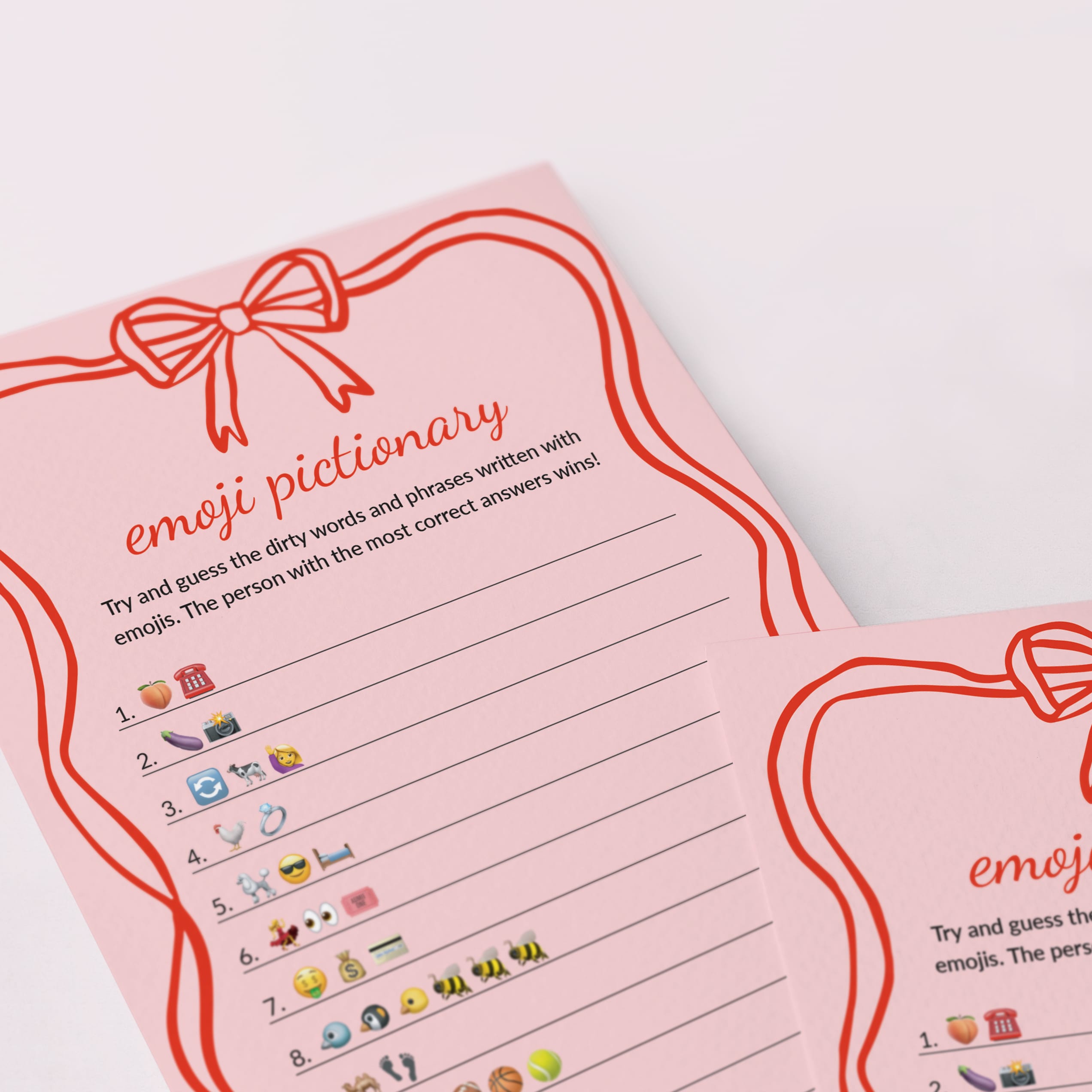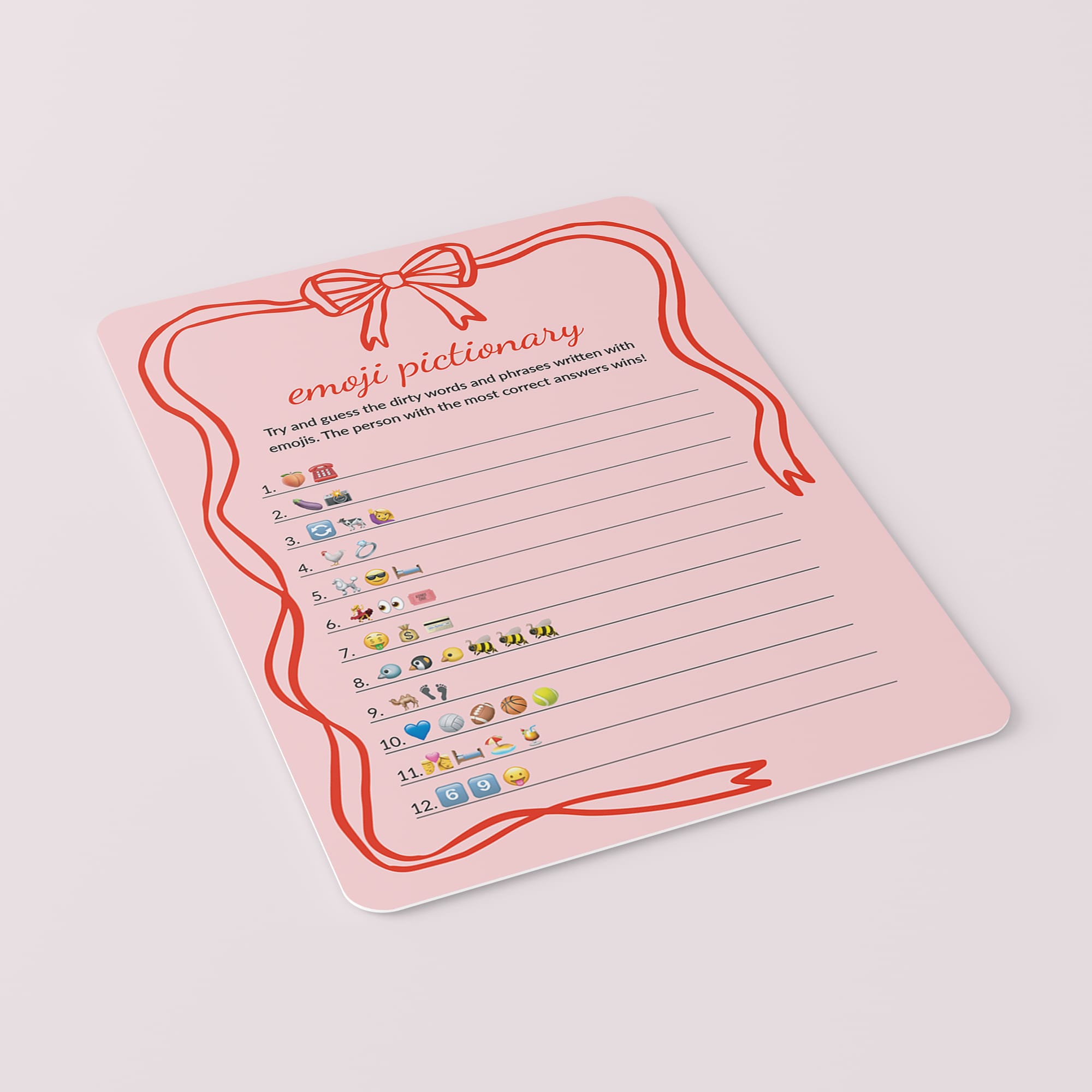 Are you looking for a unique game to play with your girlfriends? Play Dirty Emoji Pictionary with this cute Emoji Pictionary game card, featuring a playful pink background, red text, and a cute wavy ribbon border topped with a bow. It is a hilarious addition to your Bachelorette Party, Hen Night, Bridal Shower or Girl's Night. You'll have your girls laughing in no time.