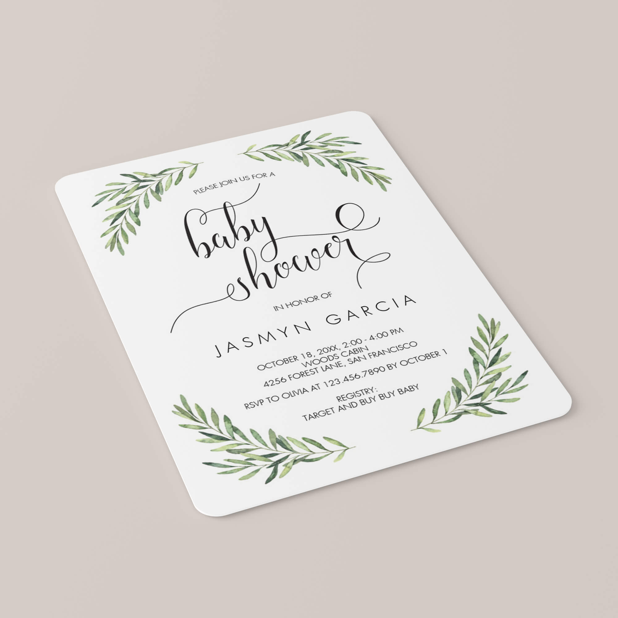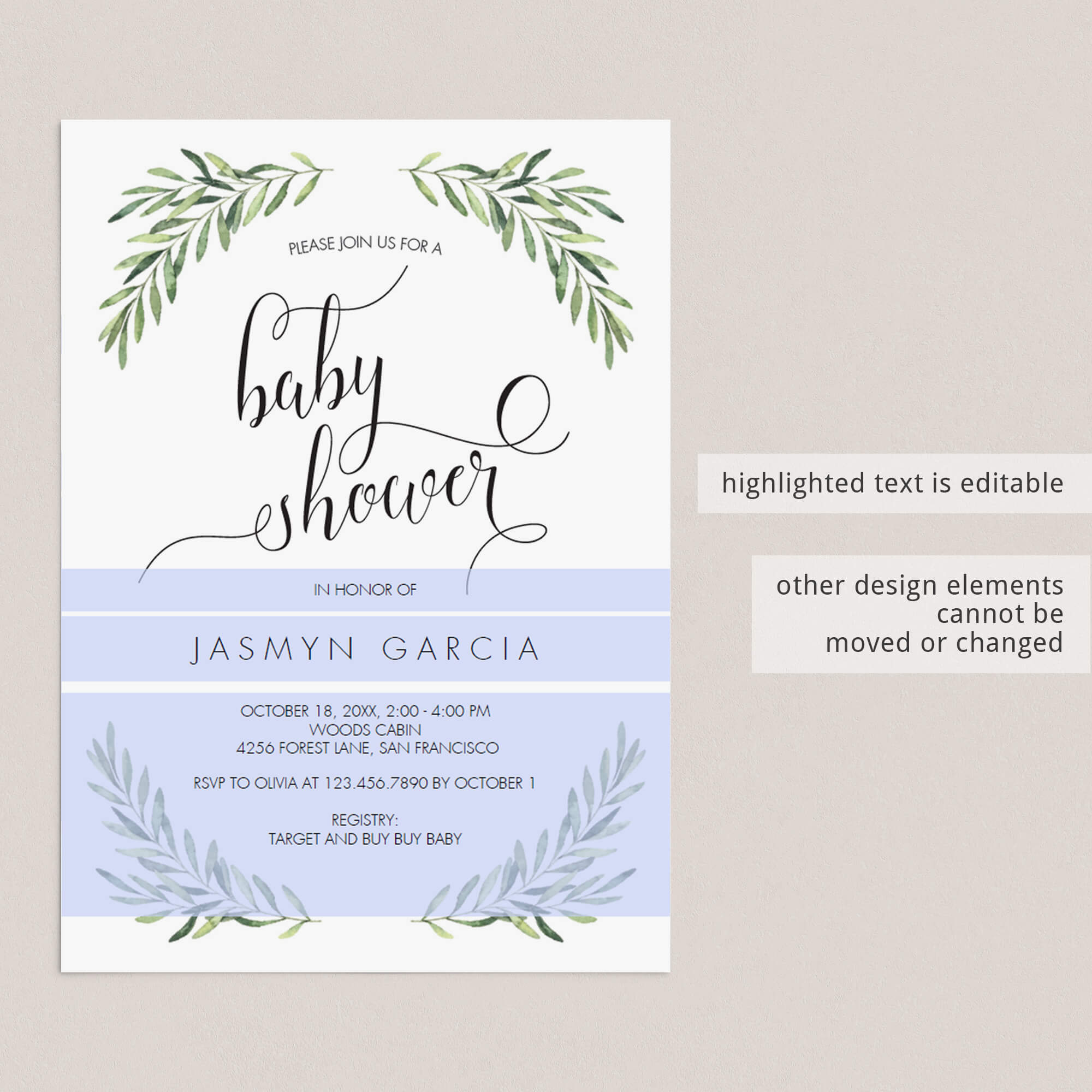 Your guests will be delighted when they receive this sophisticated gender neutral baby shower invitation with green olive branches. The classic and elegant calligraphy invite is perfect for any greenery themed baby shower.